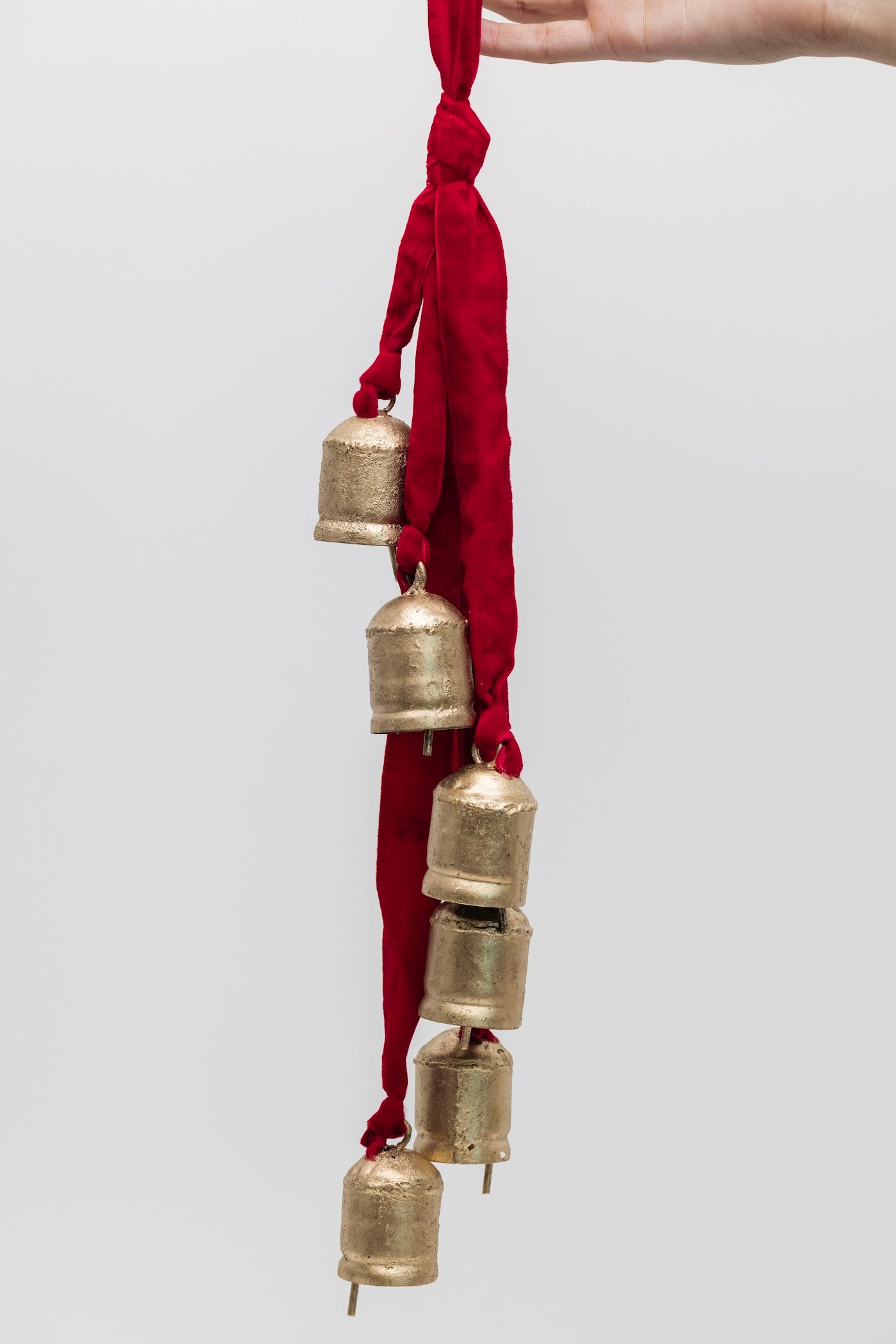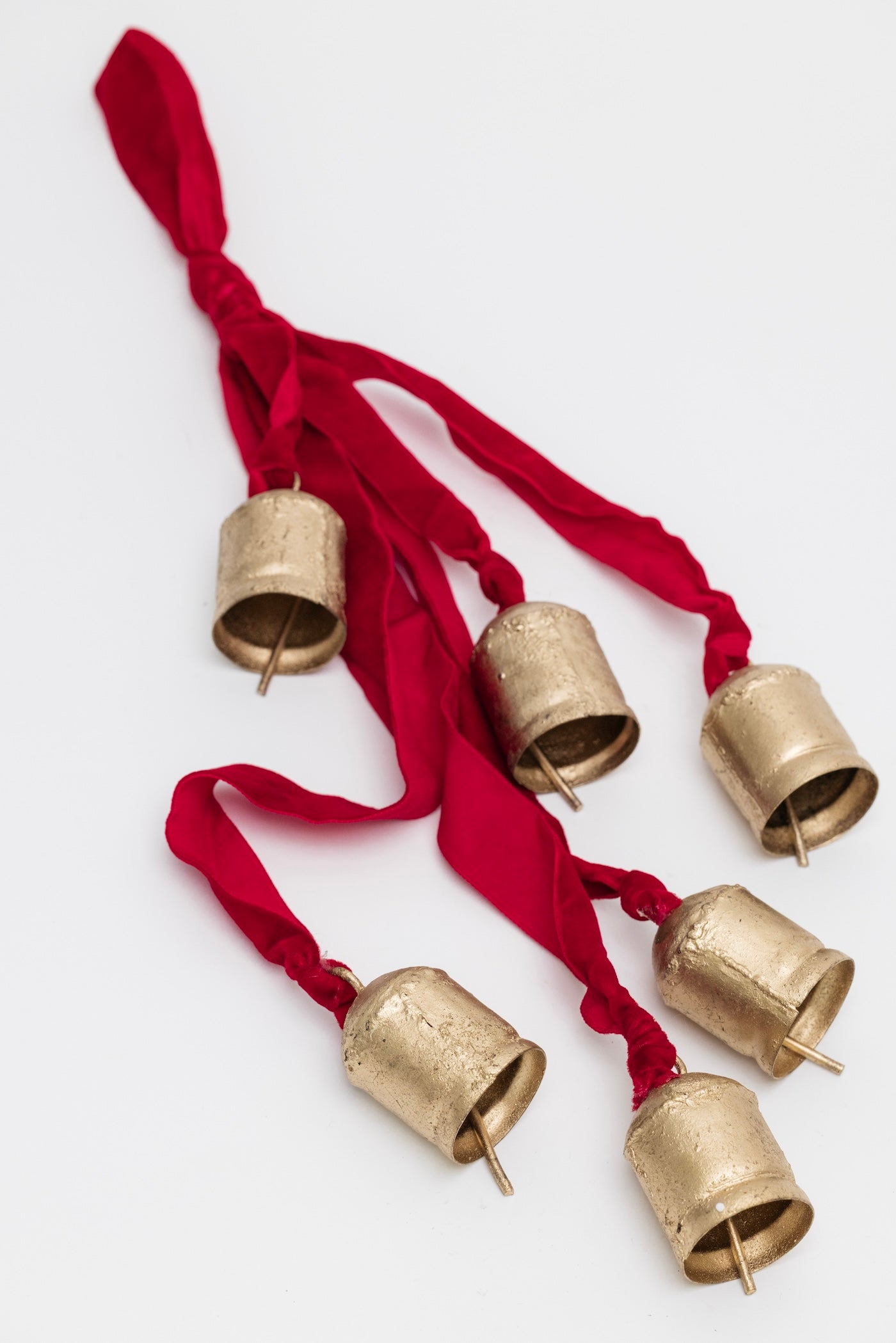 The Cluster of Bells on Velvet Ribbon - Red are the perfect addition to add a classic spin on your styling! Place atop a book stack for a look that will stay relevant throughout the seasons, or place them on a door handle or hanging from your tree for holiday-inspired feel.