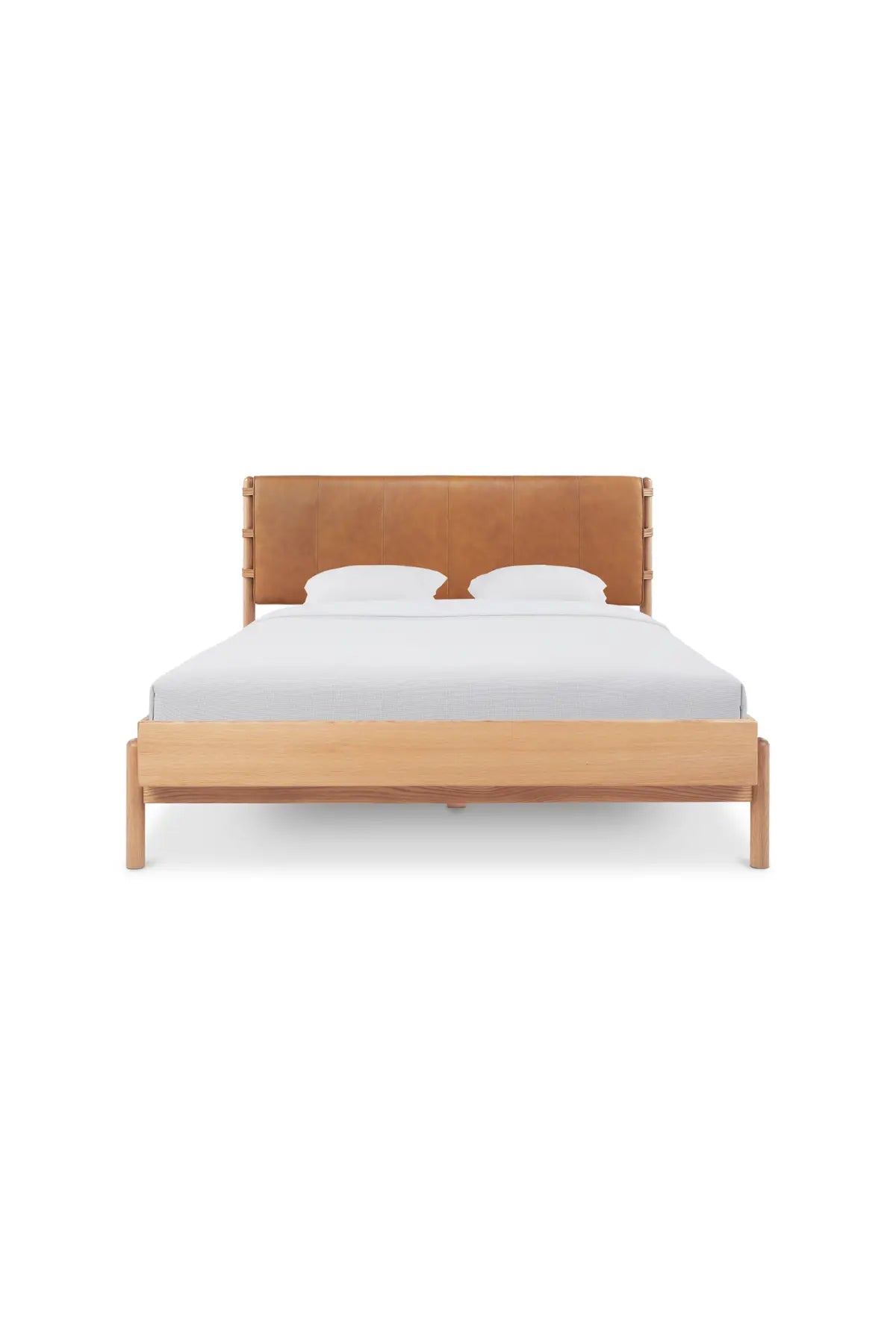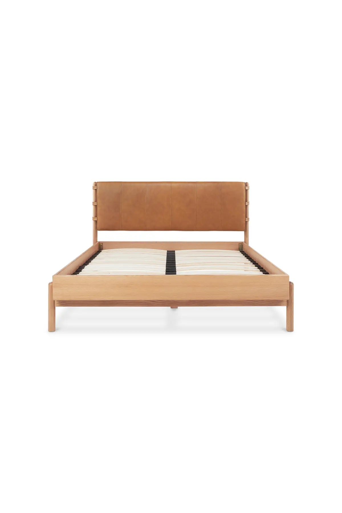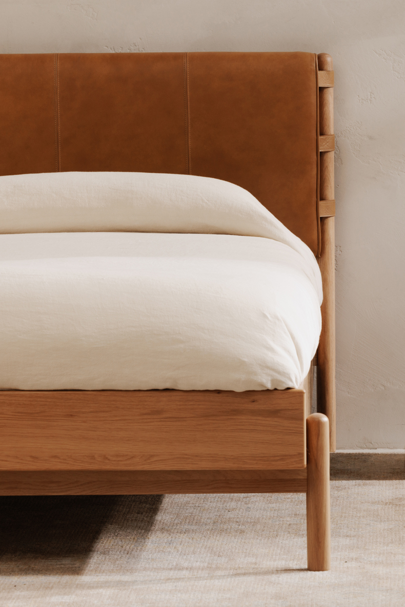 Crafted with a high-quality leather headboard and rounded solid oak legs, the Colby Bed elegantly brings understated luxury with superb craftsmanship. The soft curves of the leather headboard provide a sense of warmth and coziness, while the rounded legs add a touch of organic form to the overall design. The clean lines and natural materials create a harmonious and sophisticated piece, fitting seamlessly into any contemporary space. Slats included.