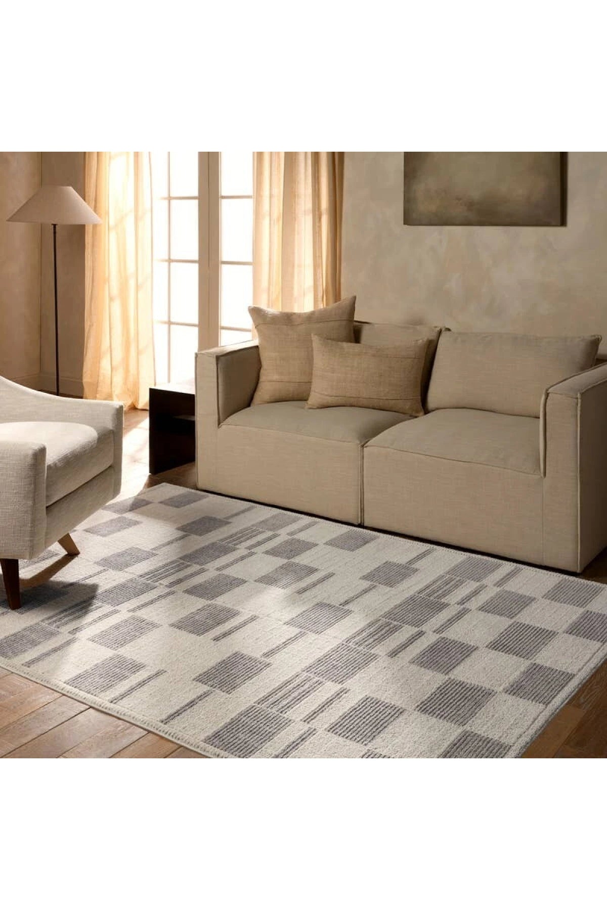 Make a modern statement. Composure's neutral gray hues and modern geometric tile pattern enhance the depth of any room. It's power loomed with a plush, high-low pile and velvety hand that soften high-traffic floors. Samples are modeled at our North Scottsdale/Phoenix location.