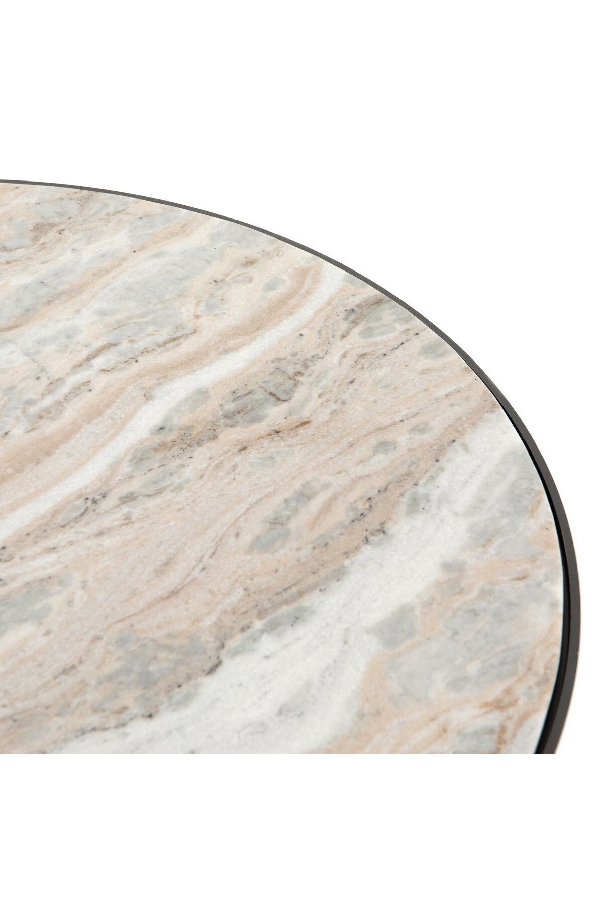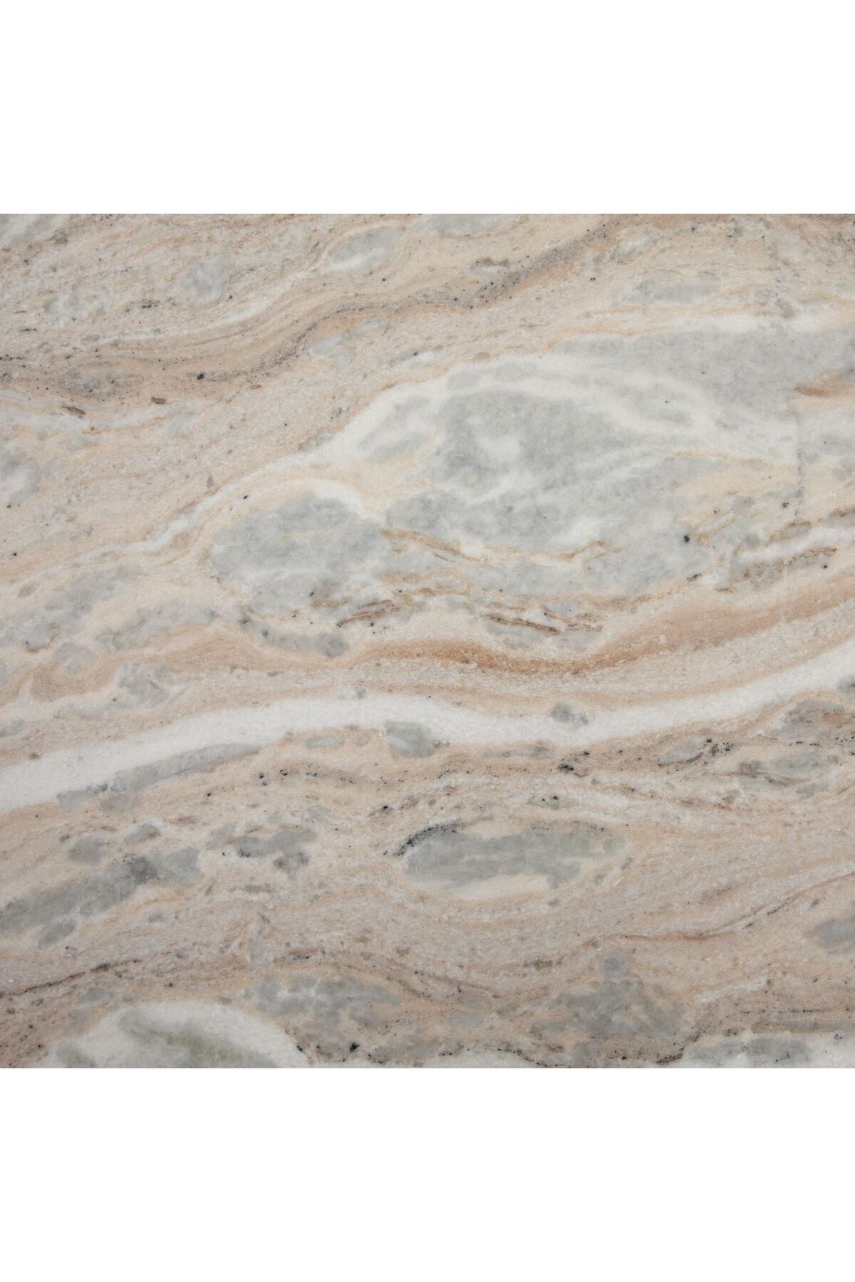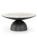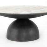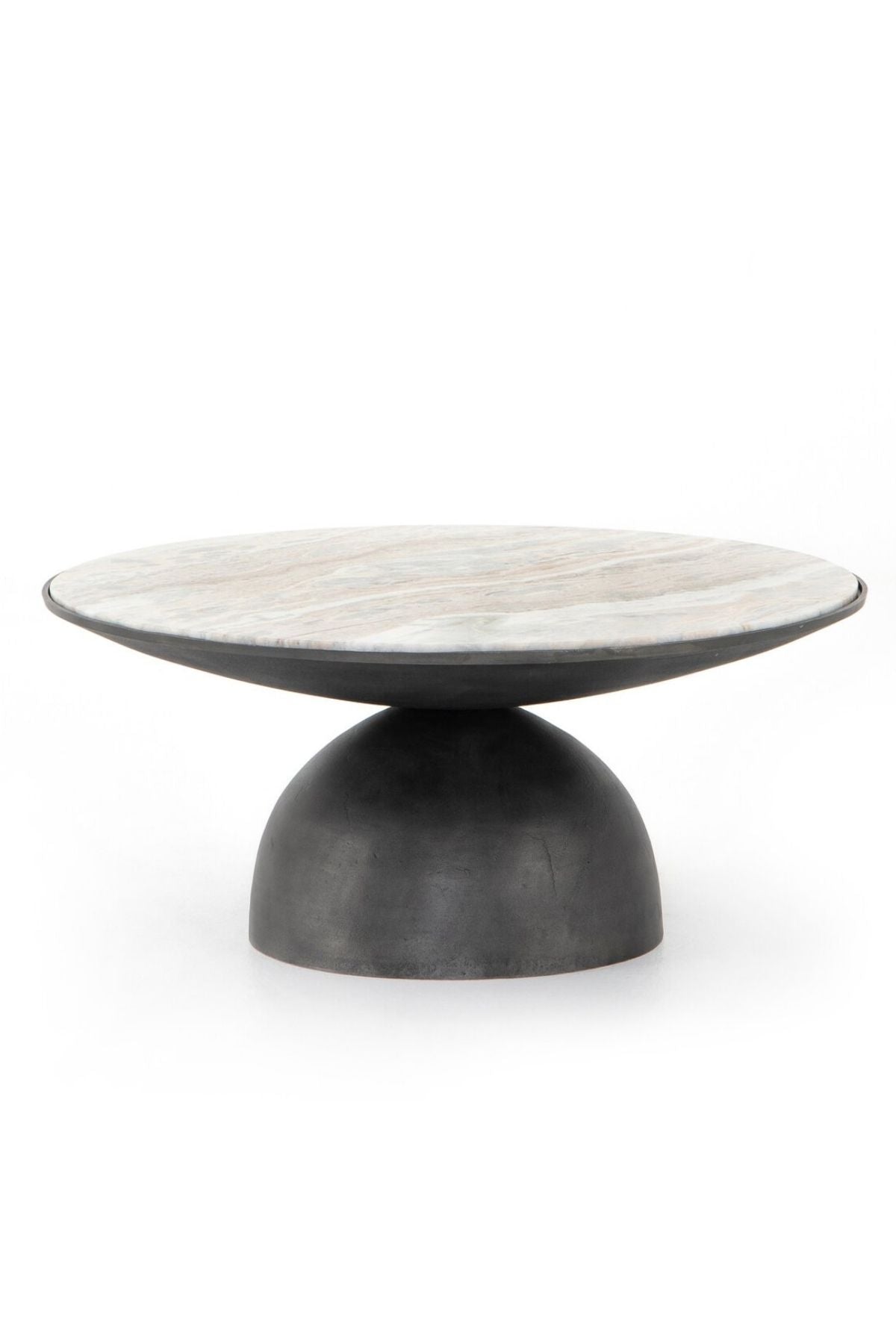 The Corbett Coffee Table is a sculptural play on shape. Hammered grey-finished aluminum base supports a grand, rounded tabletop of creamy taupe marble with beautiful natural veining.