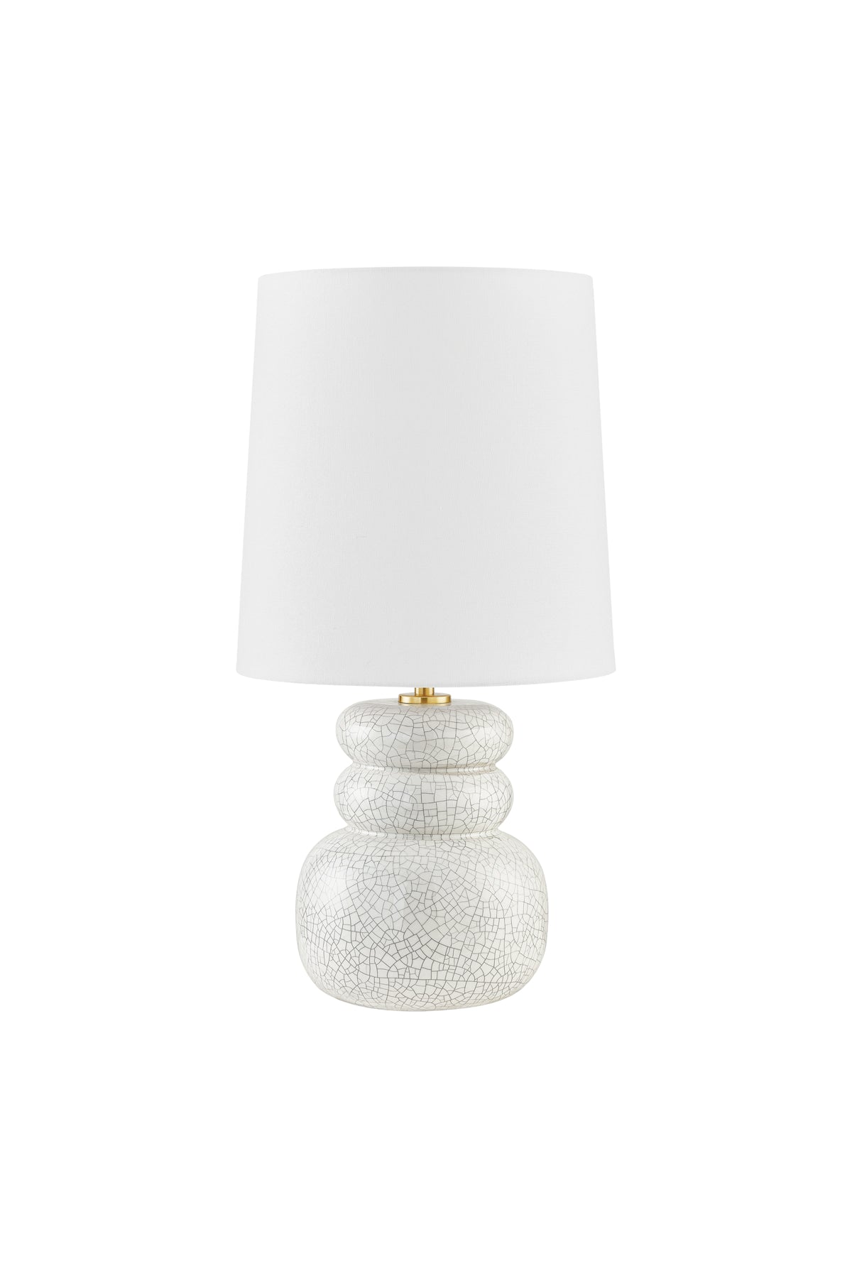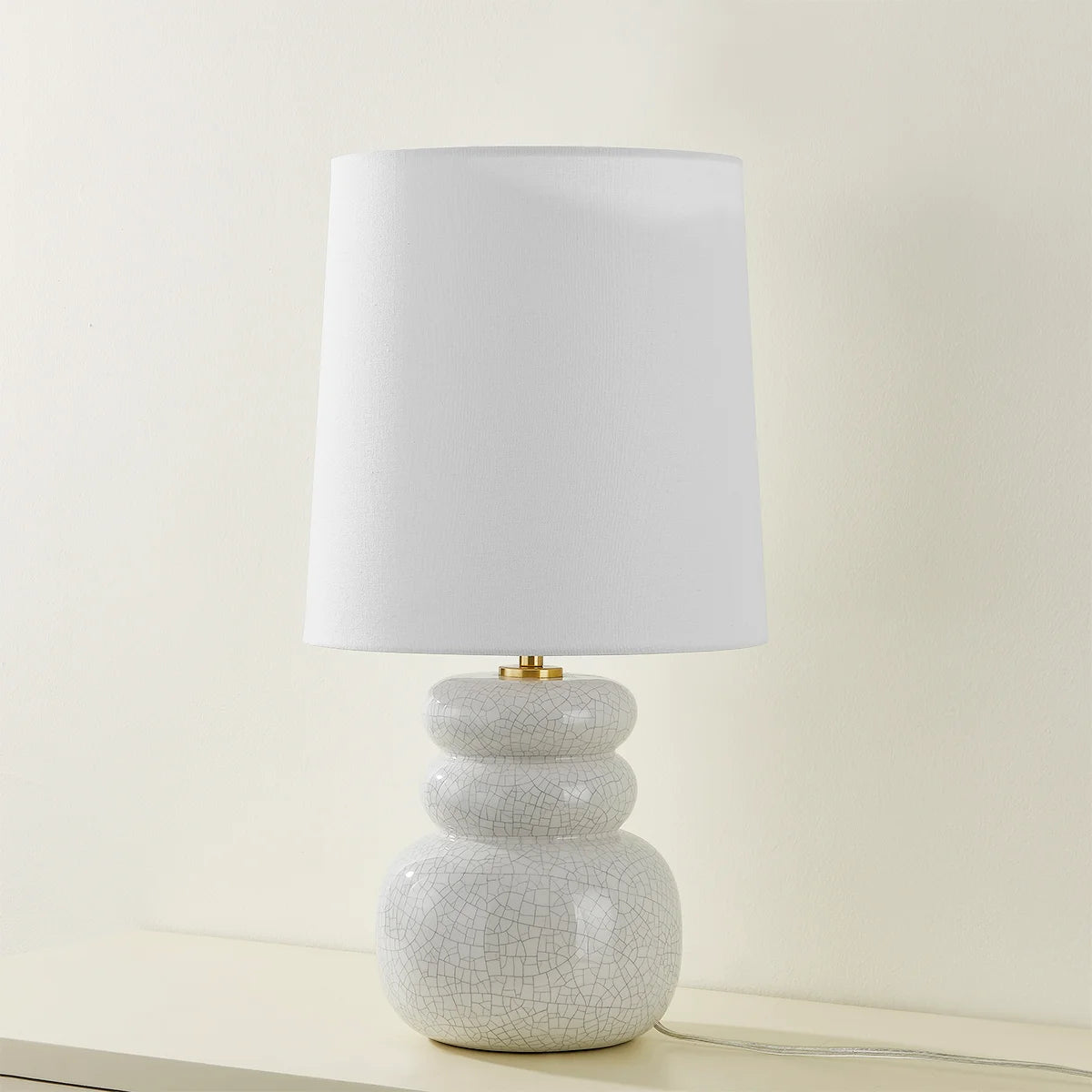 Meet the Corinne Lamp. In a petite size, this playful, pillowy table lamp makes a charming statement with its stacked ceramic forms. The crackled nature of the finish and soft, blush-toned hue create a sense of movement that draws the eye. A tall linen shade adds an unexpected sense of verticality, enhancing the whimsical feel of Wilder. Bulb(s) not included.