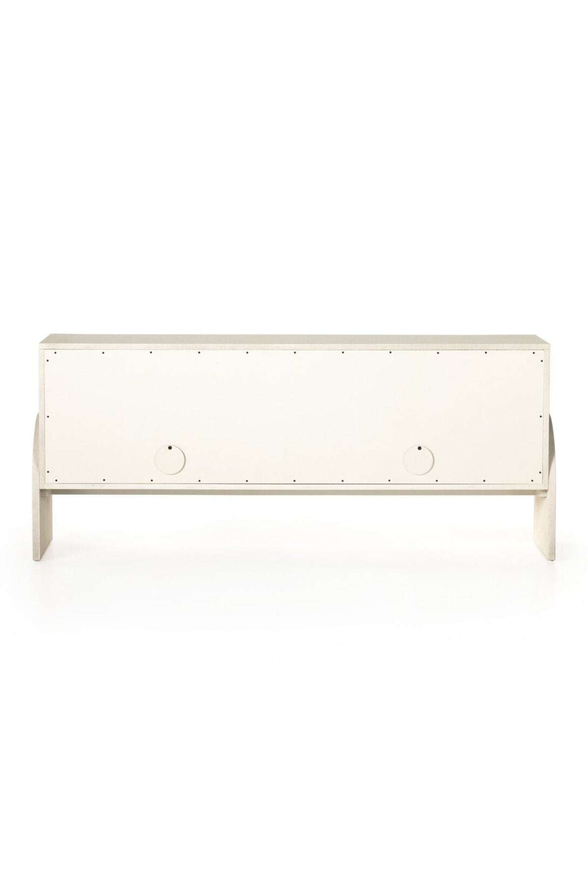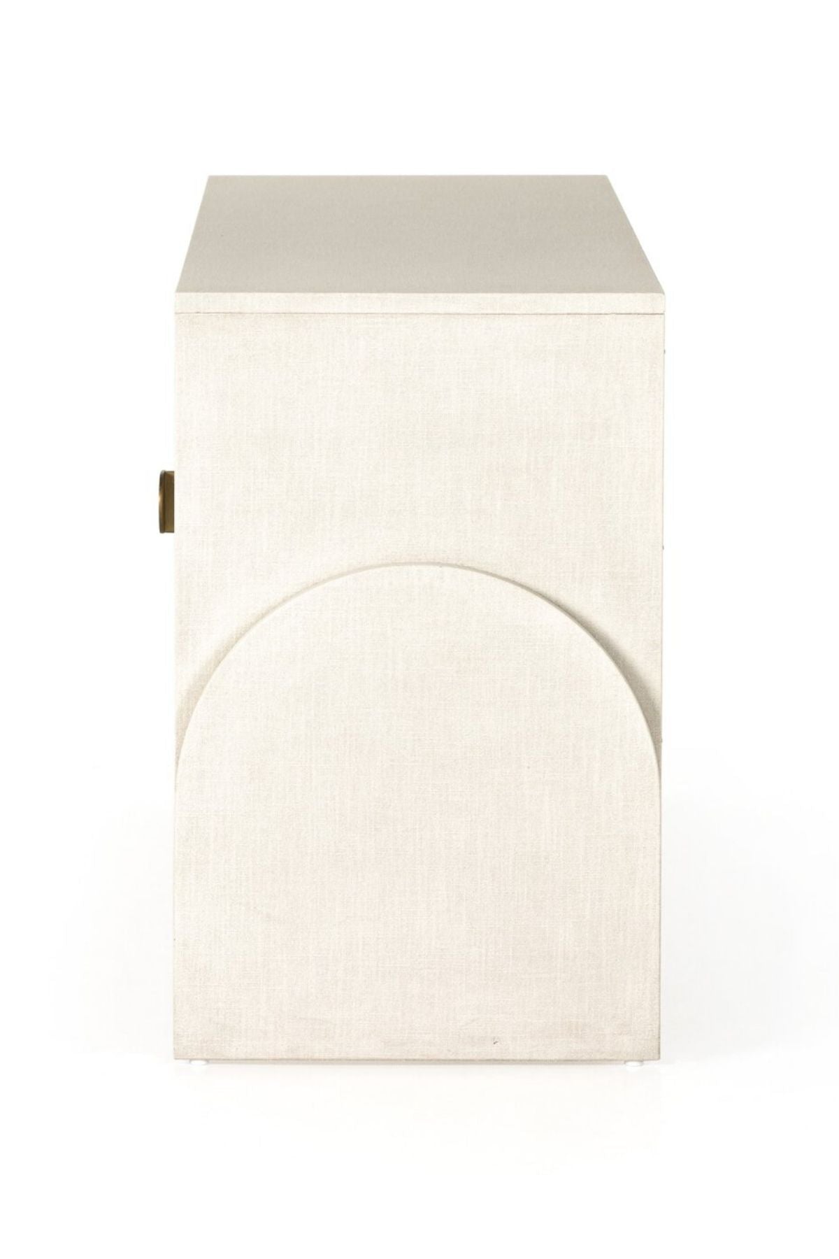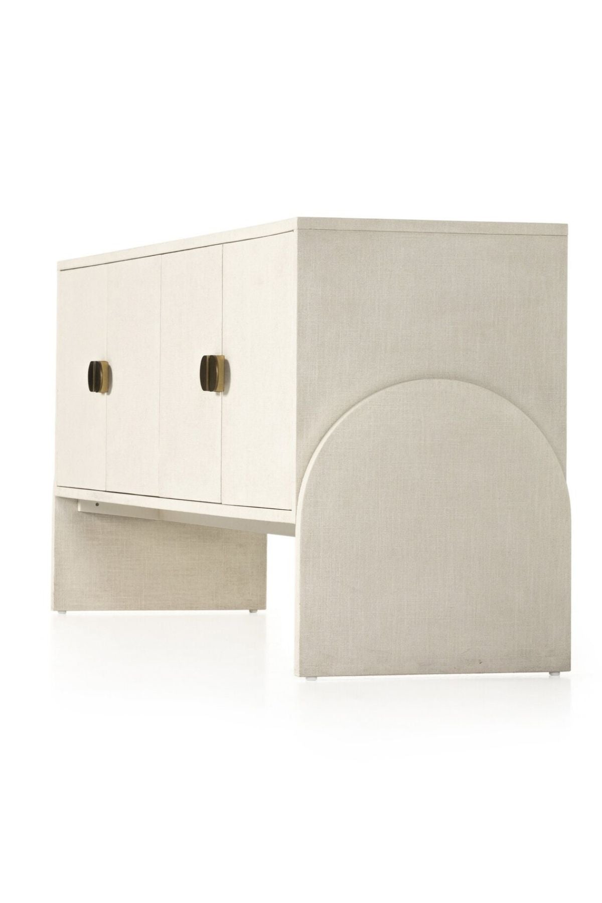Meet the Cressida Sideboard. Talk about novelty. The Crescio Sideboard is made from painted linen in a light ivory, arched legs that soften otherwise clean, modern shaping. Finished in an antique brass, half-moon iron hardware completes the look. Dual rear cutouts for cord management.