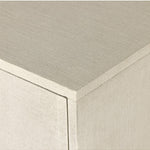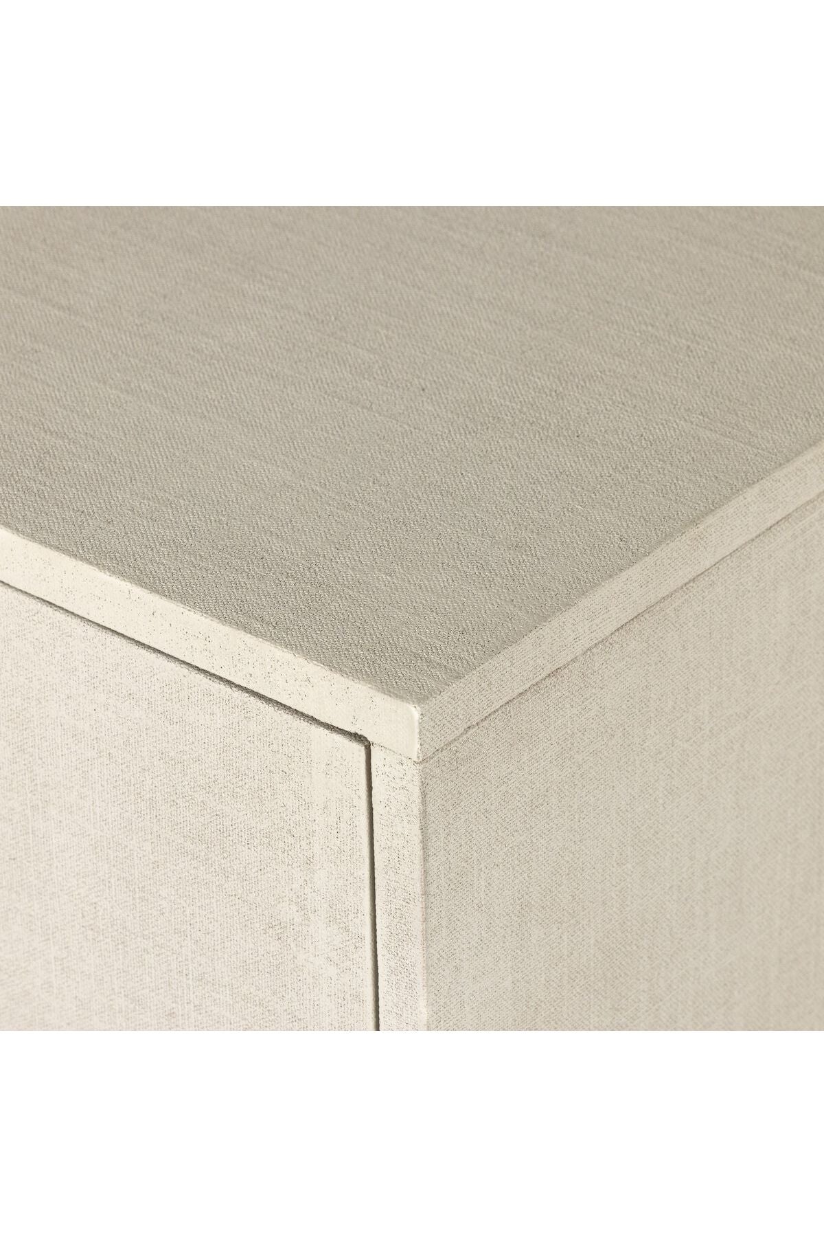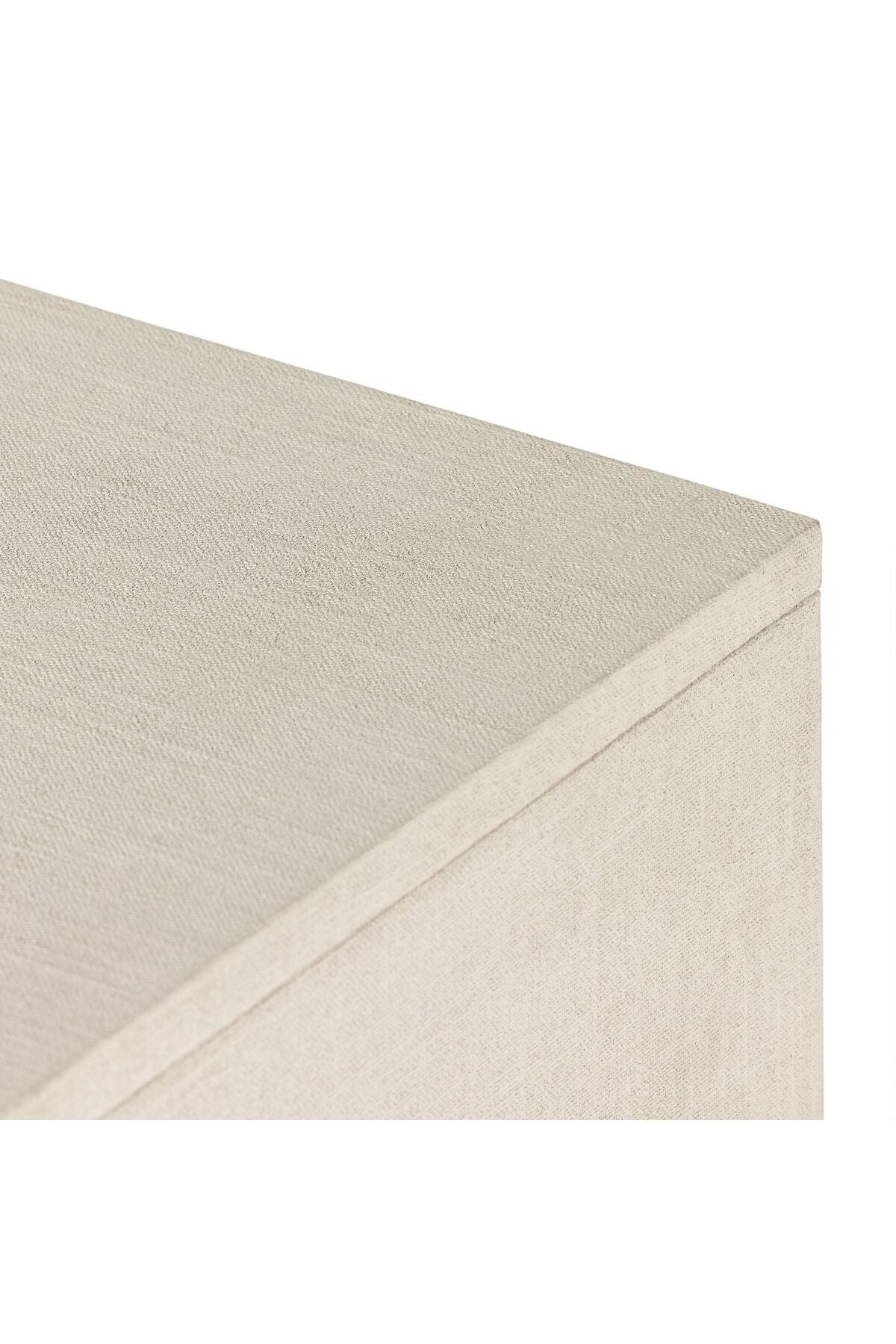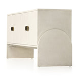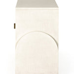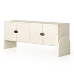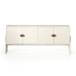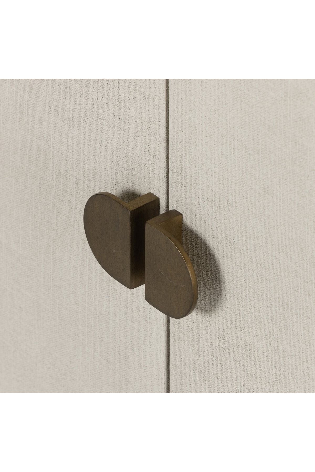 Meet the Cressida Sideboard. Talk about novelty. The Crescio Sideboard is made from painted linen in a light ivory, arched legs that soften otherwise clean, modern shaping. Finished in an antique brass, half-moon iron hardware completes the look. Dual rear cutouts for cord management.