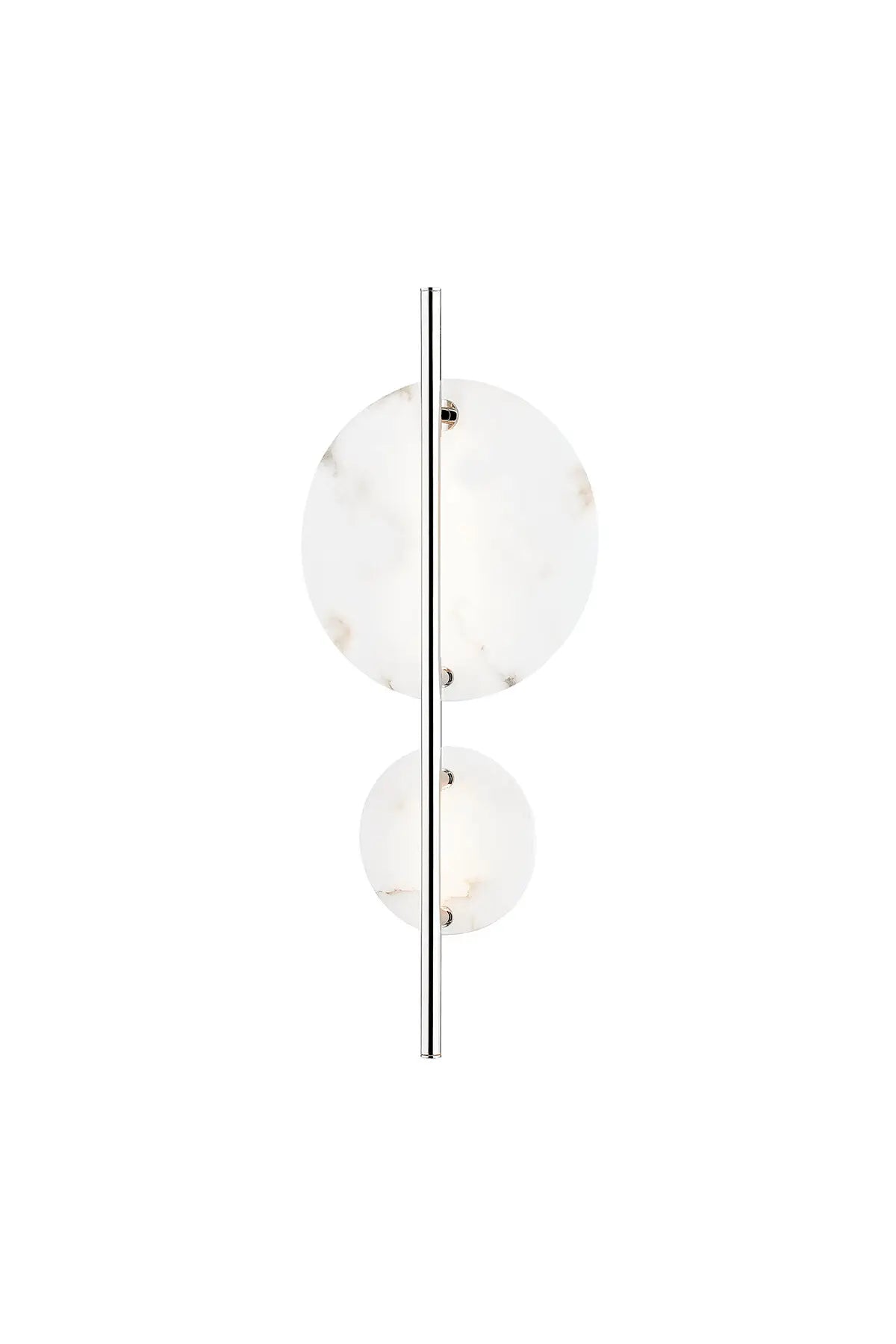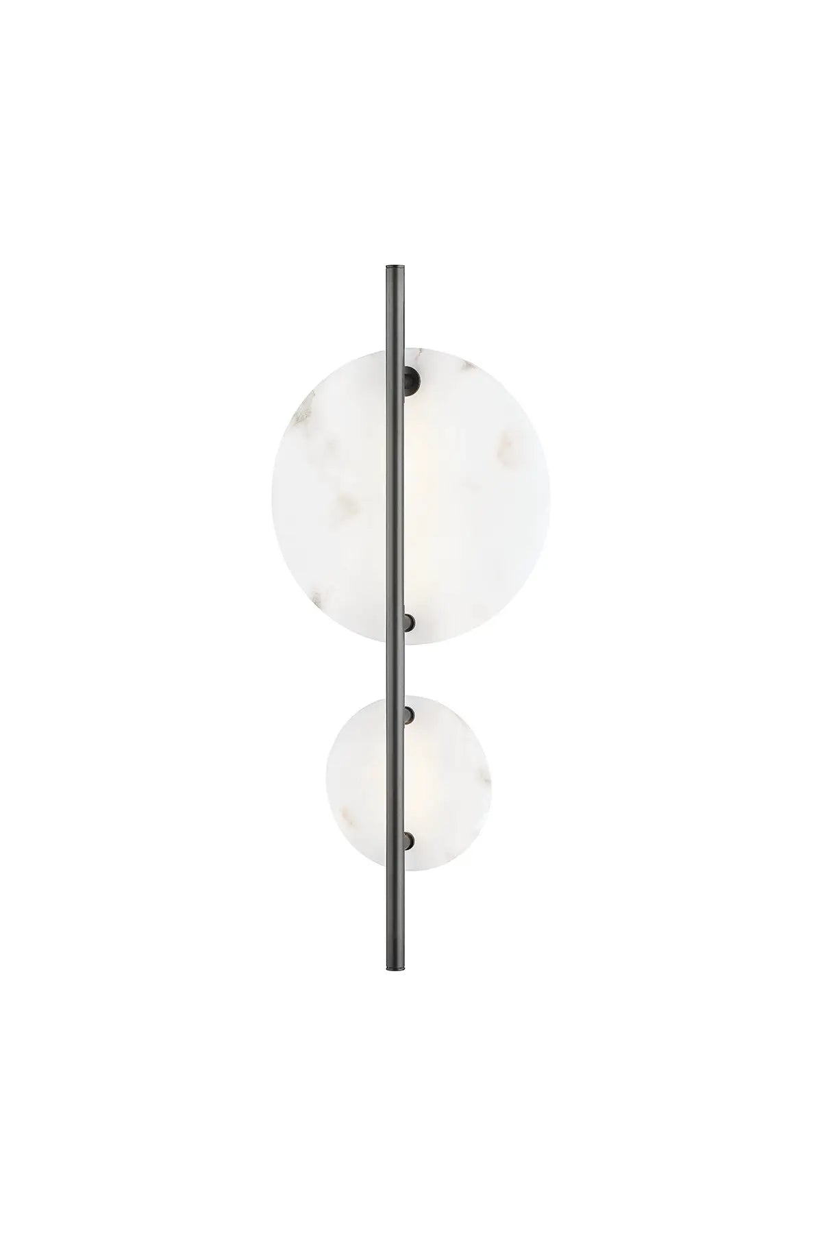Meet the Croft Sconce. A thin metal rod sits atop two alabaster crafted circular shades creating a contrast of shape, color and material. Single bulbs illuminate the alabaster with a soft glow and reflect light off the rod as well.