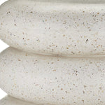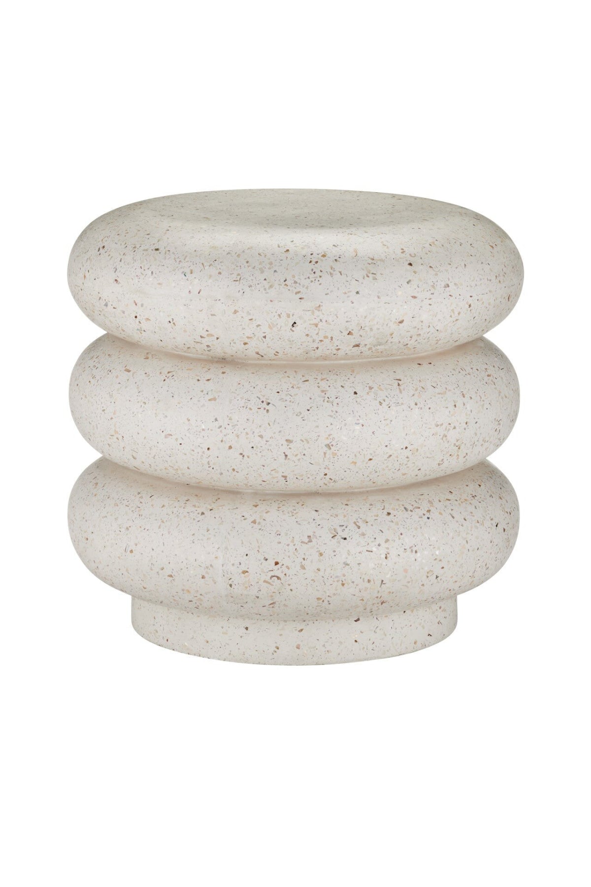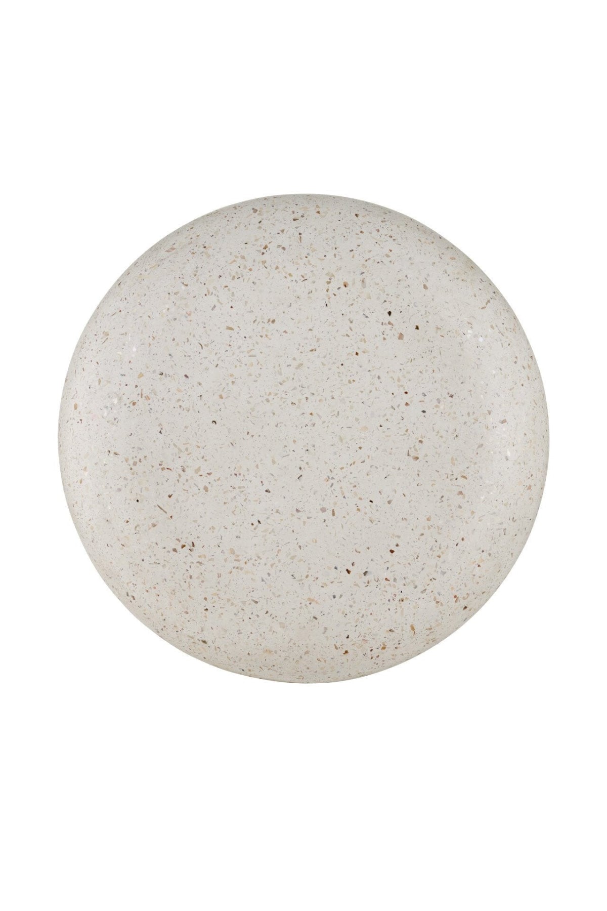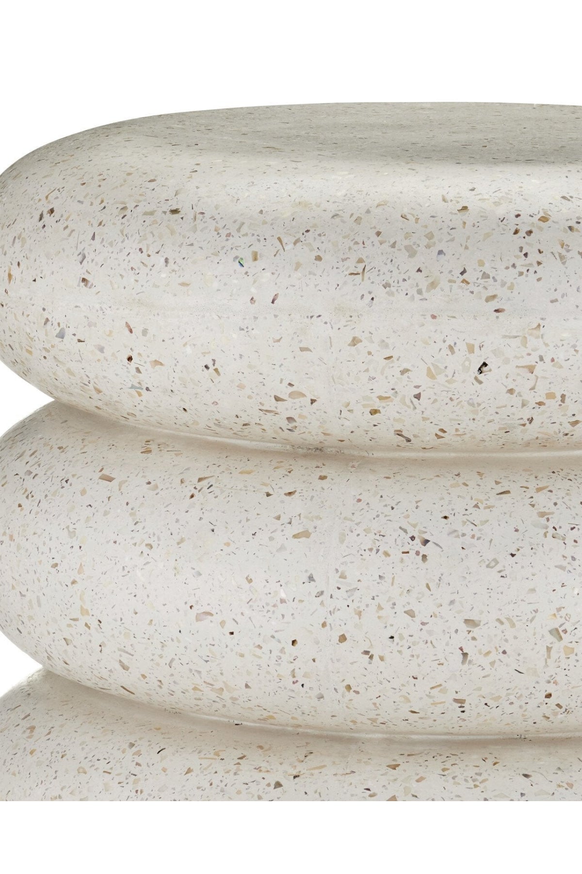The Cusani Ivory Terrazzo Stool is made of concrete in an ivory terrazzo finish, the combination making it both sleek and durable for outdoor rooms set within terraces and loggias. The ivory stool is created in a mold so it is solid and sturdy. The concrete is mixed with tempered glass fibers that read as soft amber and metallic flecks embedded in the surface, which adds a hint of glint to this sleek piece.