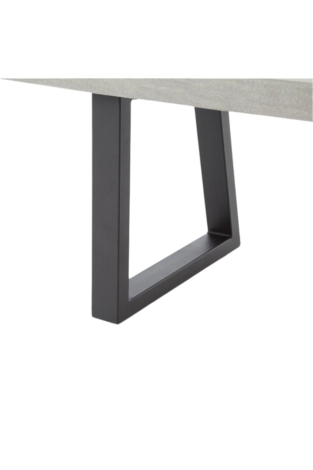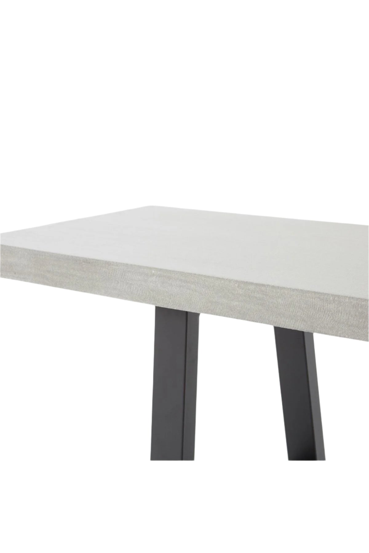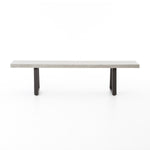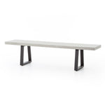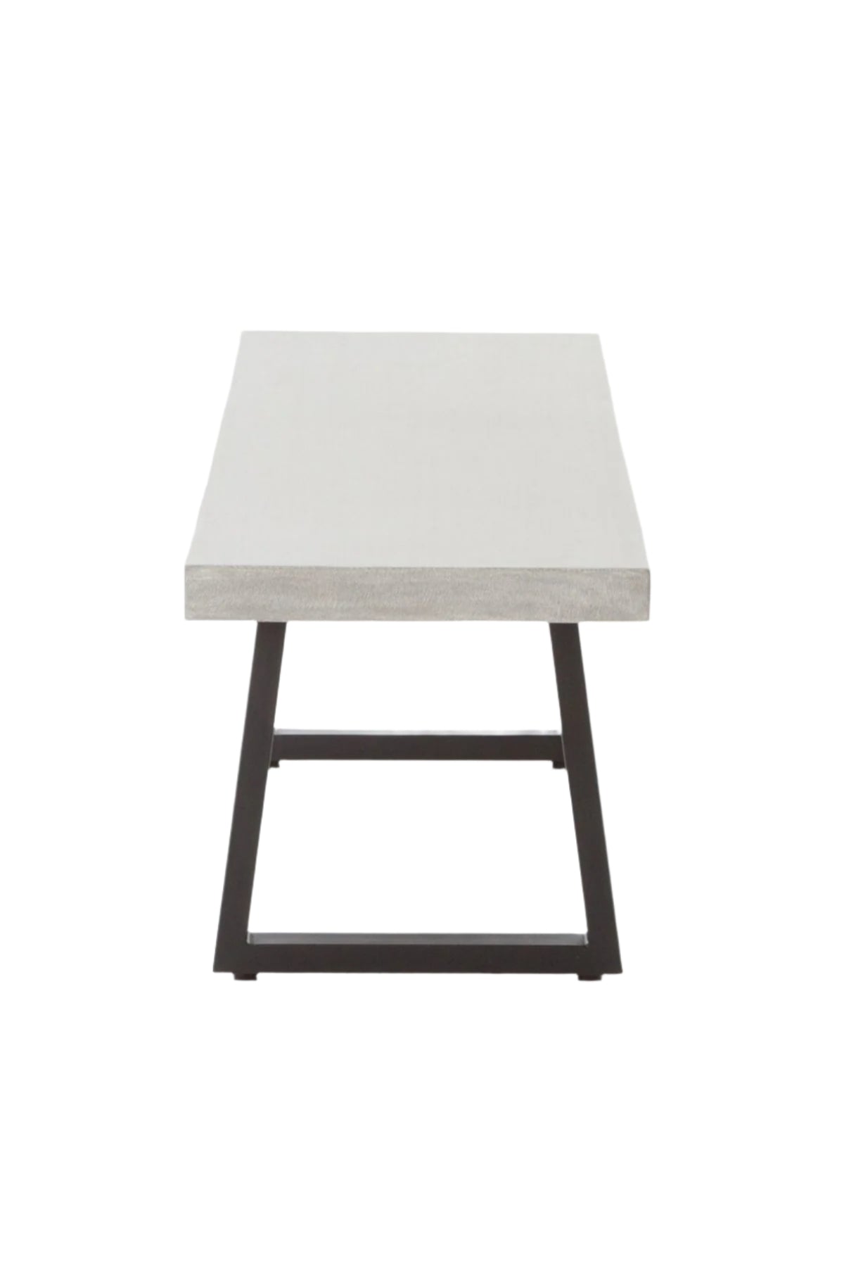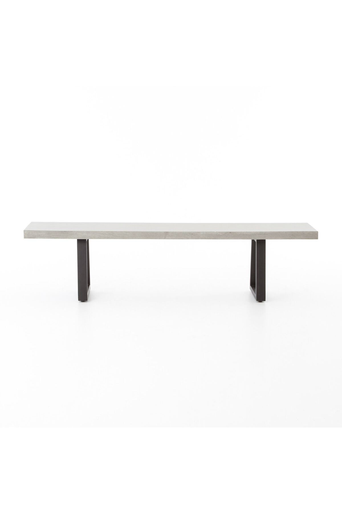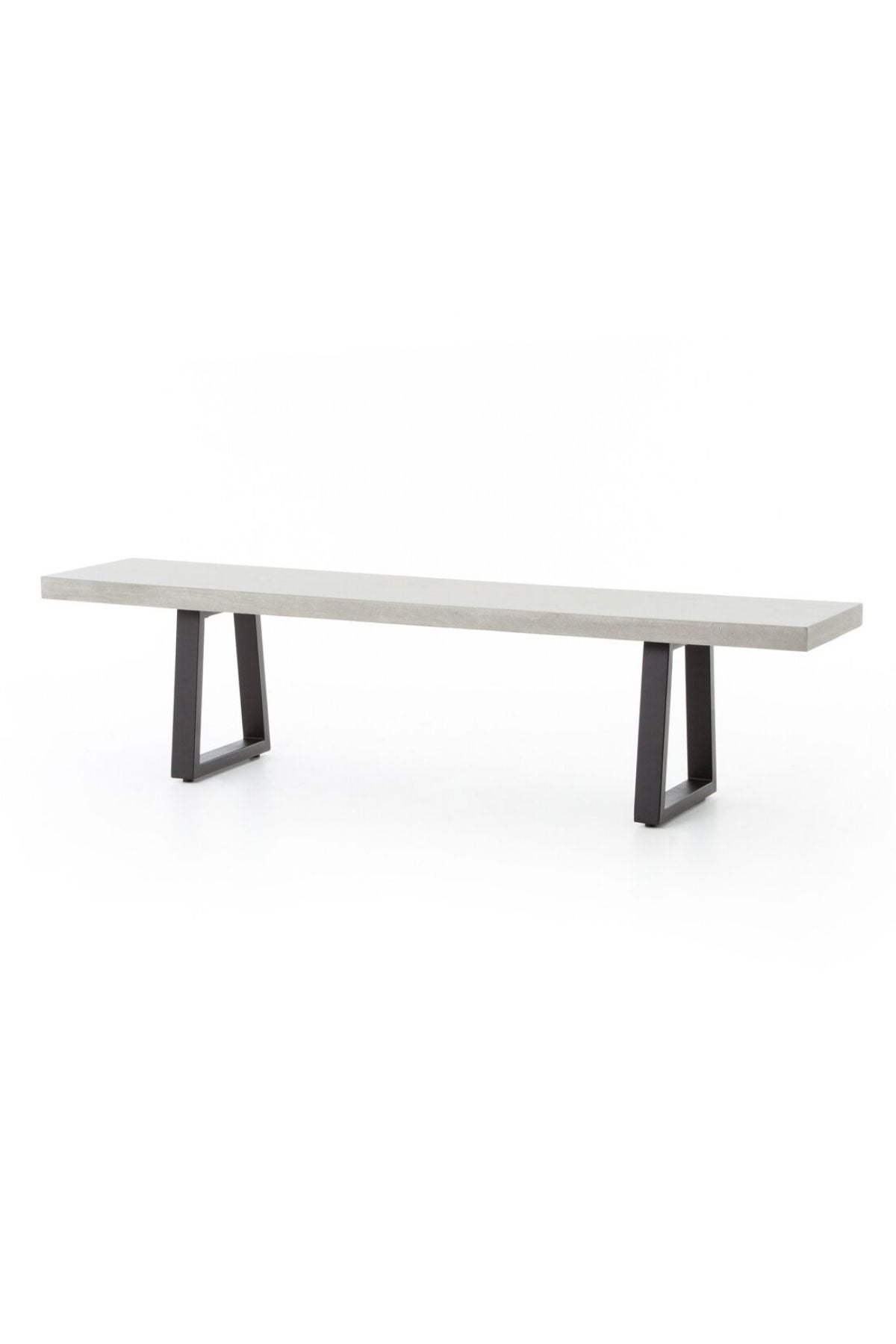 Meet the Cyrus Dining Bench, perfect for indoor or outdoor spaces! A strikingly simple poly-resin bench derived from river sand is polished to a smooth sheen. Angled, matte black iron legs add architectural appeal to bench-style seating. Slight color variance is to be expected, and speaks to lava stone's organic nature. Cover or store indoors during inclement weather and when not in use.
