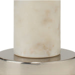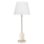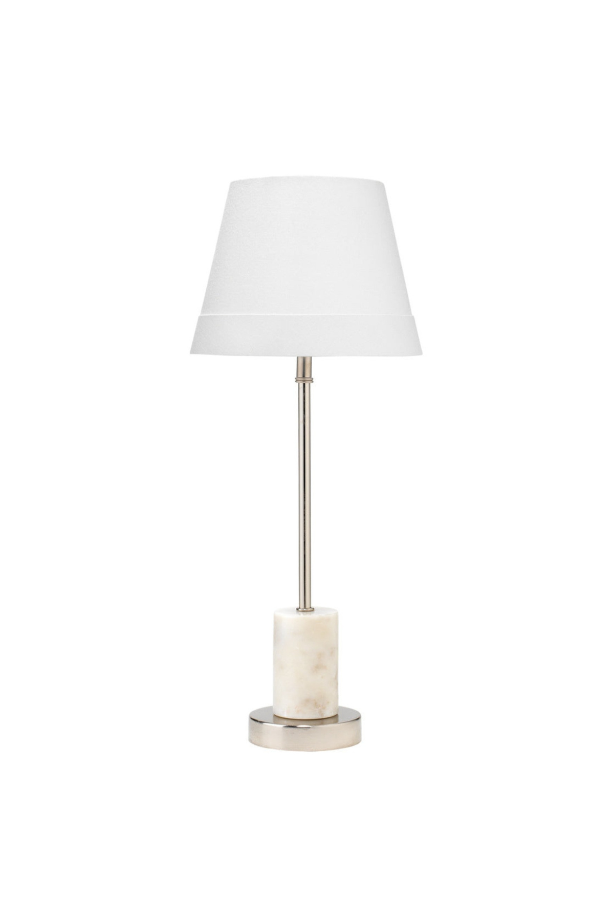 Meet the Darcey Table Lamp. A contemporary stick table lamp with an elegant white marble and nickel base. The tapered cotton shade has a distinctive wide bottom band that makes for a perfect accent lamp. Bulb(s) not included.