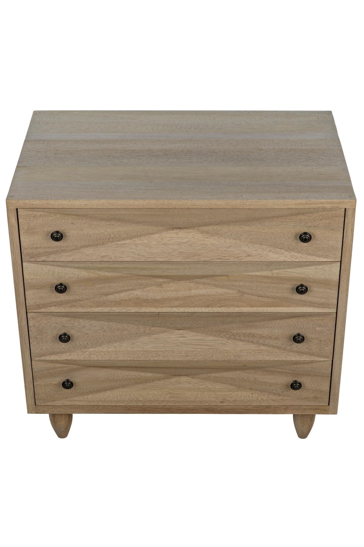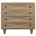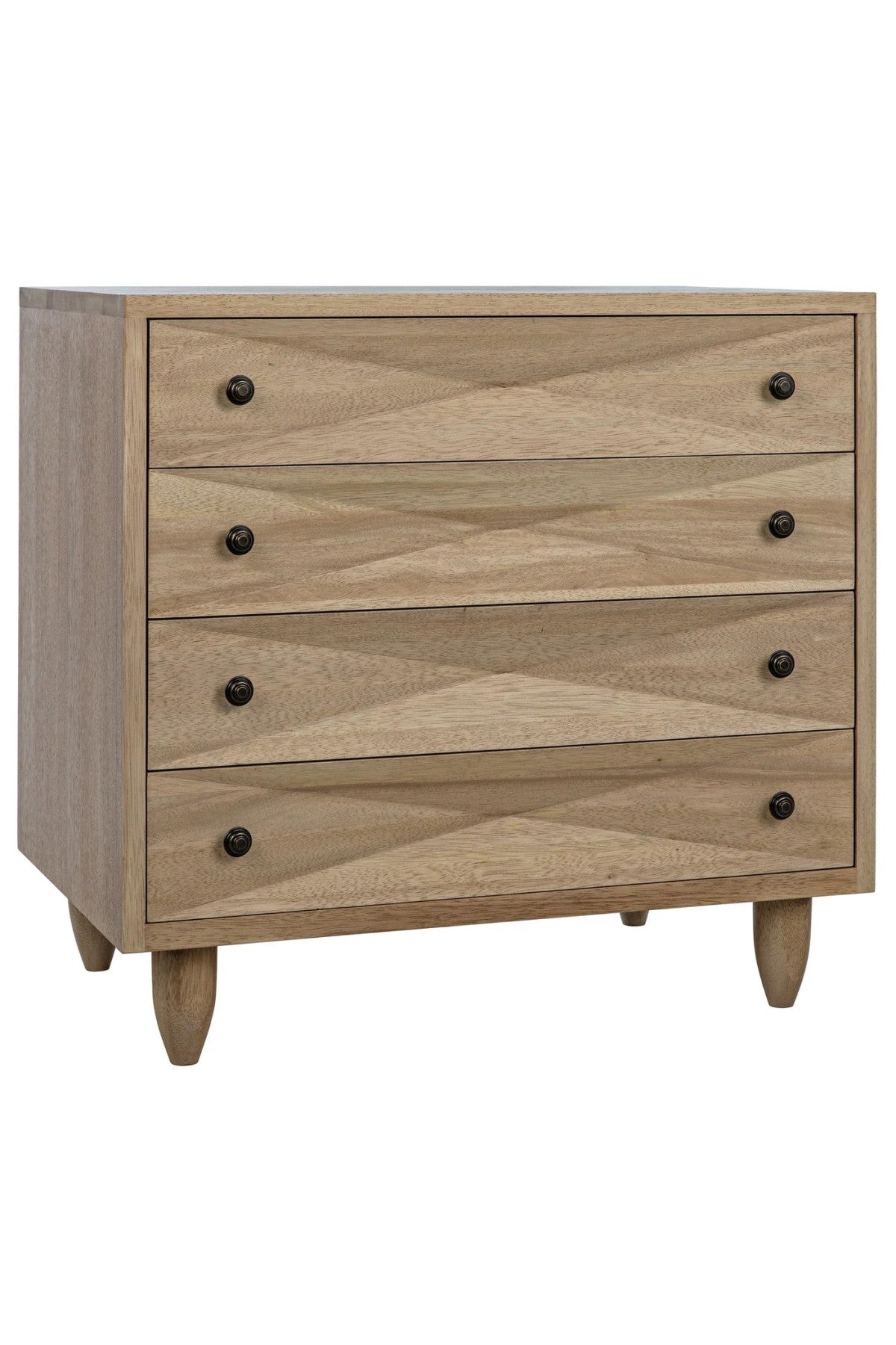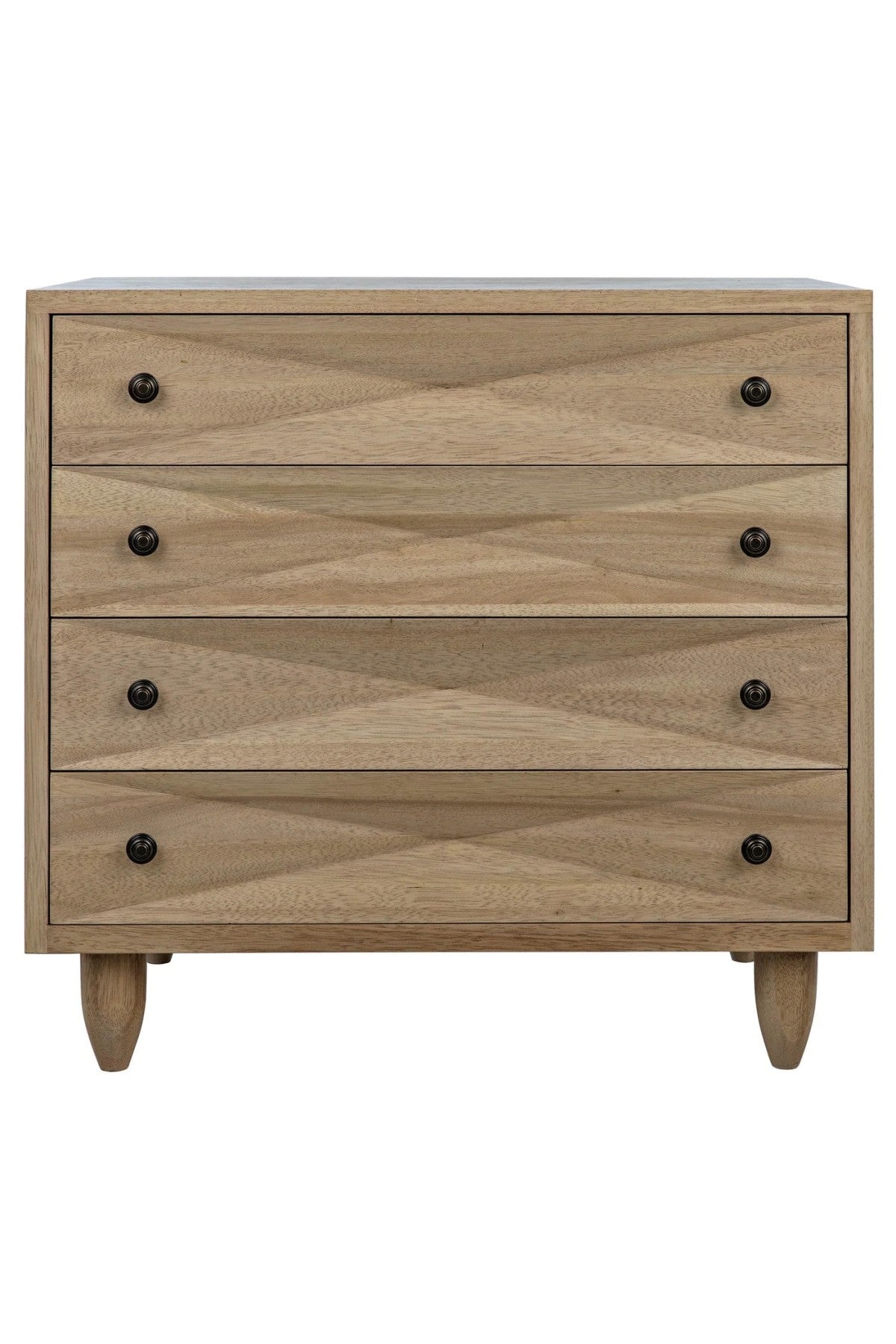 Meet the Diamond Chest. A straightforward walnut chest is elevated with the addition of multiple large diamond-shaped carvings. The elaborate carvings take center stage here, and we keep the rest simple with metal pulls, peg legs, and a washed walnut finish.