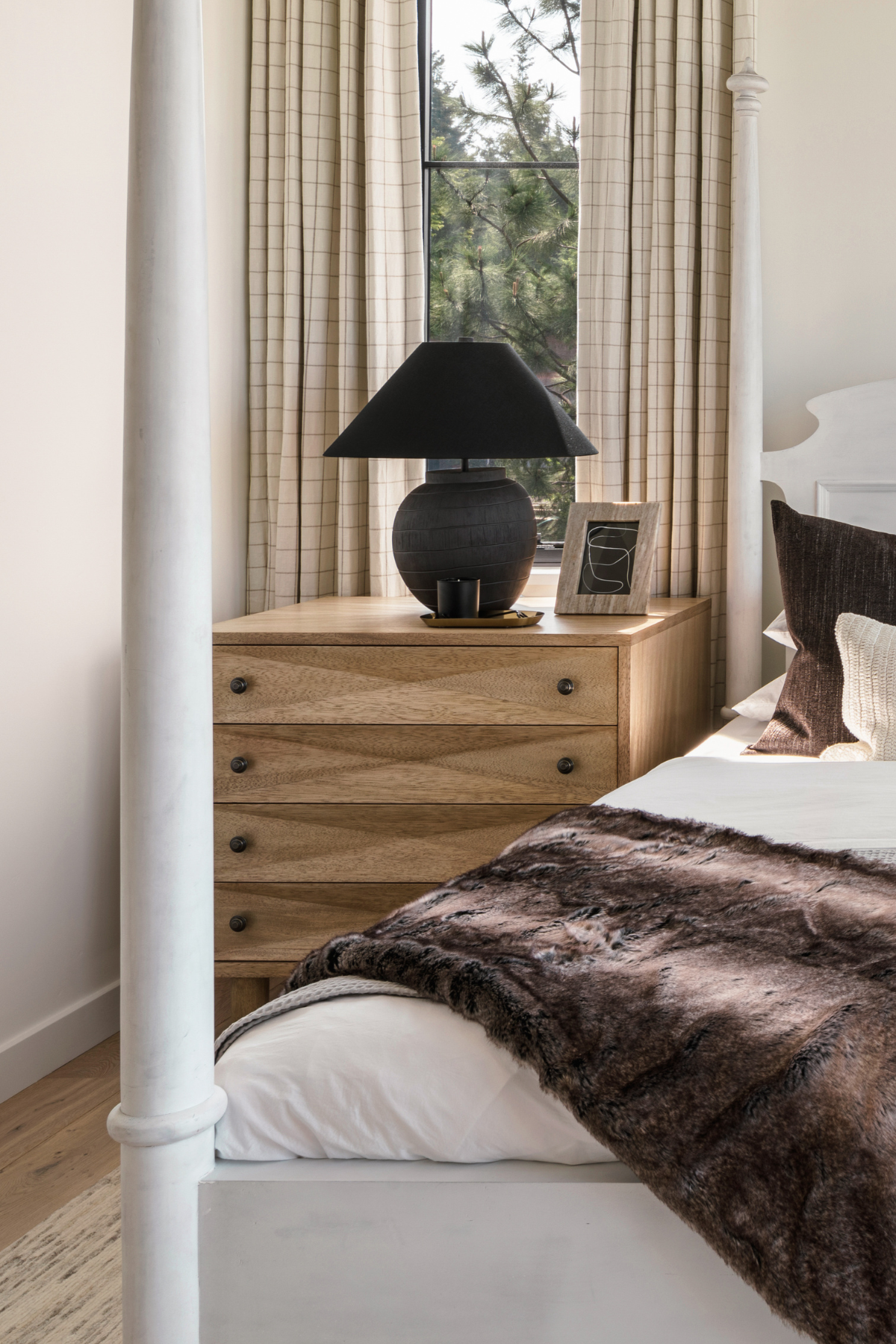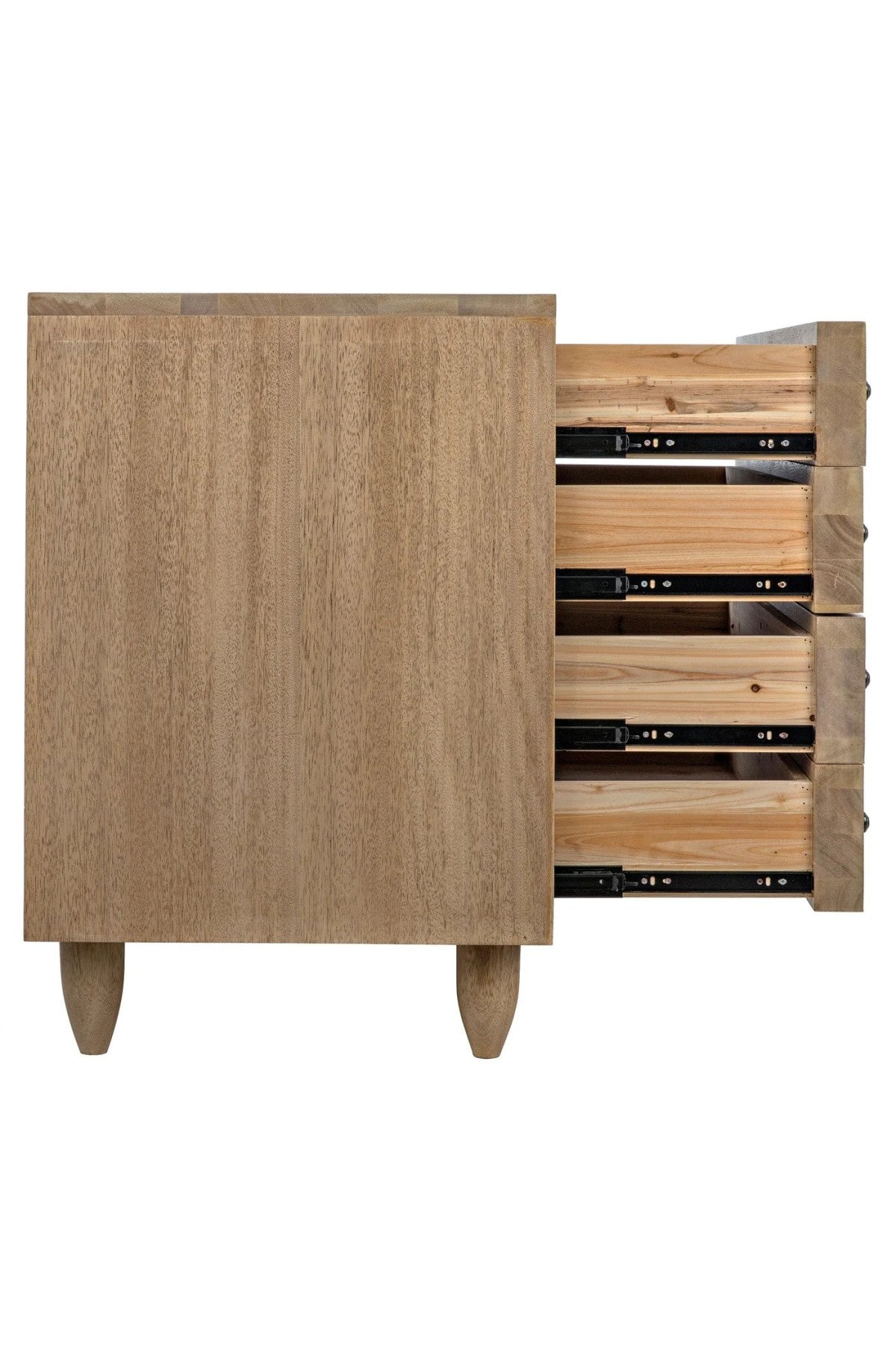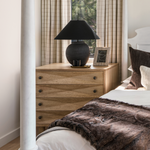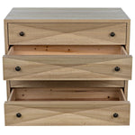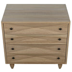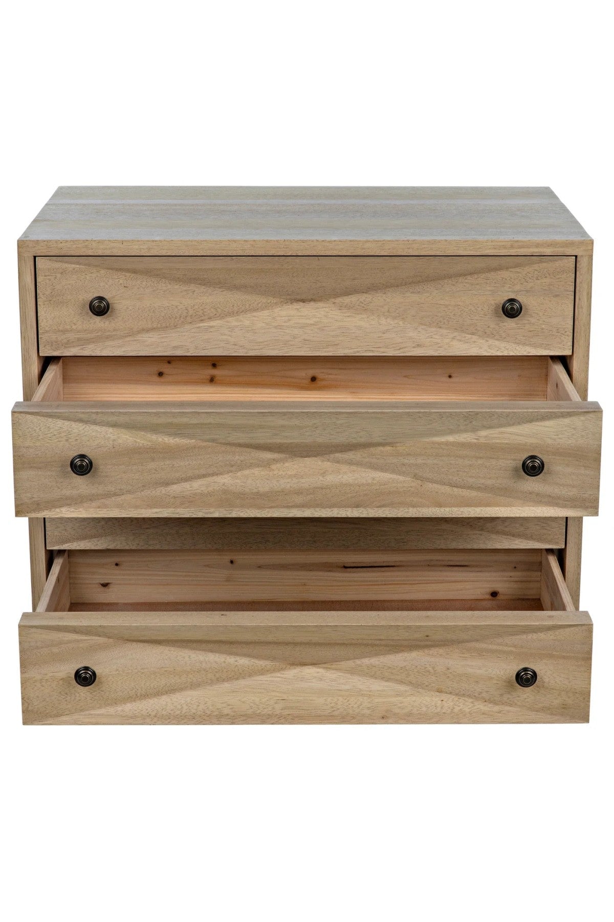 Meet the Diamond Chest. A straightforward walnut chest is elevated with the addition of multiple large diamond-shaped carvings. The elaborate carvings take center stage here, and we keep the rest simple with metal pulls, peg legs, and a washed walnut finish.