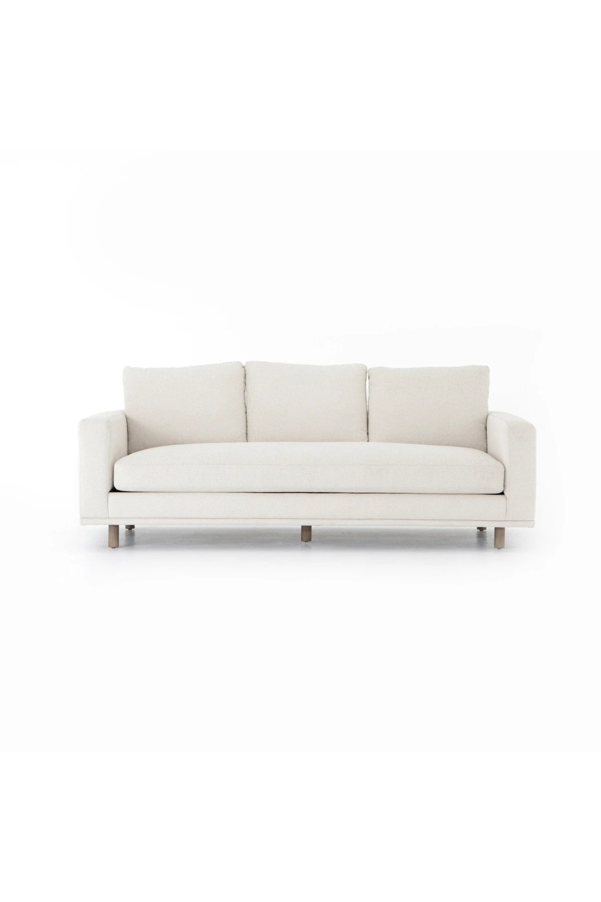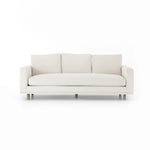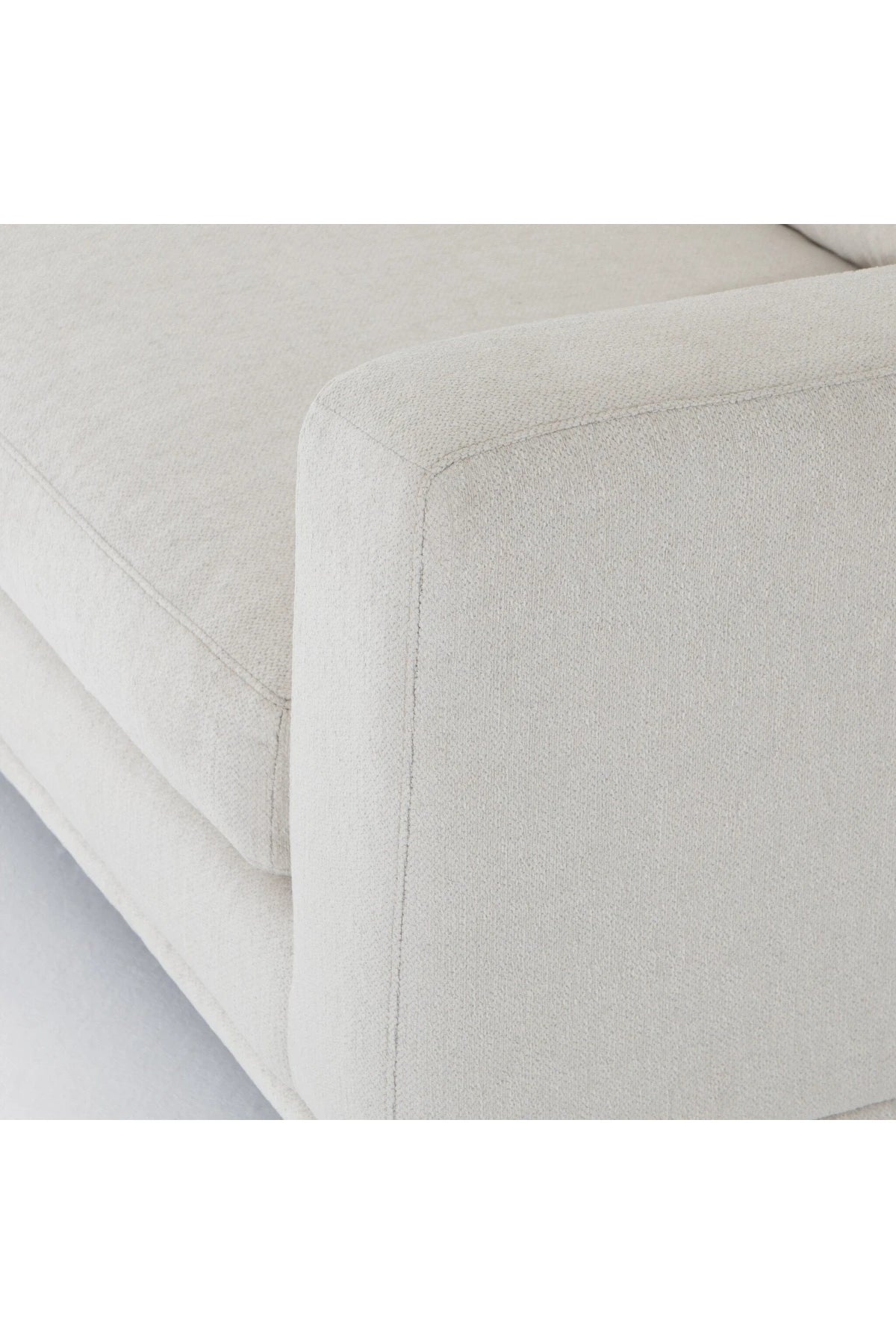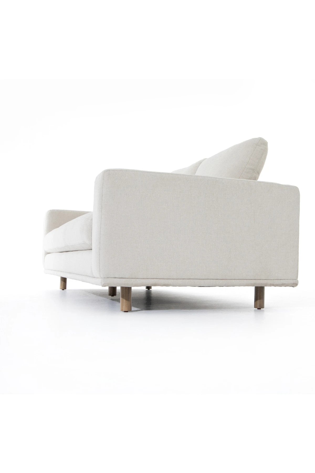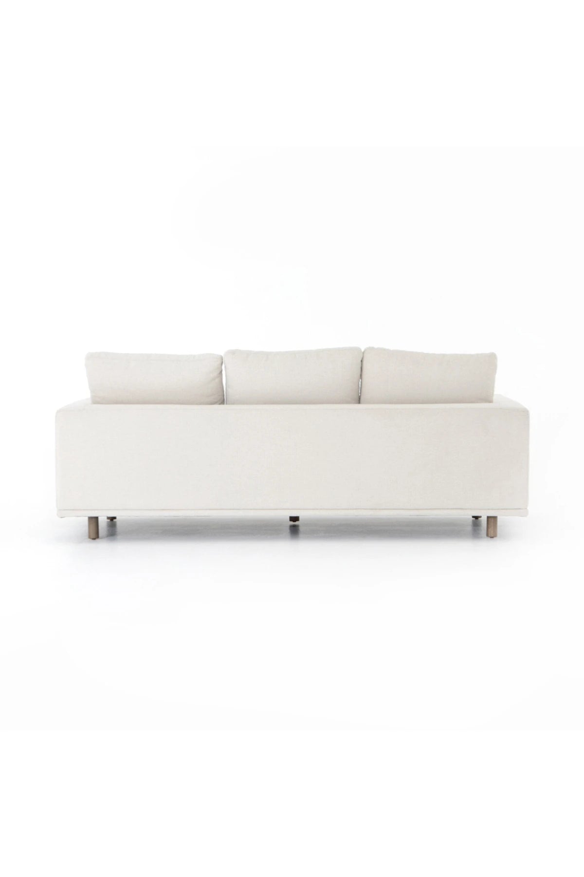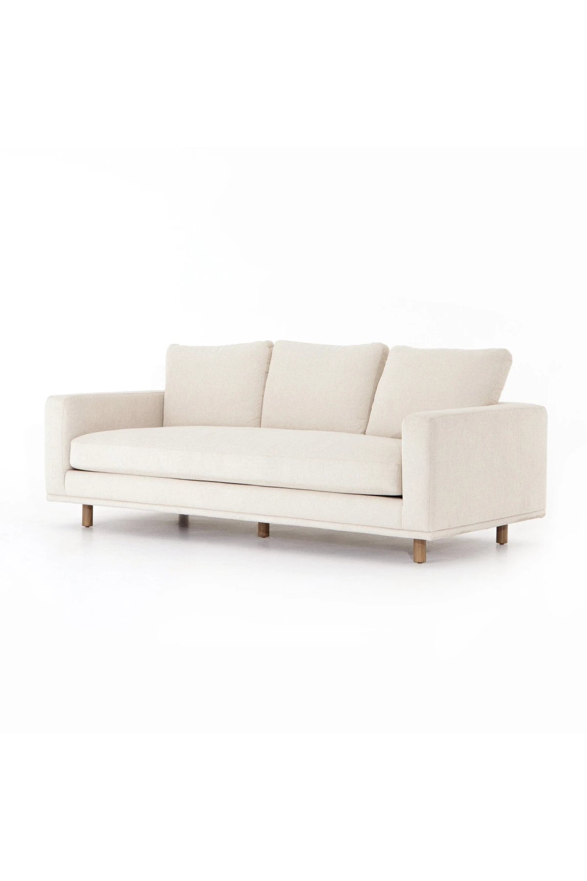 Meet the Dom Sofa. Performance-grade fabric brings surprising livability to a show-stopping silhouette. Pristinely tailored ivory upholstery exudes elegance, with clean track arms and loose feather-blend cushioning for total comfort.