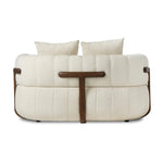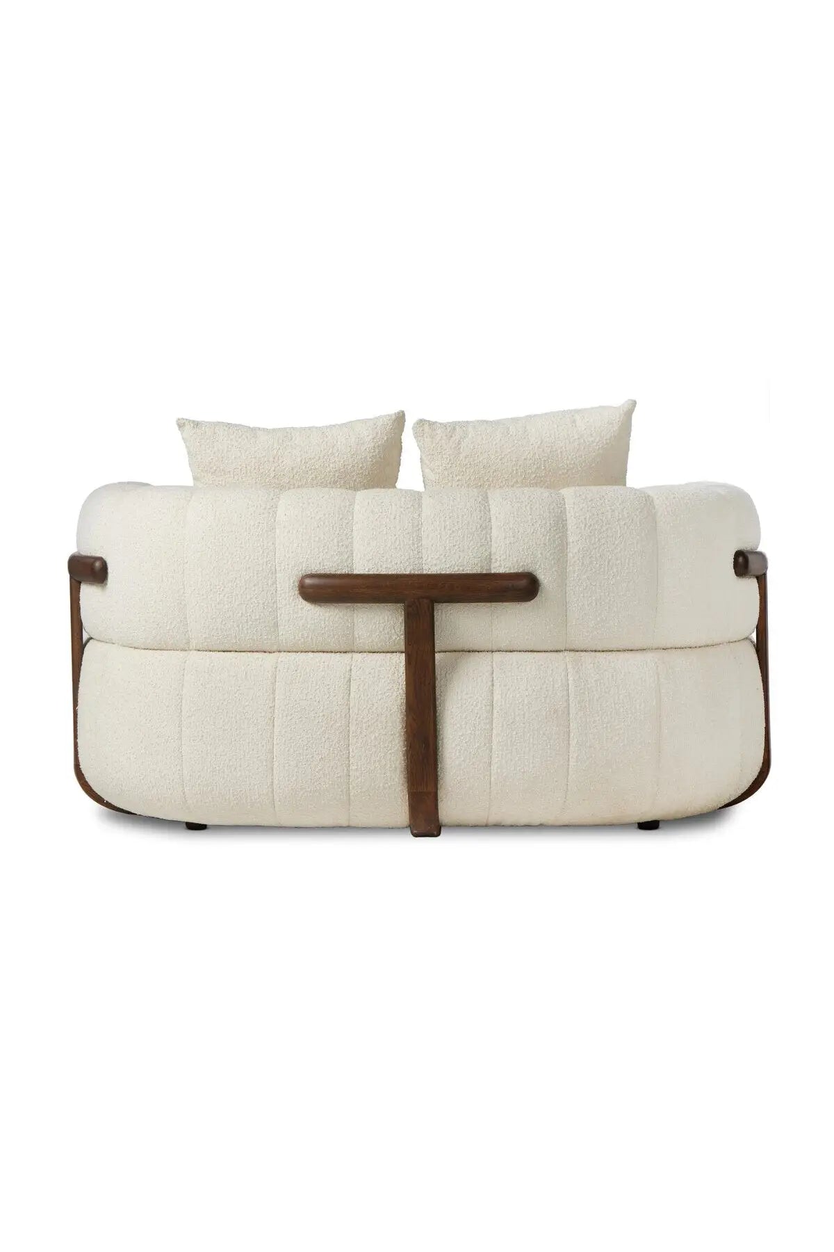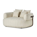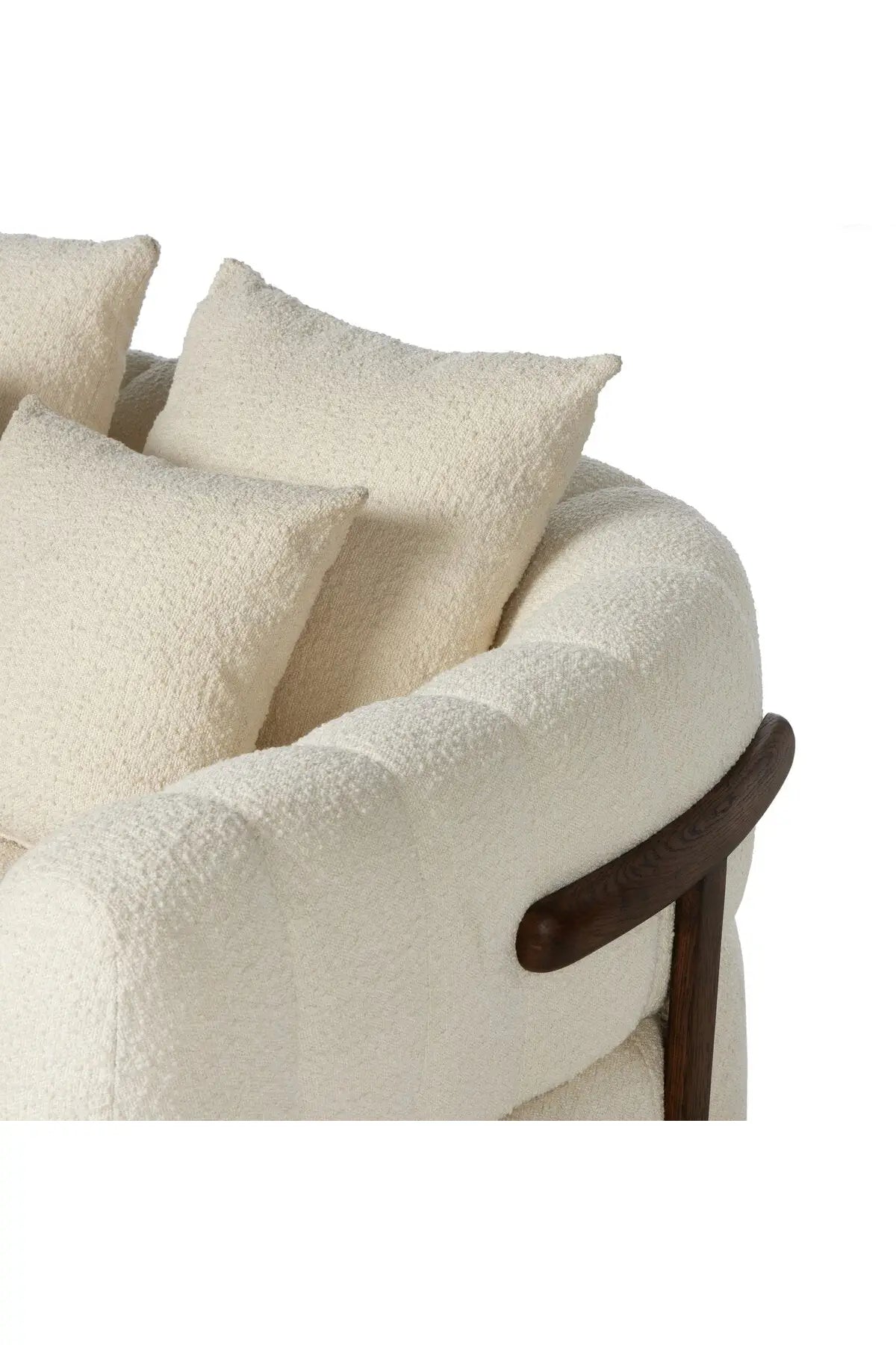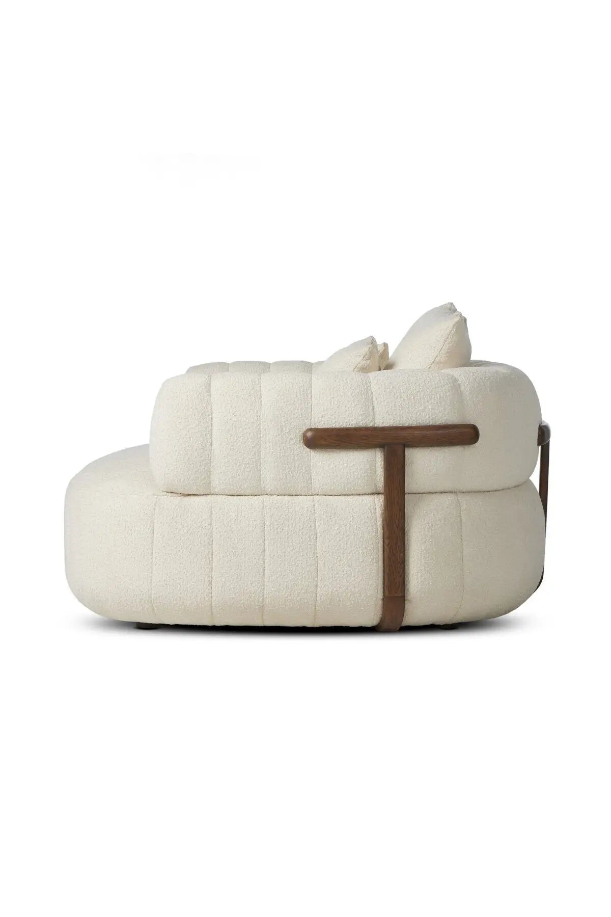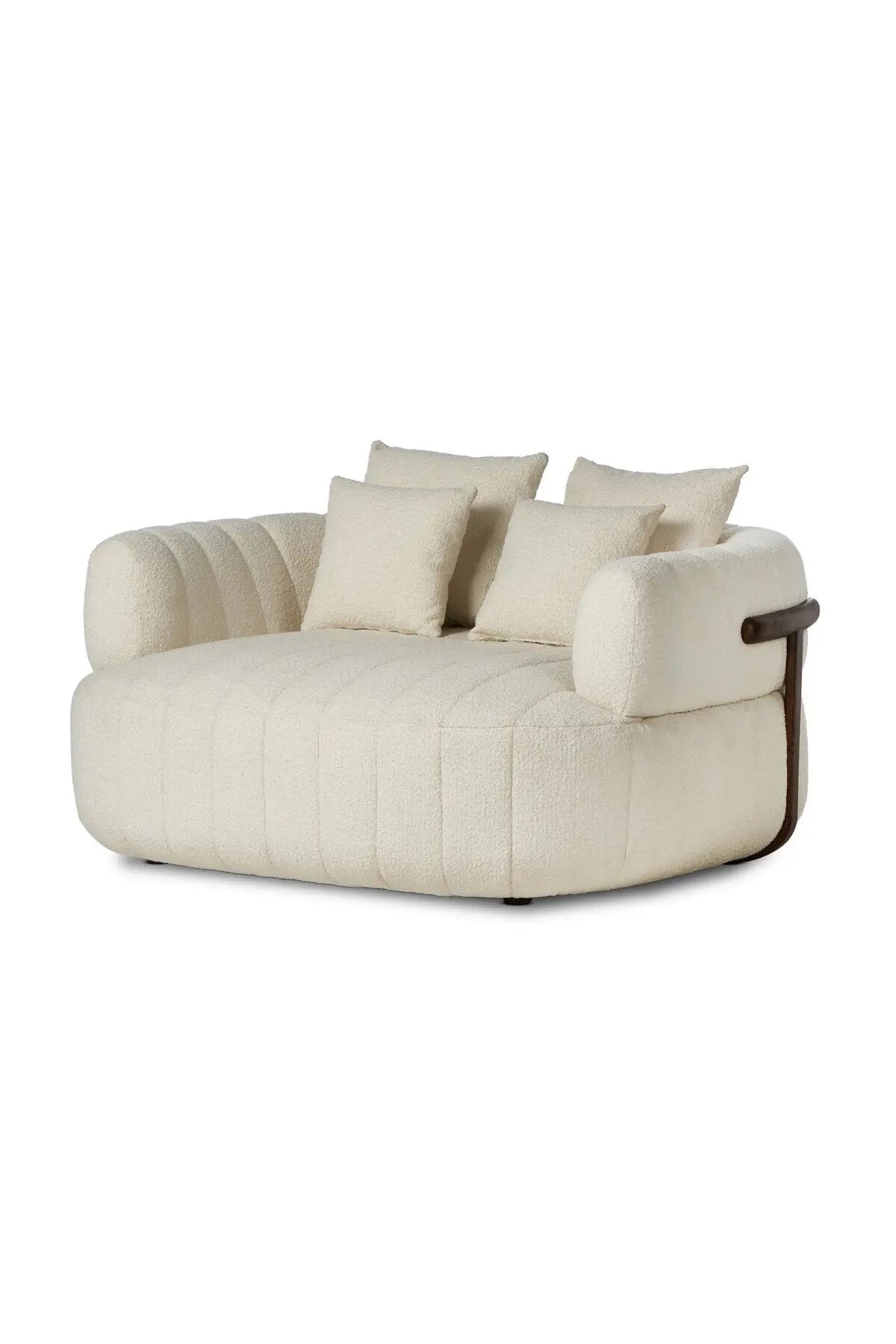 Framed in oak, the Doss Media Lounger is constructed with two separate pieces — the seat and the back — and accompanied by four toss cushions. The lounger features evenly spaced spring suspension and a heavy boucle upholstery stitched into 5.5-inch channels for stylish comfort.