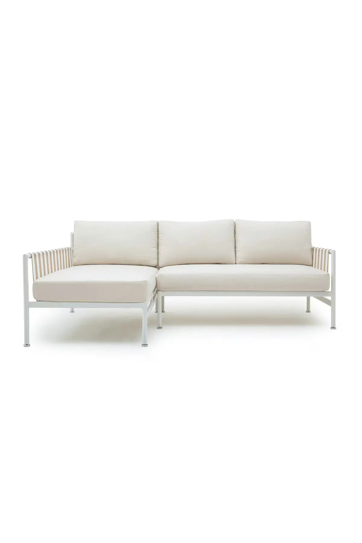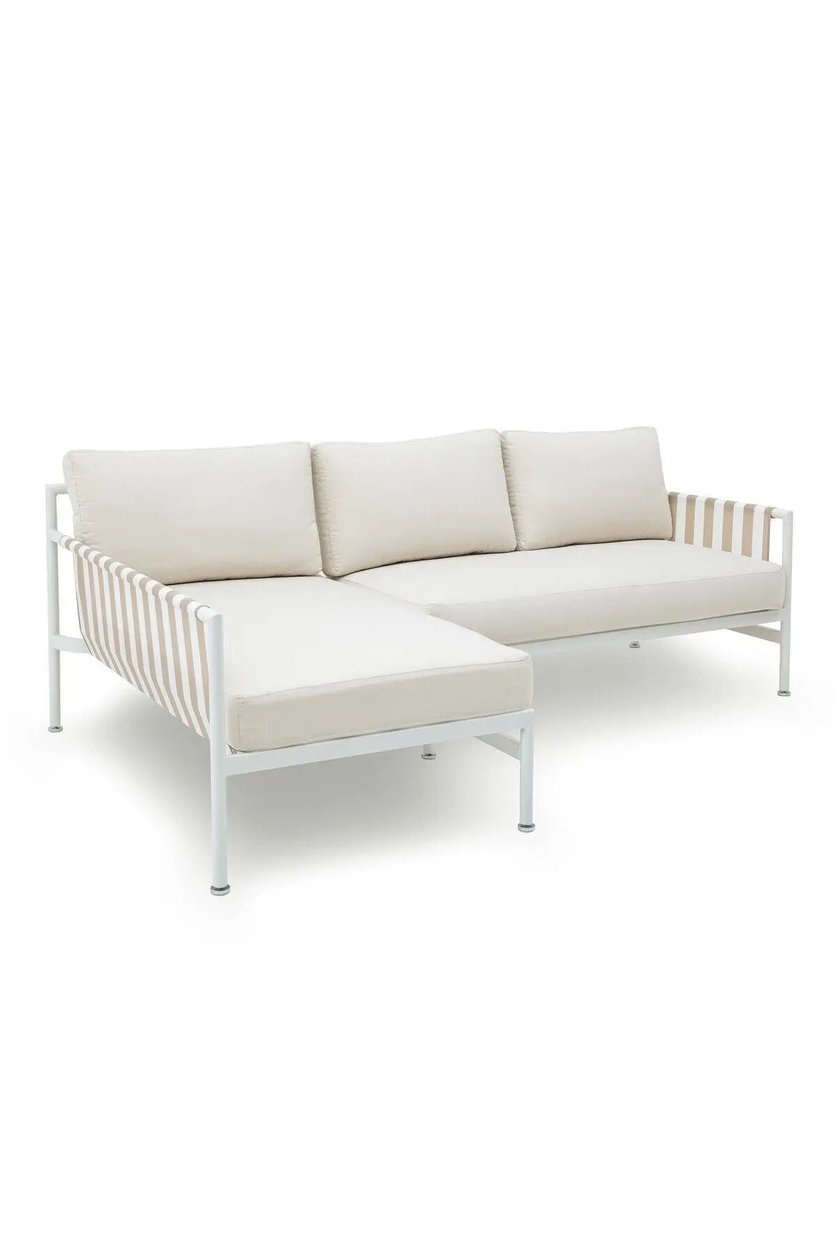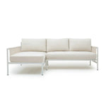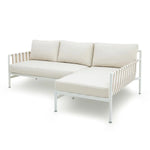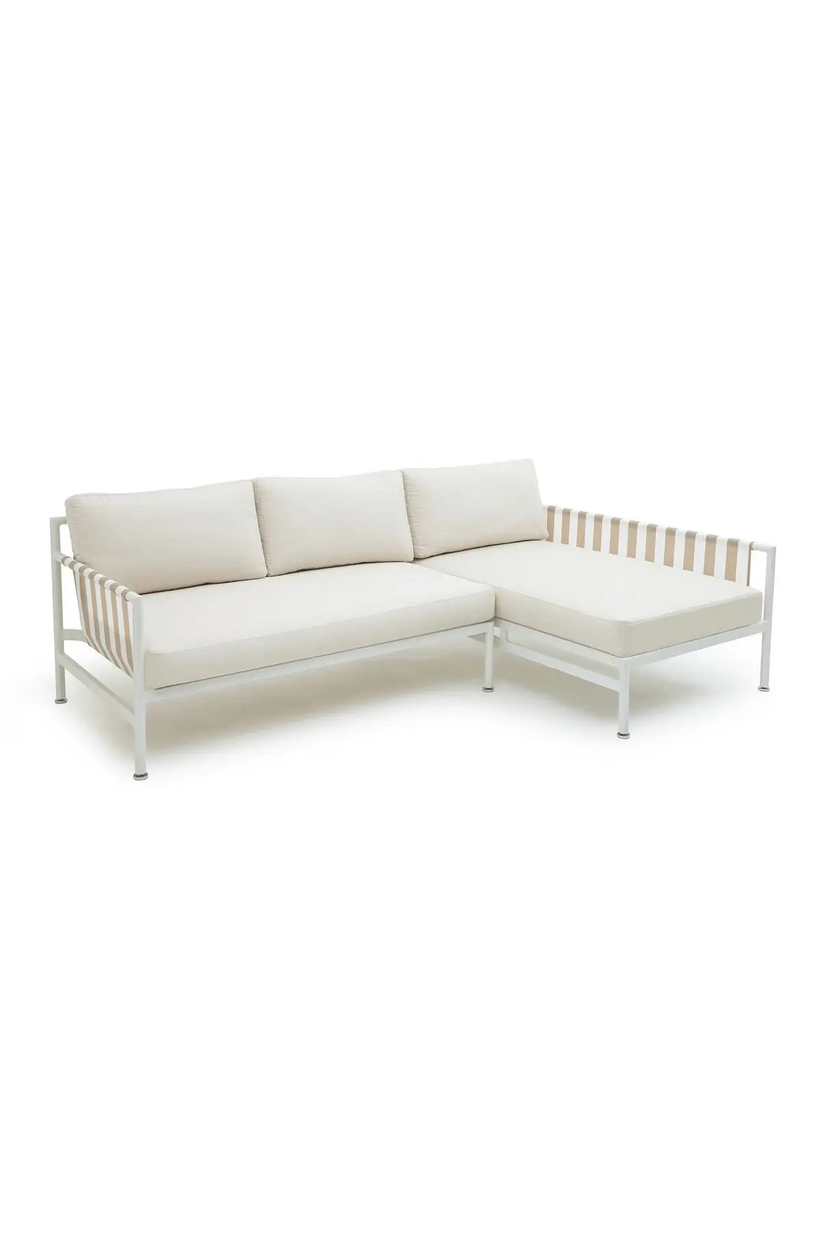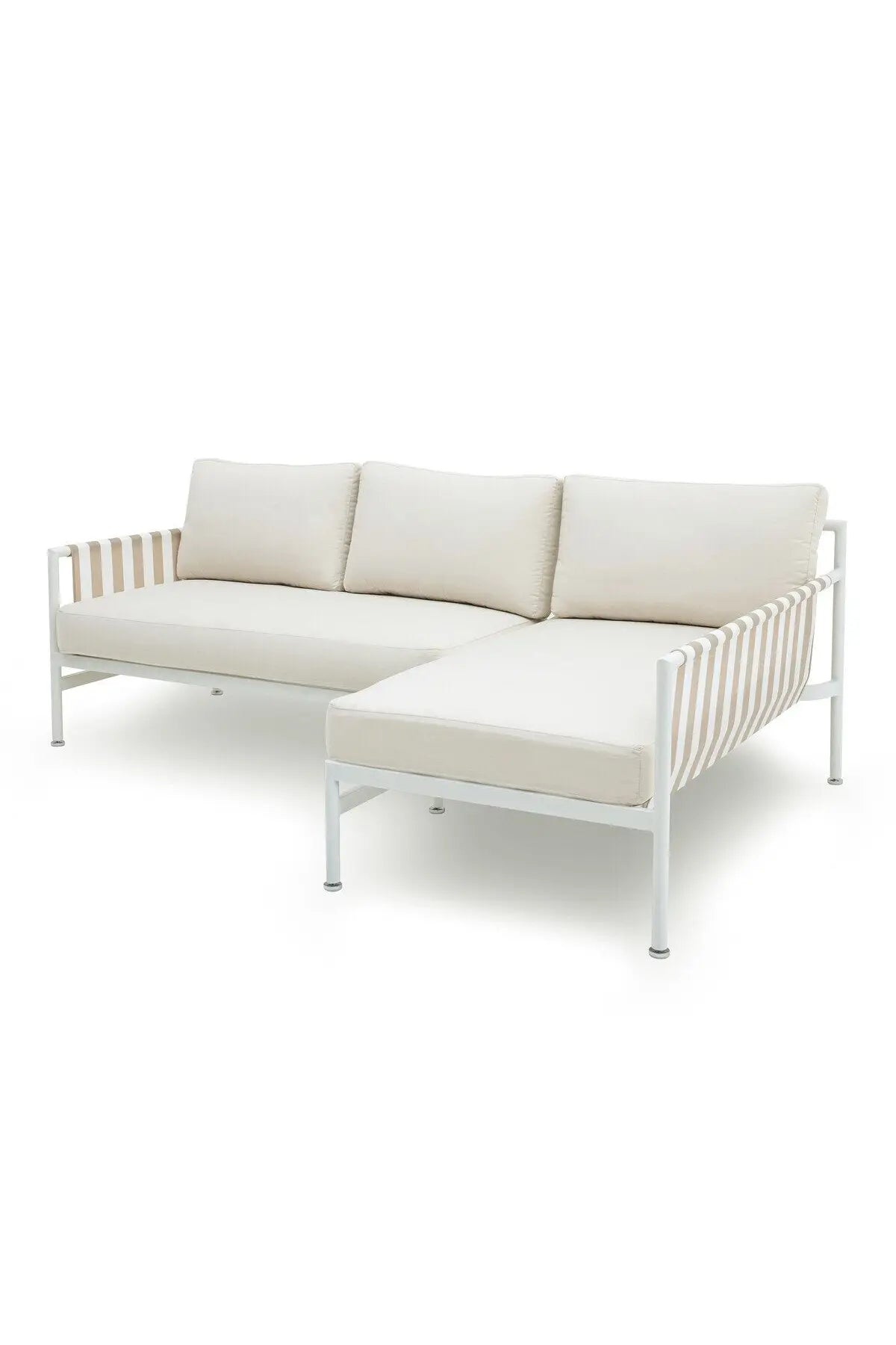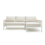 Meet the Dunes Cream Outdoor Sectional. Bring Riviera charm to your patio with this durable, rust-resistant aluminum armchair. Featuring UV-resistant fabric, reversible cushions, and high-density foam for comfort, it blends style with function. Adjustable levelers keep it steady on uneven surfaces.