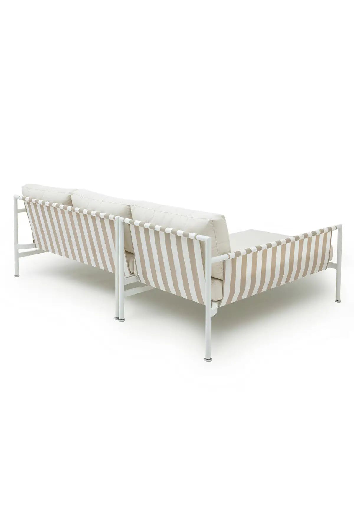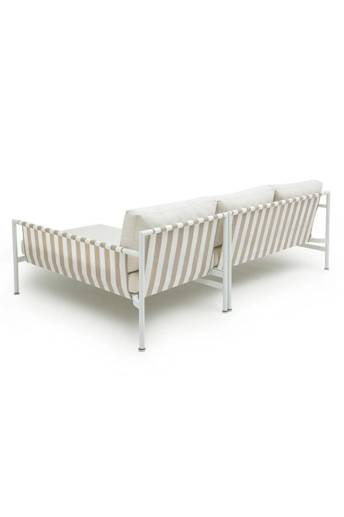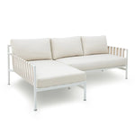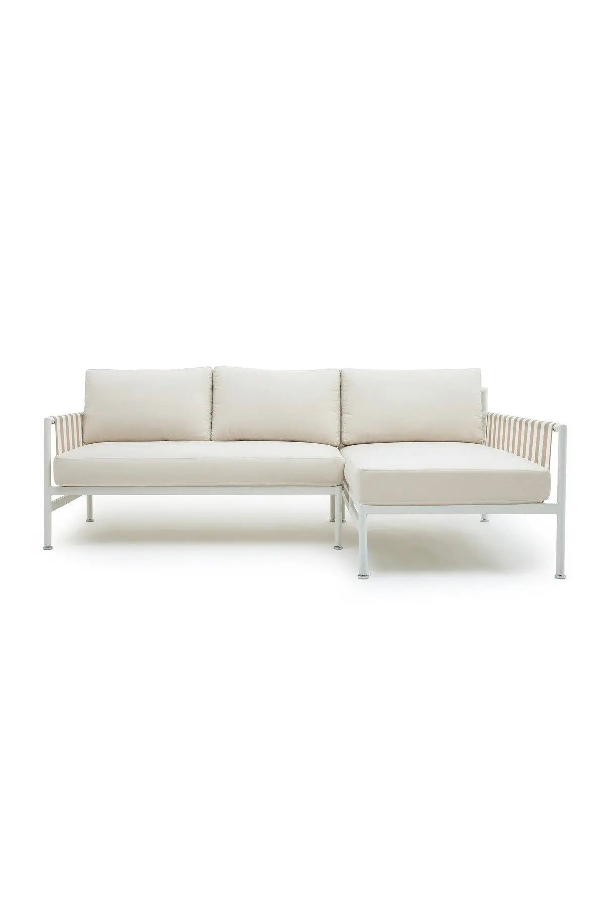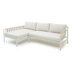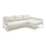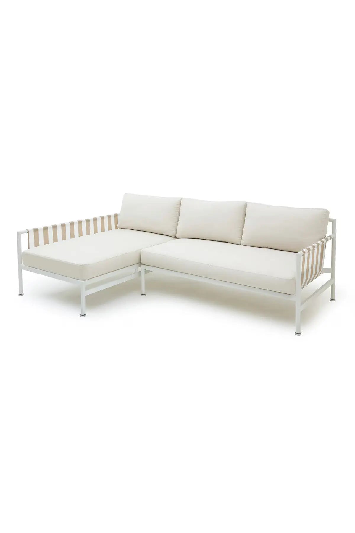 Meet the Dunes Cream Outdoor Sectional. Bring Riviera charm to your patio with this durable, rust-resistant aluminum armchair. Featuring UV-resistant fabric, reversible cushions, and high-density foam for comfort, it blends style with function. Adjustable levelers keep it steady on uneven surfaces.