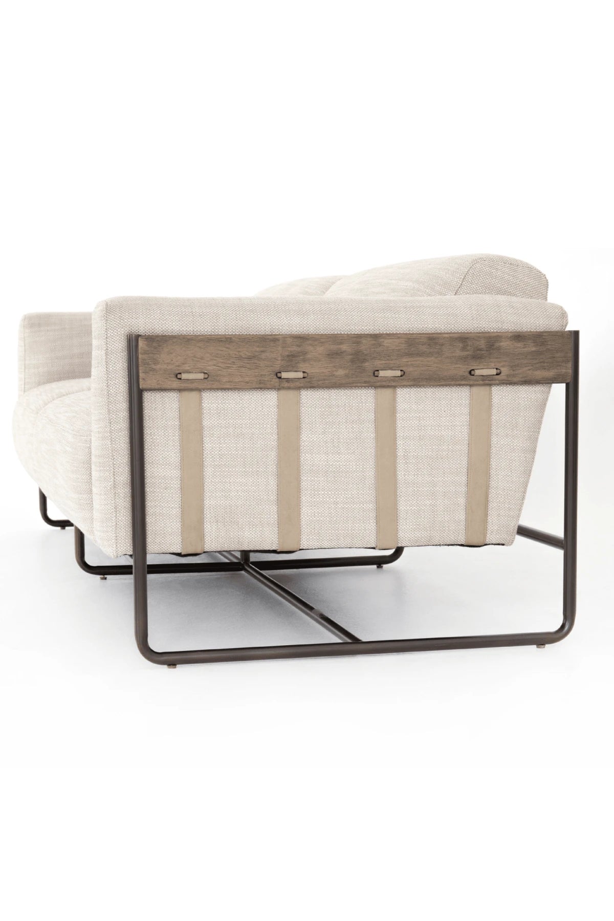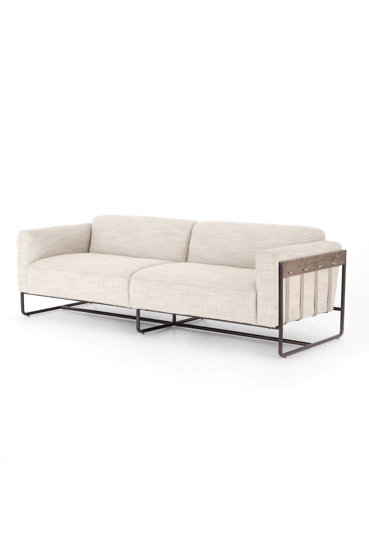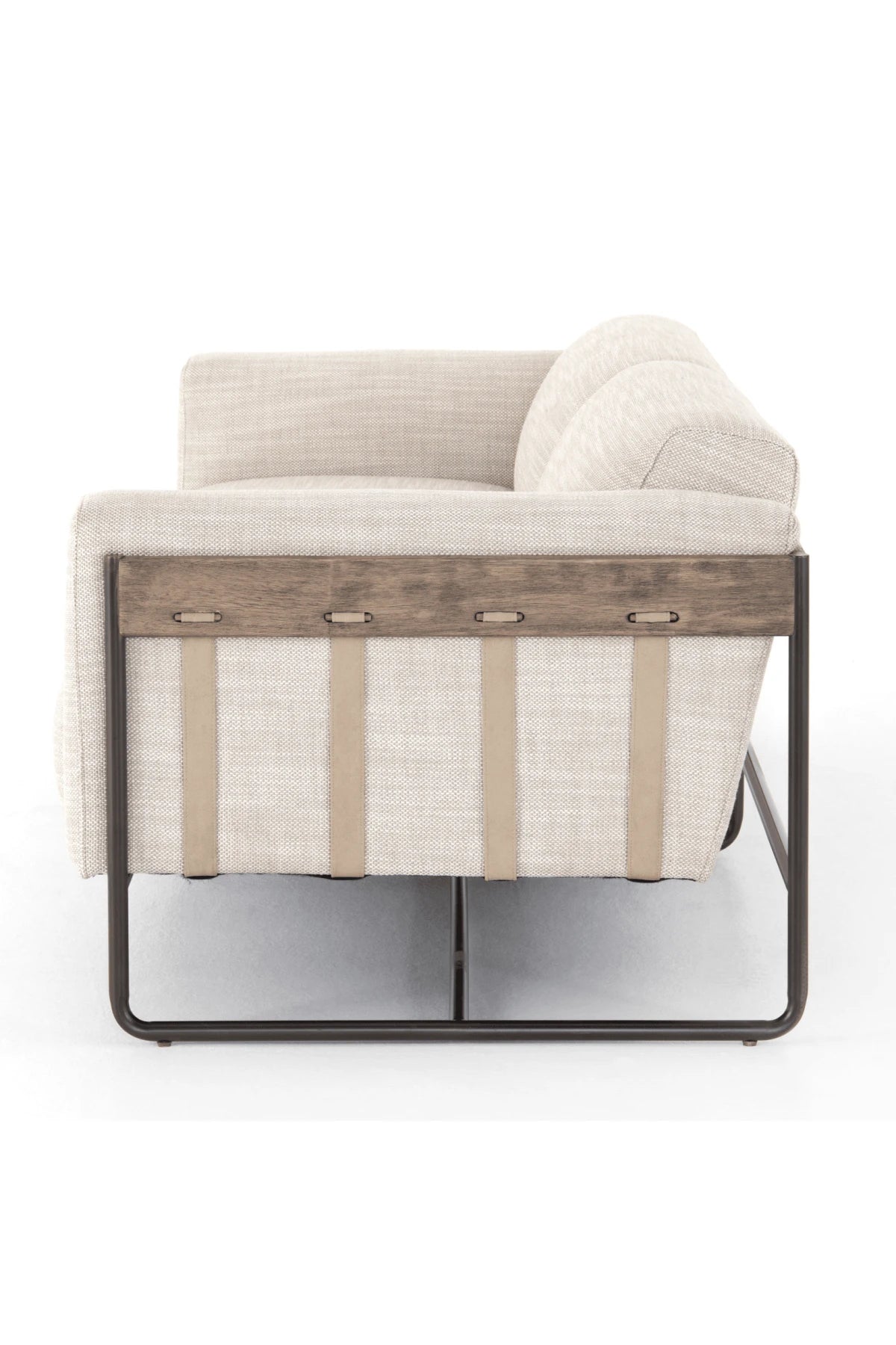 Neutral gone novel in the Ella Sofa. Taupe-colored upholstered seating is suspended by top-grain leather straps with handcrafted fastens, for an airy look. Solid Parawood paneling wraps the frame’s entirety, while a black iron base lends lightness and contrast.