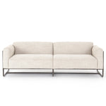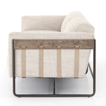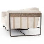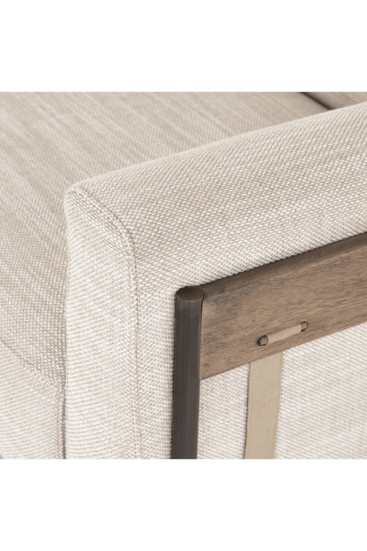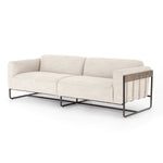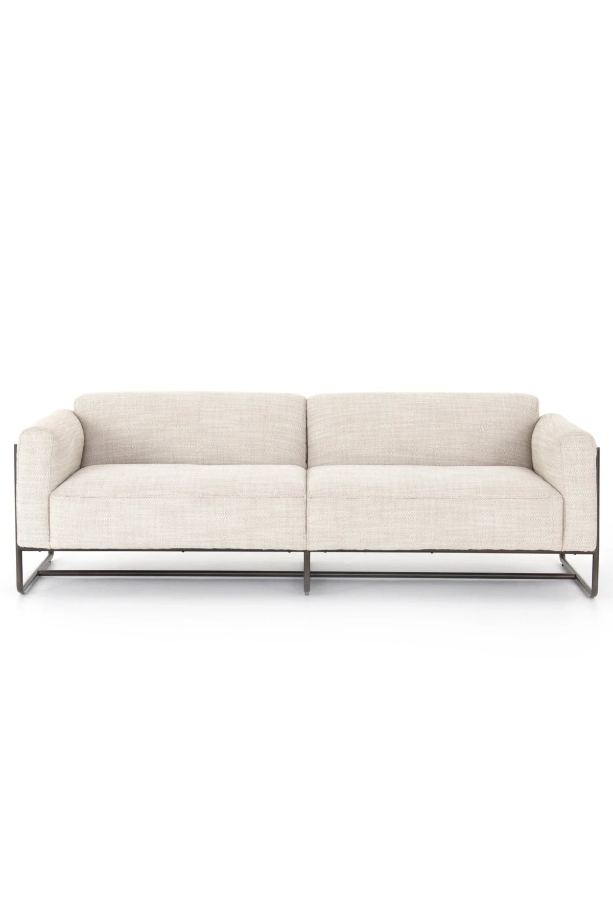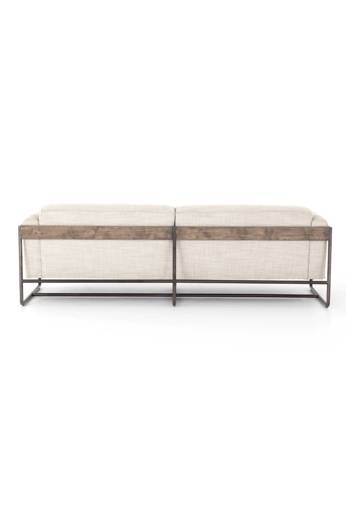 Neutral gone novel in the Ella Sofa. Taupe-colored upholstered seating is suspended by top-grain leather straps with handcrafted fastens, for an airy look. Solid Parawood paneling wraps the frame’s entirety, while a black iron base lends lightness and contrast.