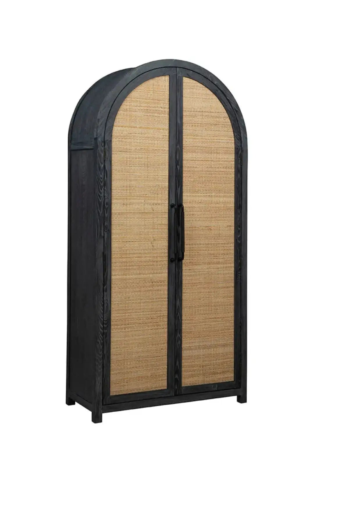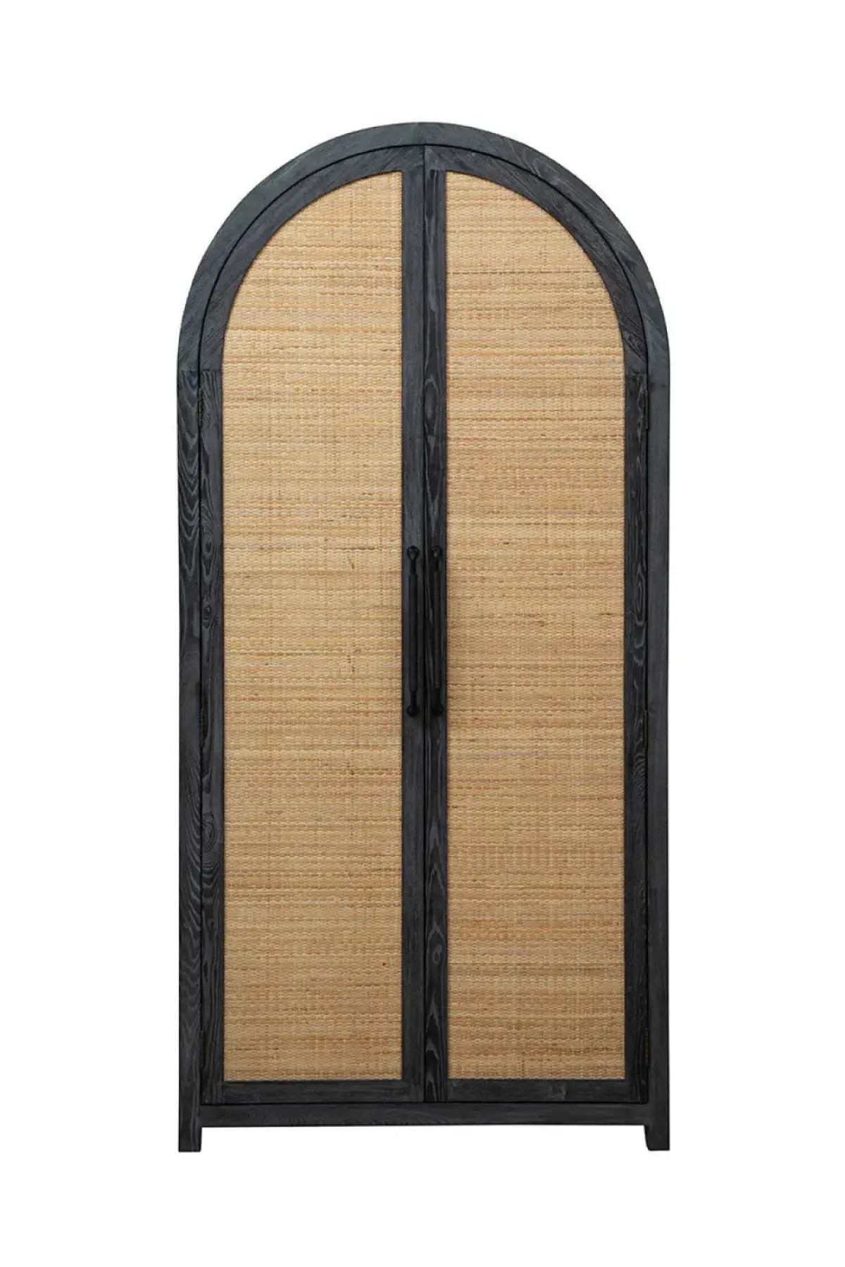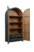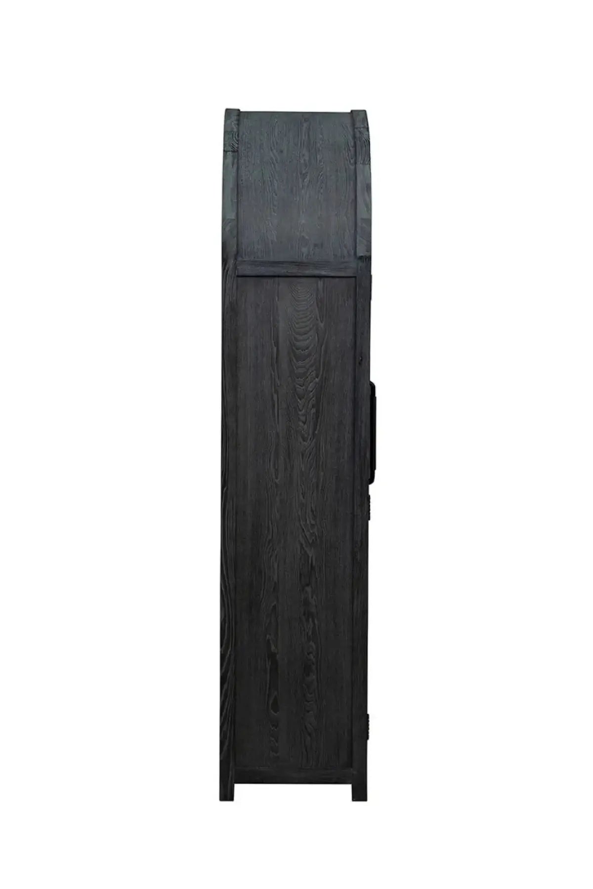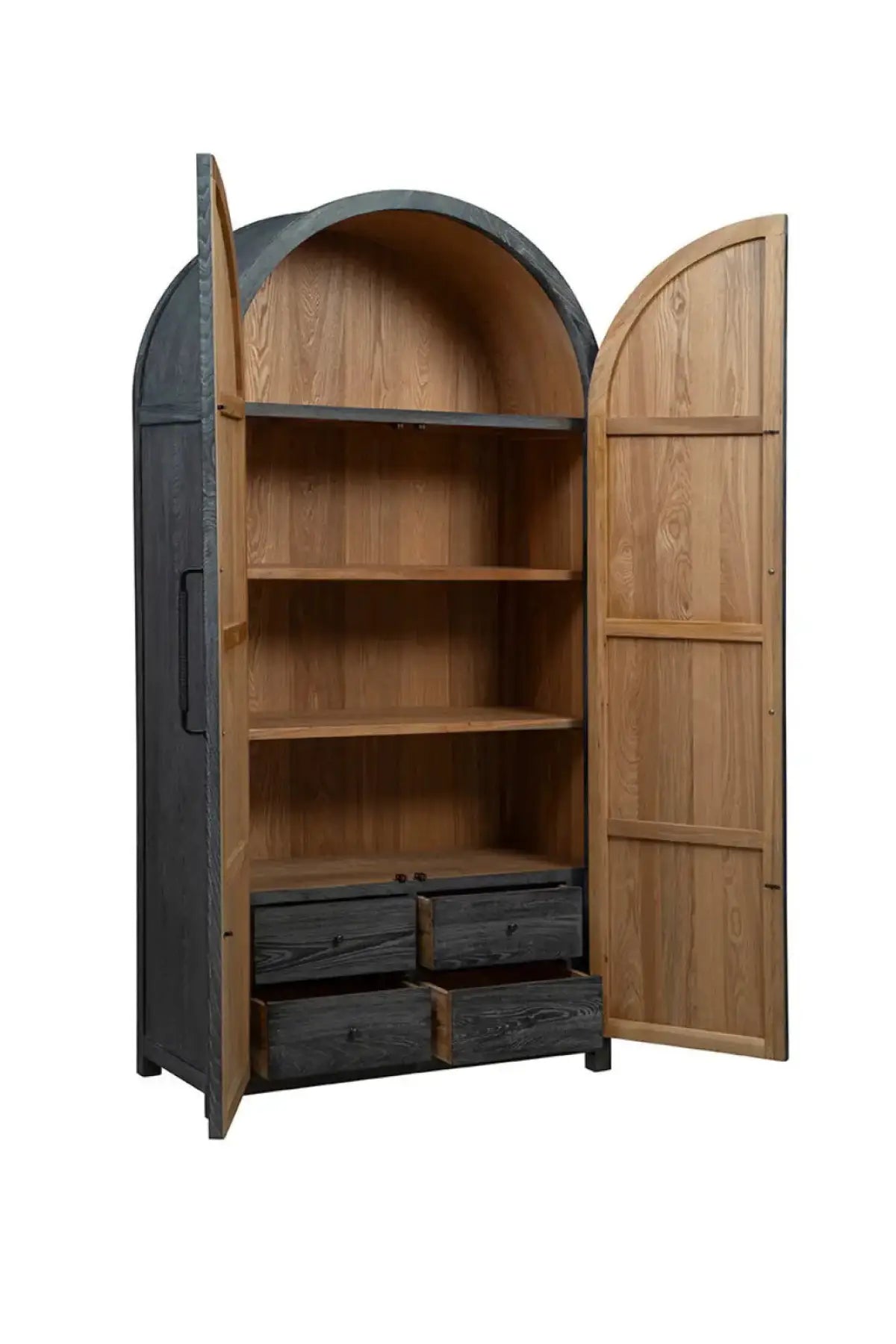 Meet the Eloise Cabinet. This cabinet is a uniquely designed tall dome-shaped cabinet offering generous storage space, featuring three shelves behind its doors and four drawers at the bottom for optimal organization. Crafted from solid wood with a rich deep gray finish, this cabinet gives off a sense of casual elegance.