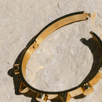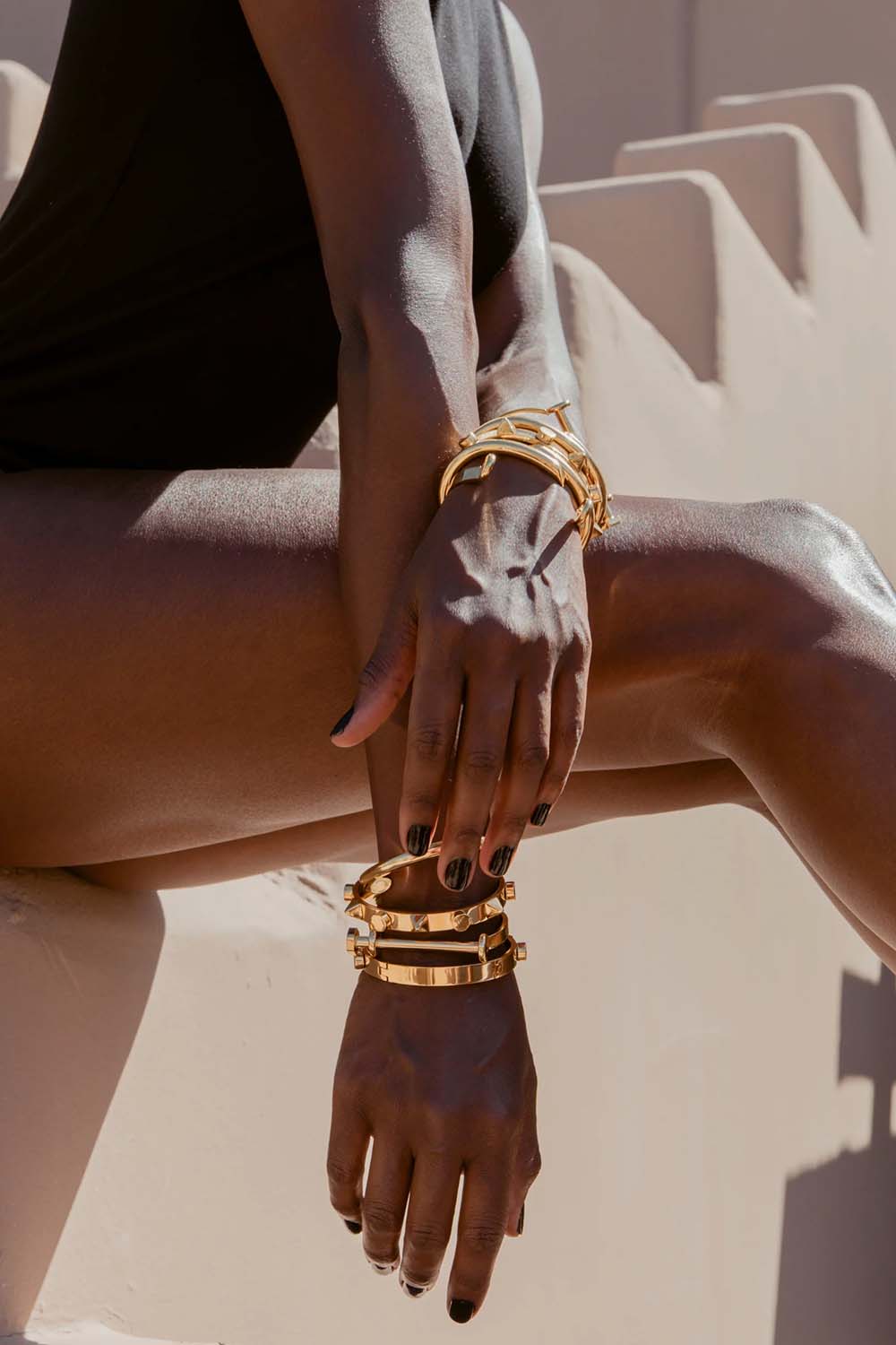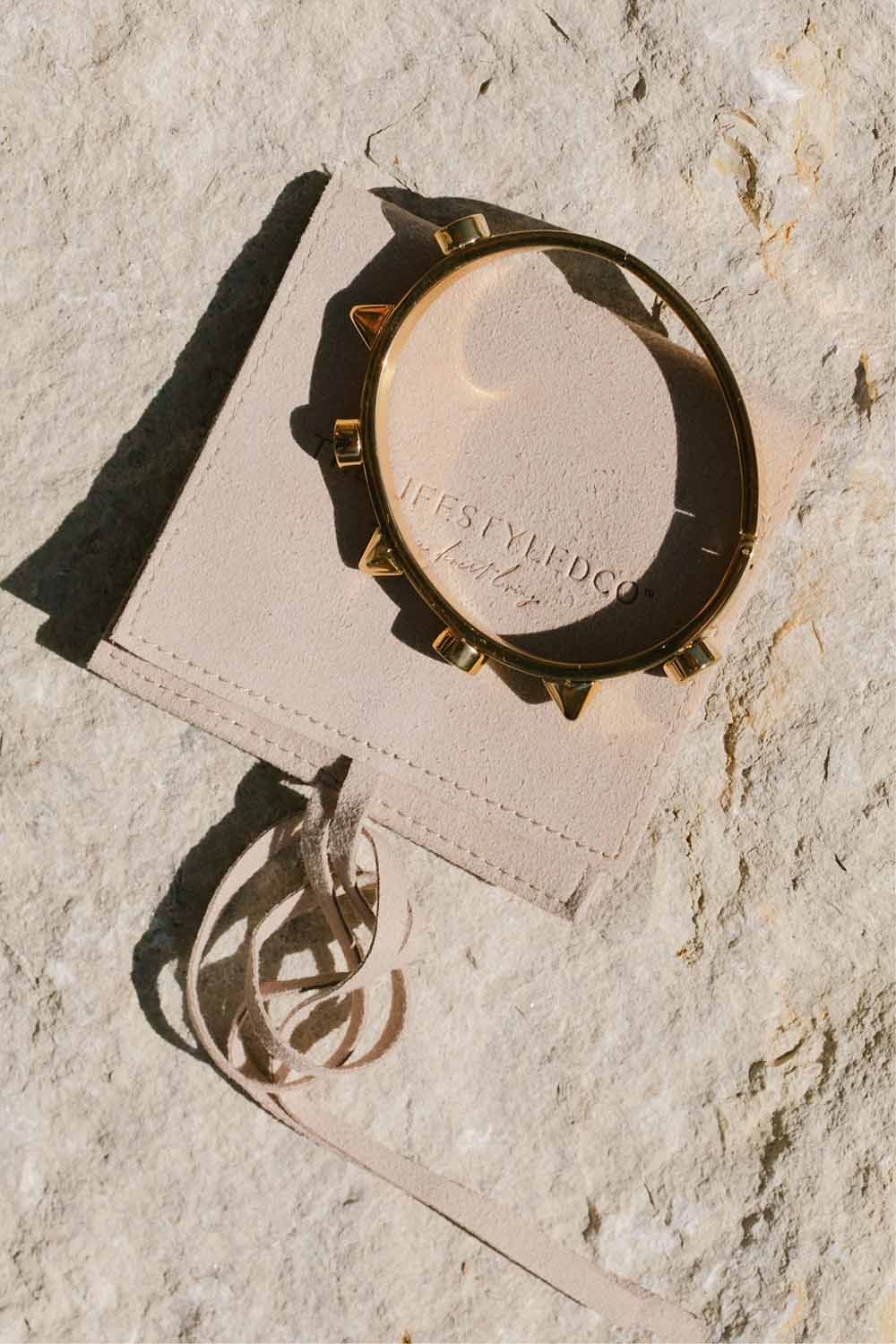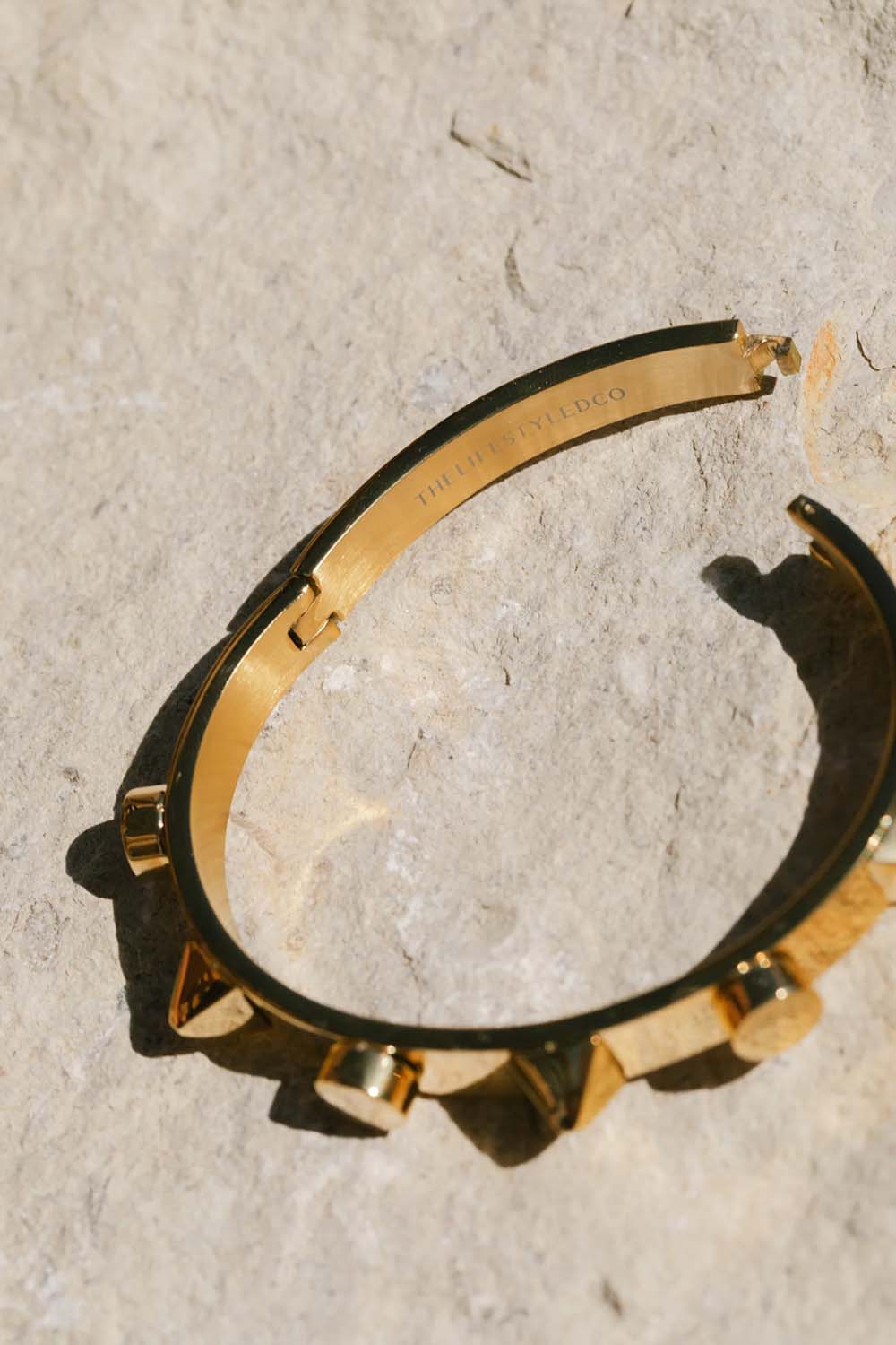STYLE AND FIT NOTES: Our Ember Studded Bracelet is the cuff that is SURE to make a statement! Crafted with utmost precision and paired with a high shine gold finish for that ultra chic look. Circular and pyramid studs add an edgy element to this piece! Take one or stack multiple together - the more the merrier!