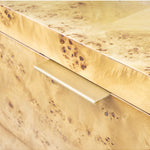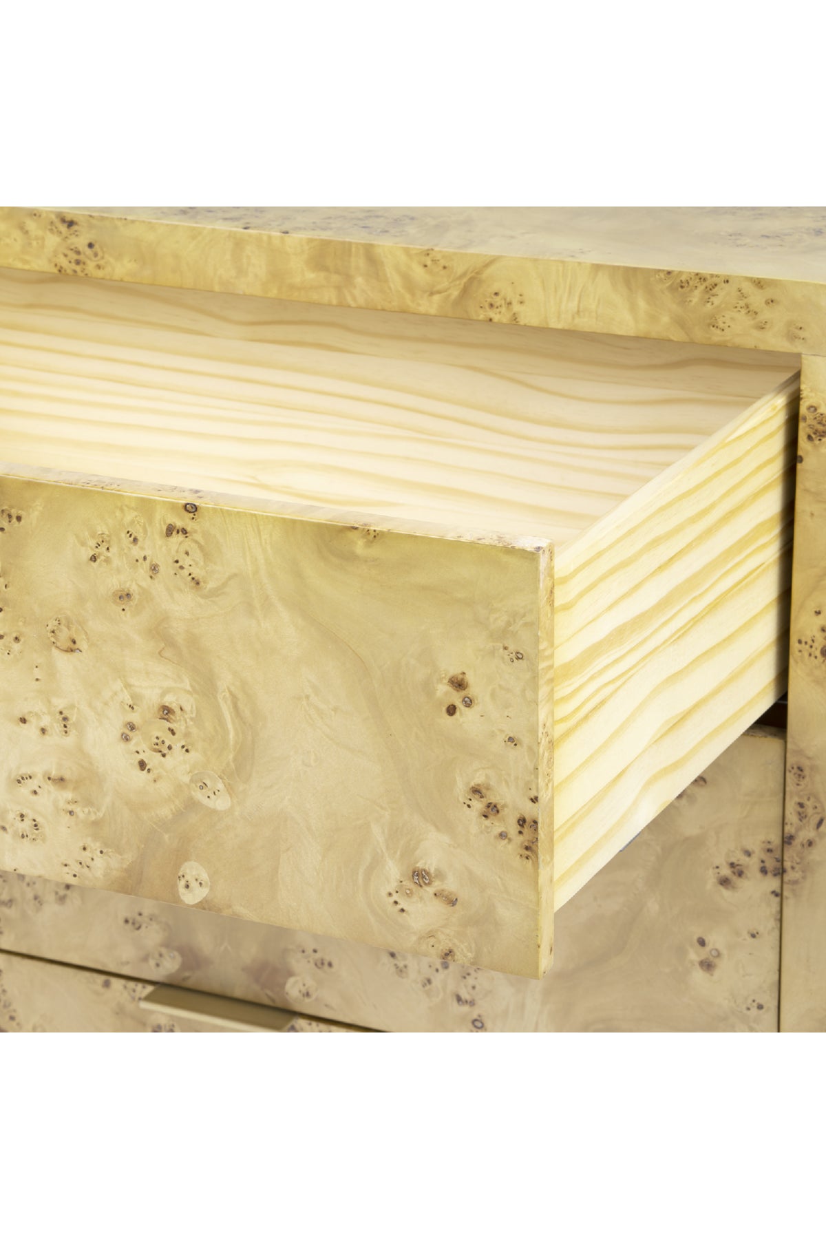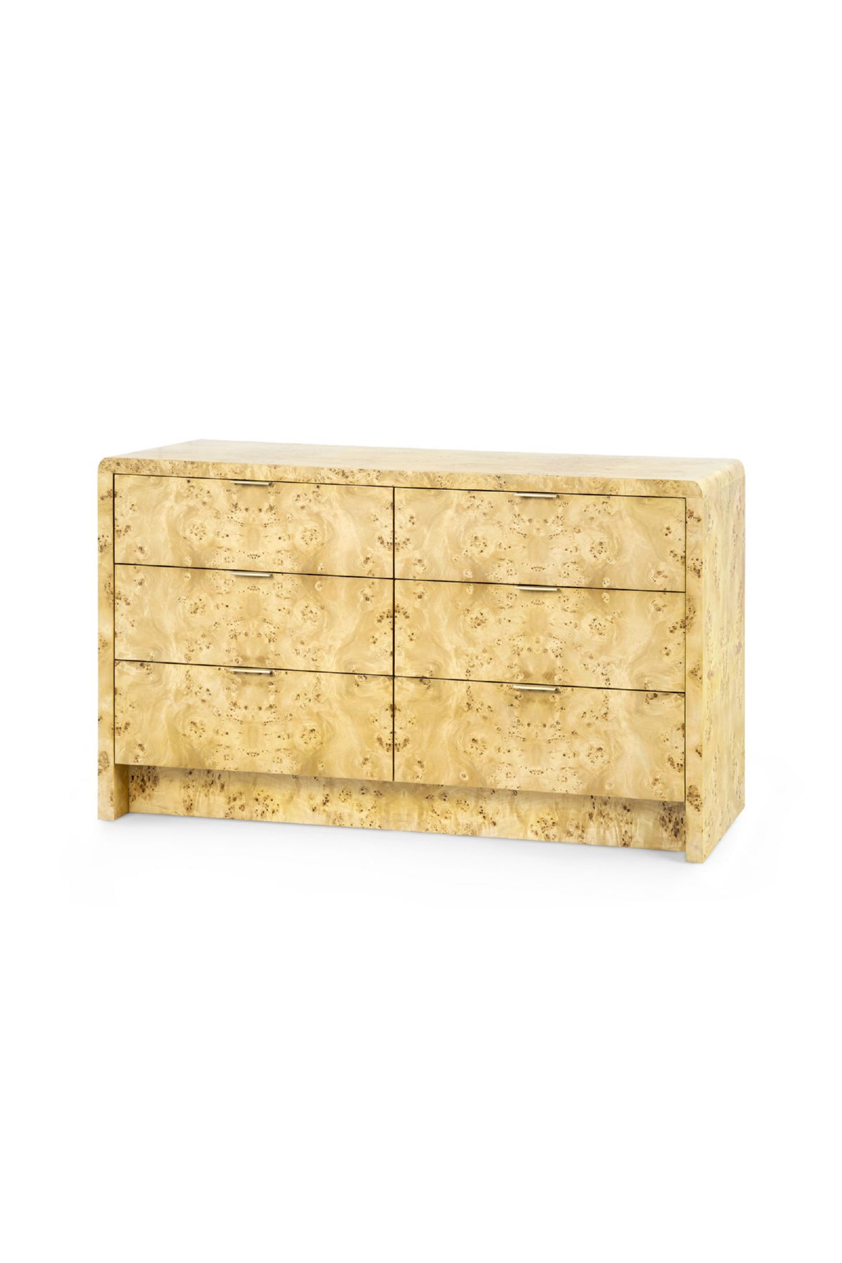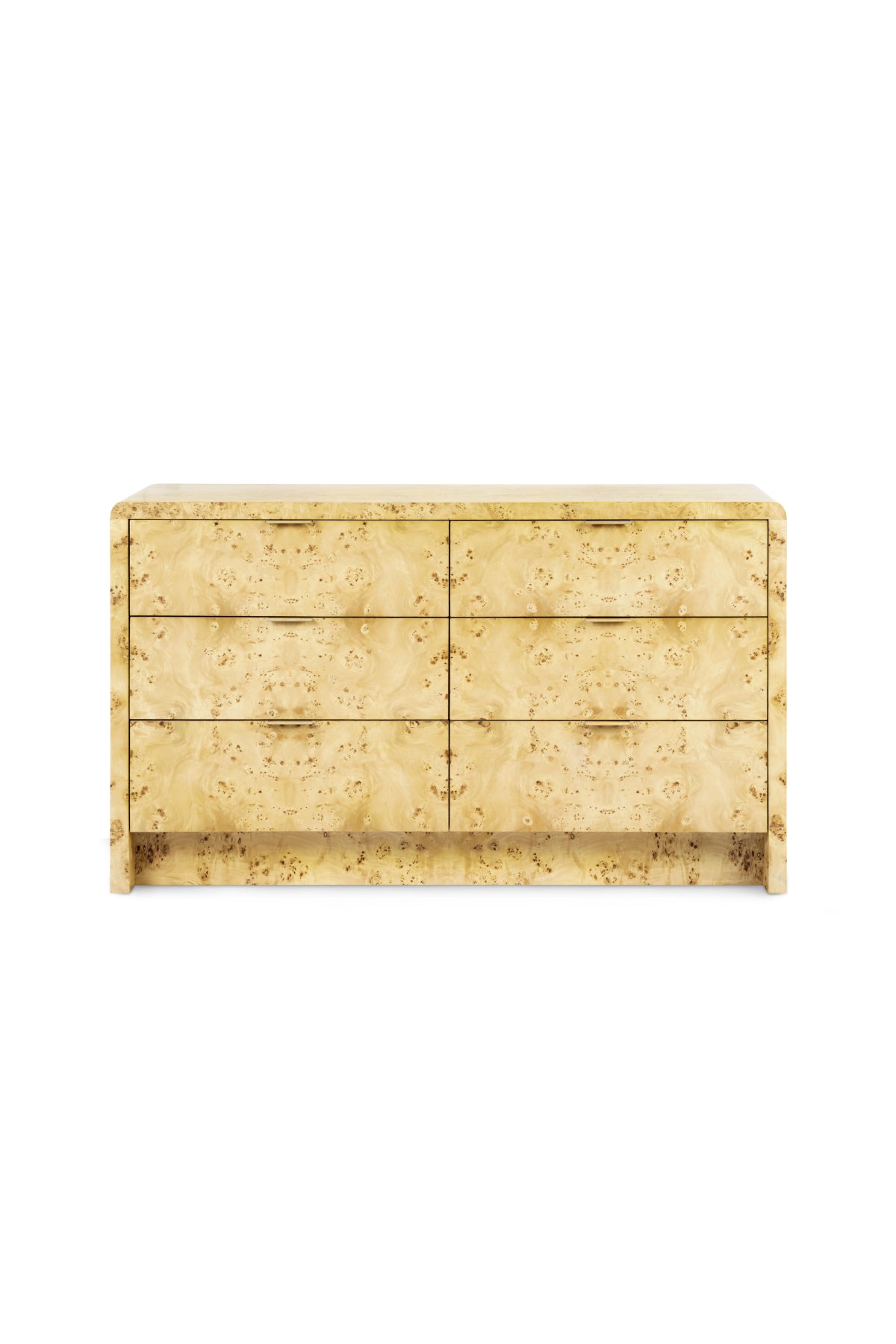 Meet the Emil 6-Drawer Dresser. The naturally vibrant patterns found in burl wood have a distinctively 1970s feel—all kaleidoscopic swirls with a bold sense of cool. The Emil Dresser epitomizes timeless chic. Its seamless, curved design pays homage to the beloved vintage waterfall table style, housing six spacious drawers adorned with brushed brass edge pulls.