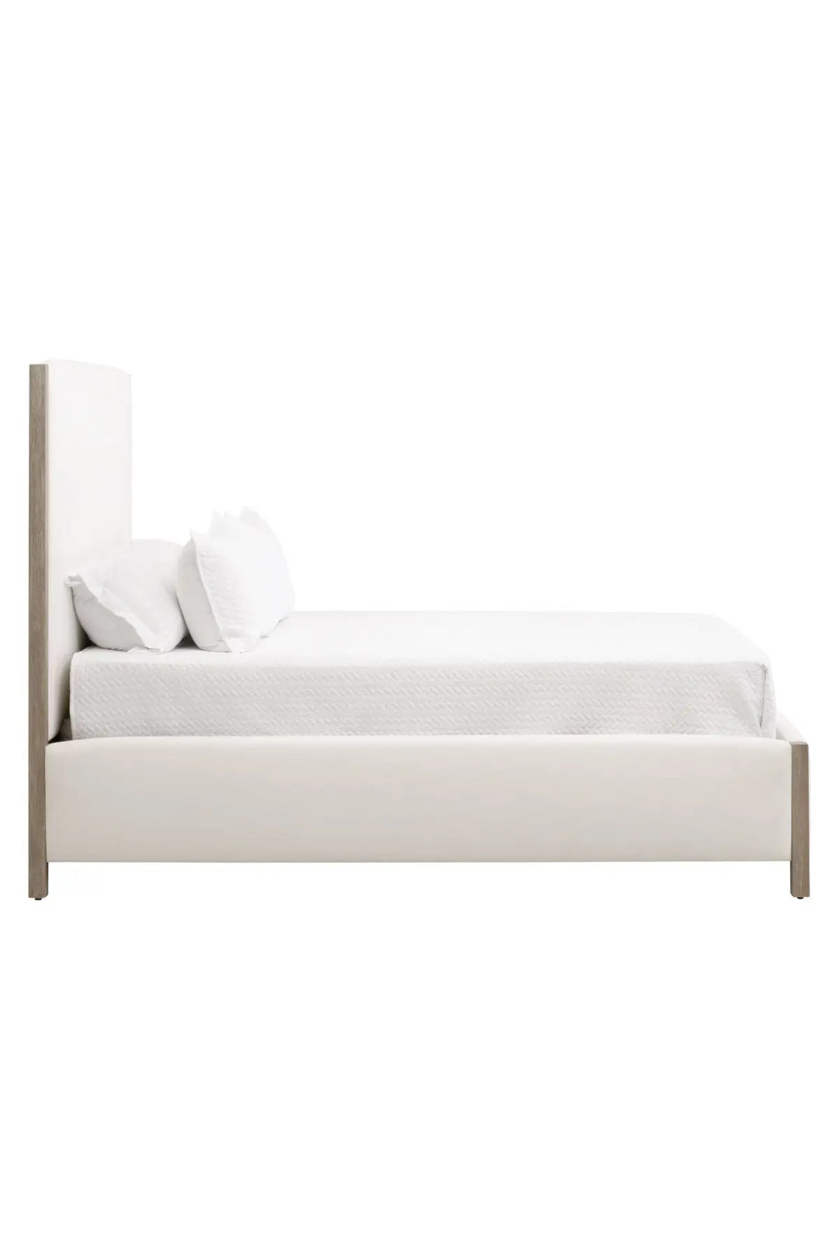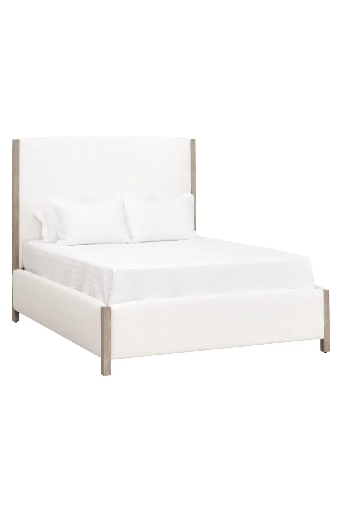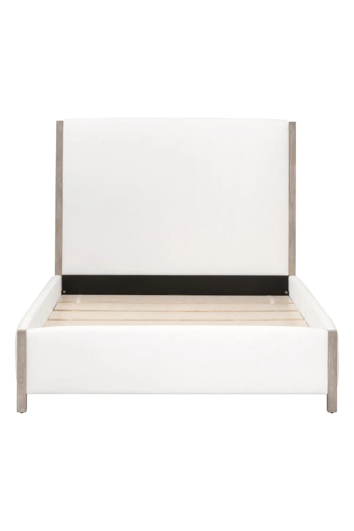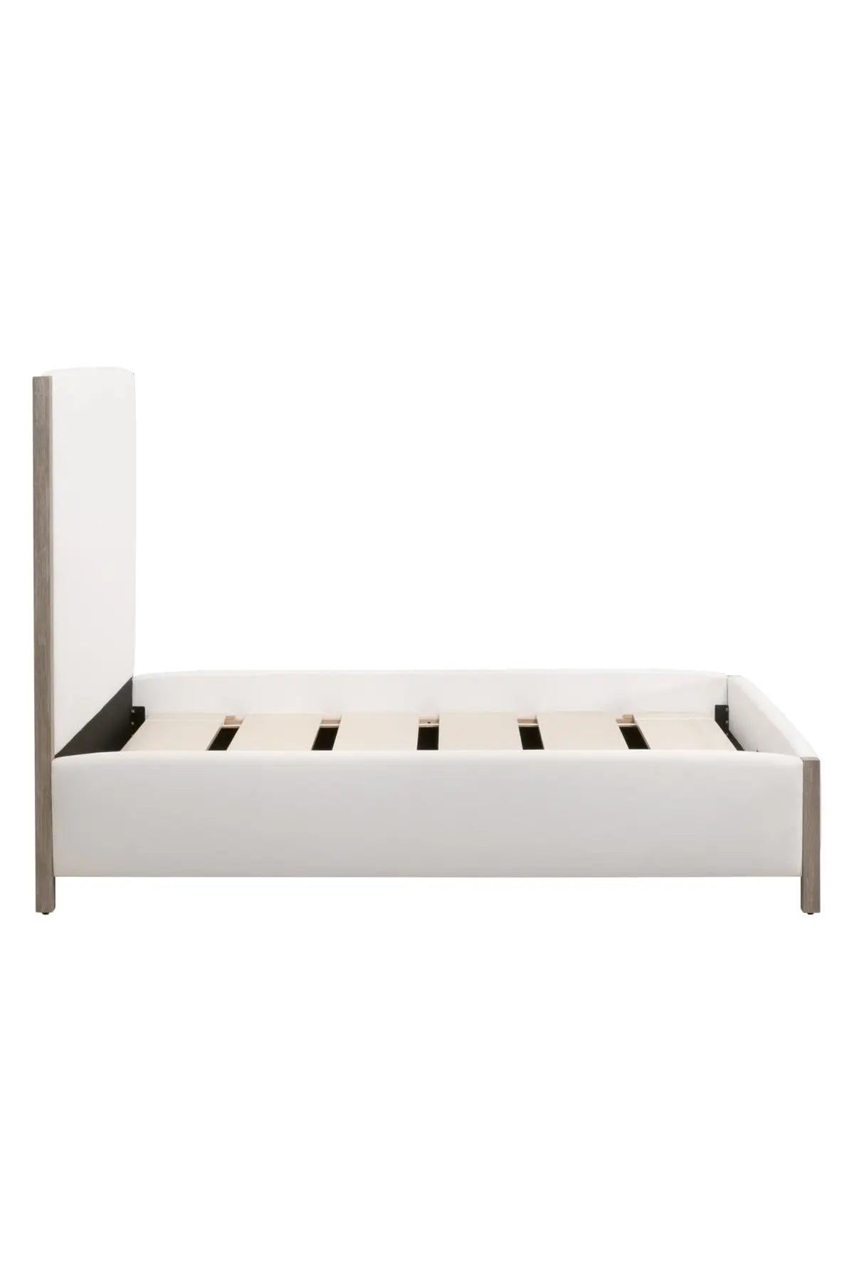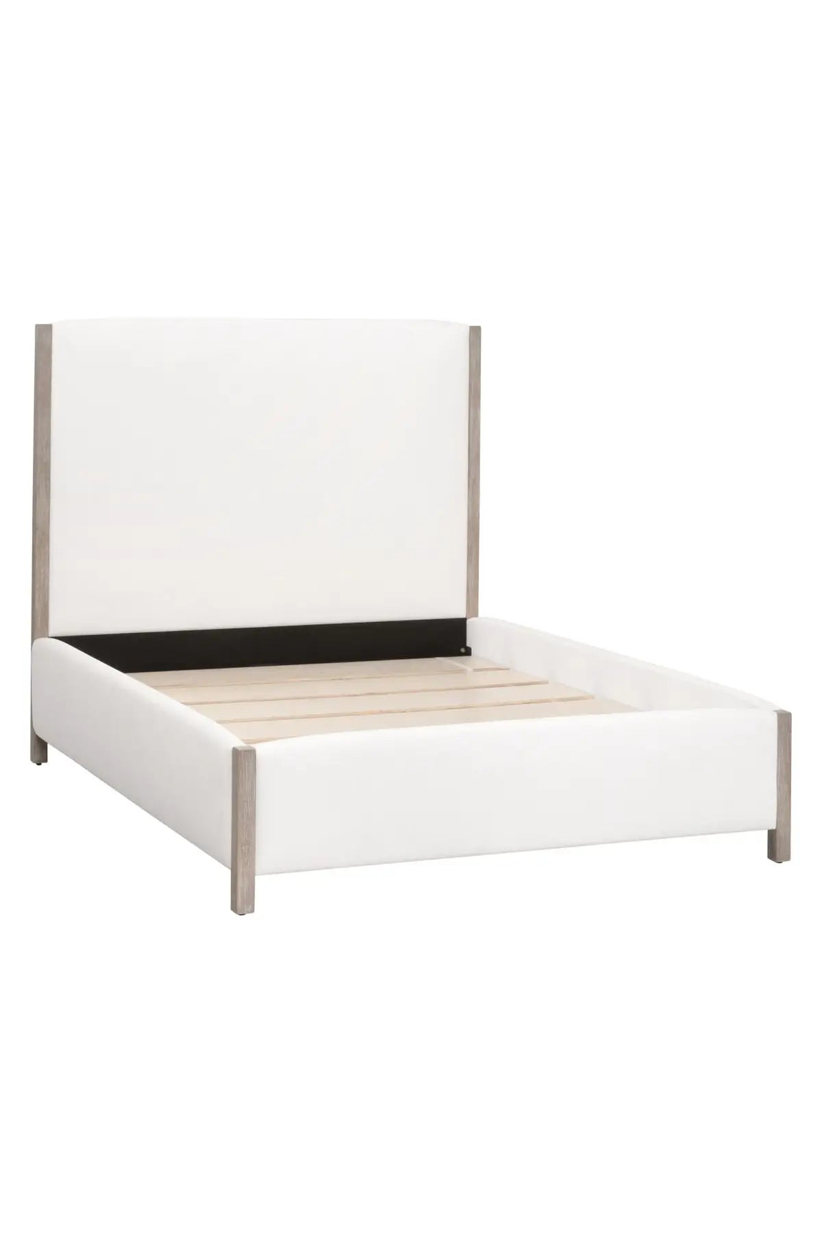 Meet the Emmett Bed. Transform your bedroom with this elegant bed, crafted with a sturdy frame. The headboard and rails are upholstered in durable high performance fabric or vegan leather. Comfortable foam cushioning provides exceptional support and timeless design. Slats included.