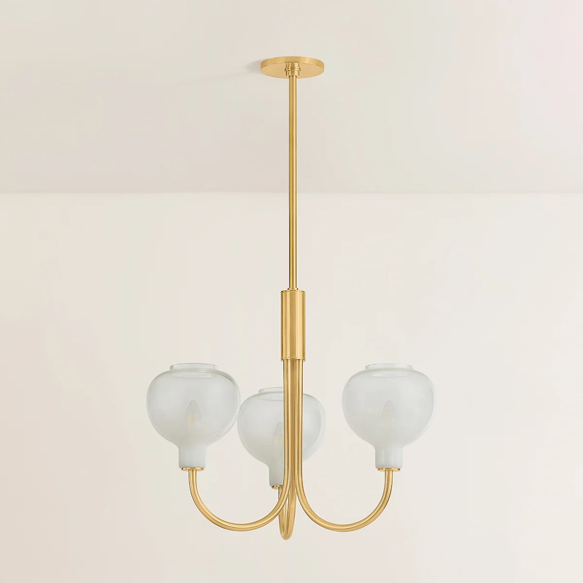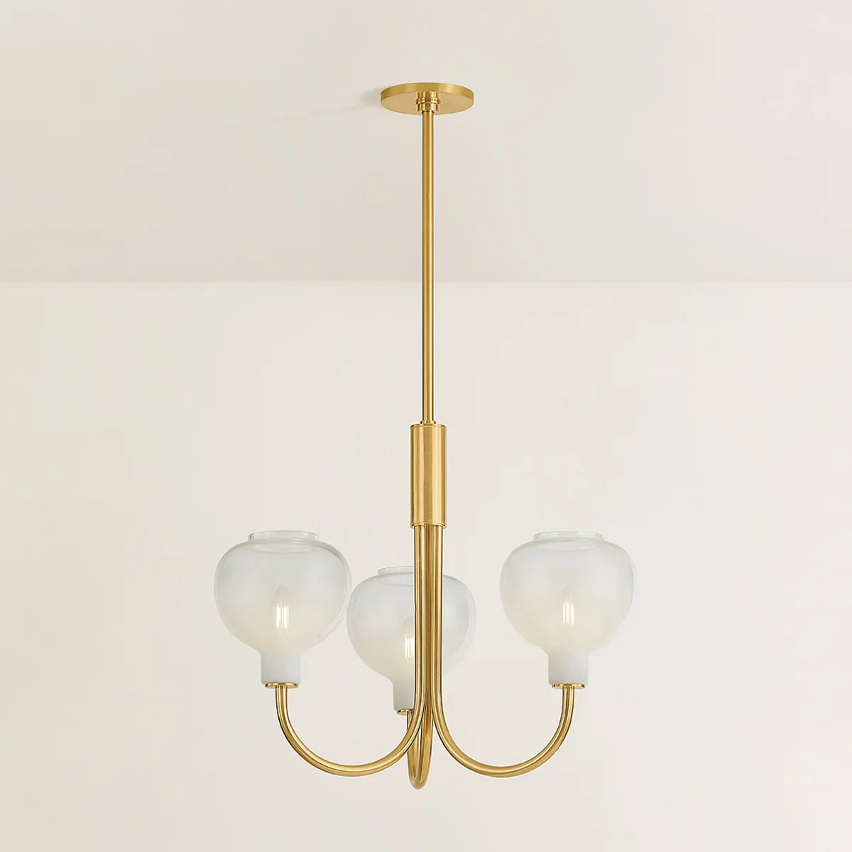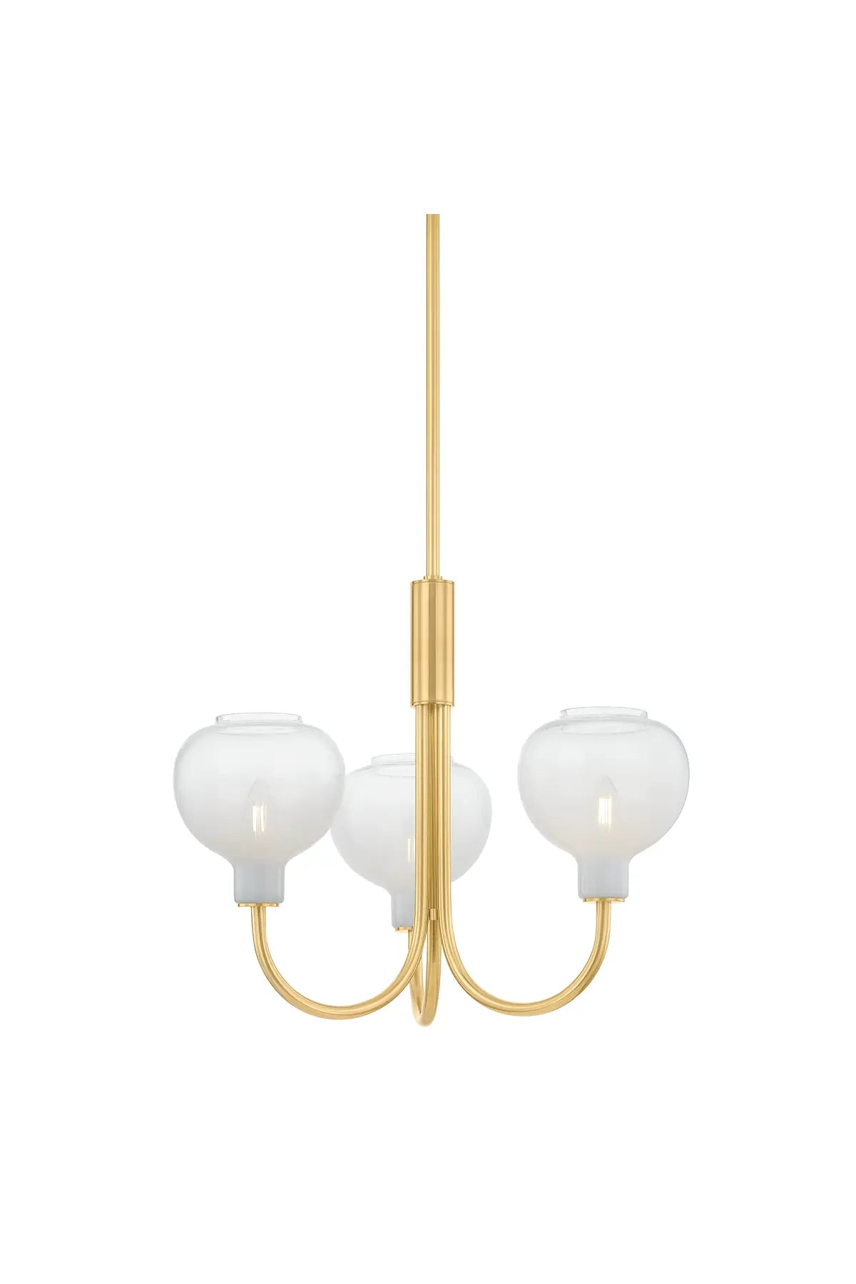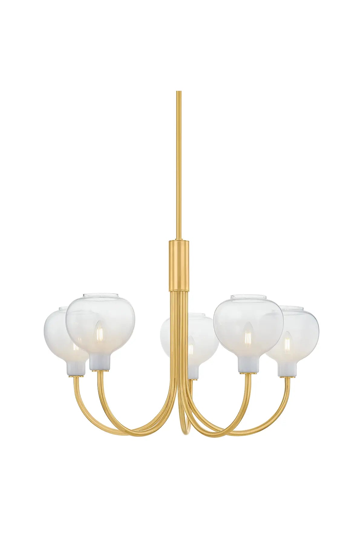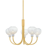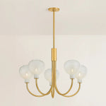 At the intersection of transitional and modern design, the Estelle Chandelier features relatable silhouettes with striking glasswork. The elongated J-arms arc upwards to support naturally rounded glass shades. Combining the cloudy Sfumato glass with classic Aged Brass metalwork results in a warm, inviting lighting experience. Bulb(s) not included.
