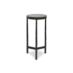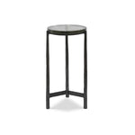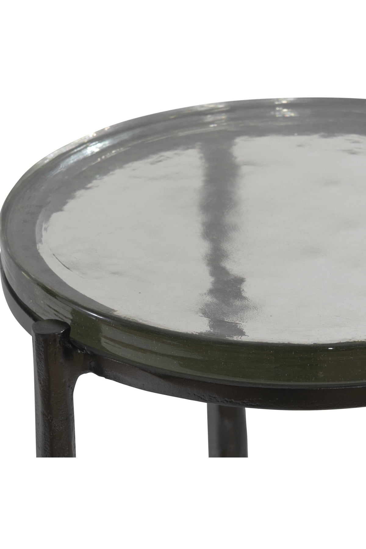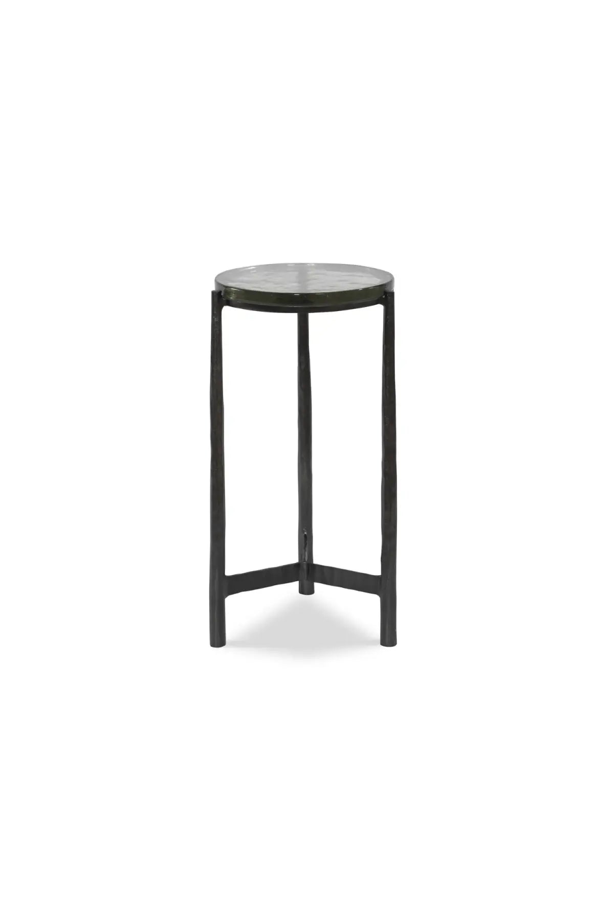 Meet the Eternity Accent Table. This universal accent table blends with virtually any style. The chiseled cast aluminum base is finished in dark gunmetal and is accented by a thick textured art glass top.