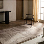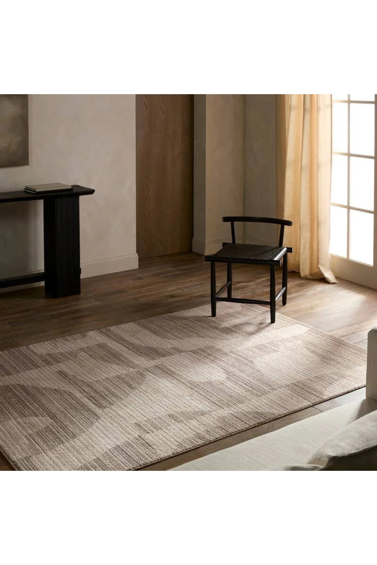 Meet the Eva Rug. The Eva collection adapts to any ae thetic and matches any mood. Its modern geometric pattern and tonal light and dark beige hues effortlessly add visual interest to any room. Polyester is power loomed with variegated yarn to look like wool-- without the price tag. Samples are modeled at our North Scottsdale/Phoenix location.