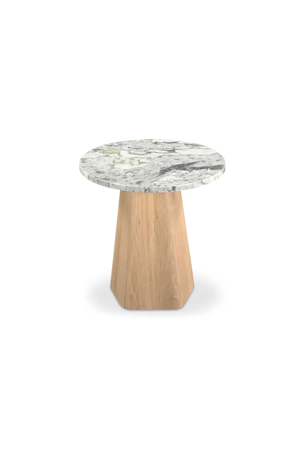 The Evelyn Accent Table is a harmonious contrast of materiality and tactility, where a weighty base meets a visually light marble top. With five connected sides equipped with softened, rounded edges, the base assumes an organic appearance, its natural color subtly softening the marble top for enduring visual appeal.
