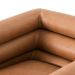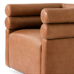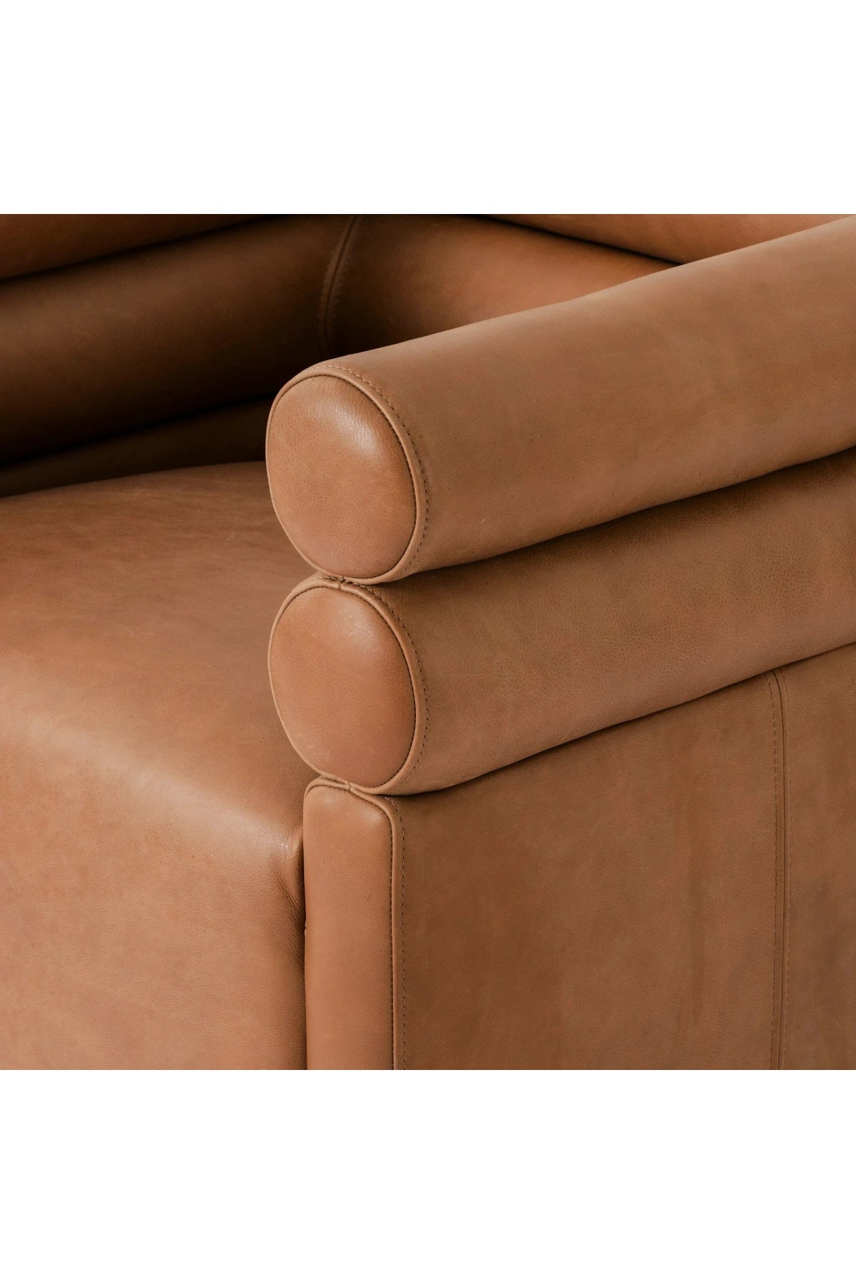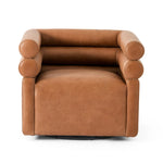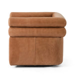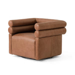 Meet the Evie Swivel Chair. Atop a 360-degree swivel, cleanly shaped seating is upholstered in cream-colored high-performance fabric or cognac-colored top-grain leather, for a sensible spin on modern styling.