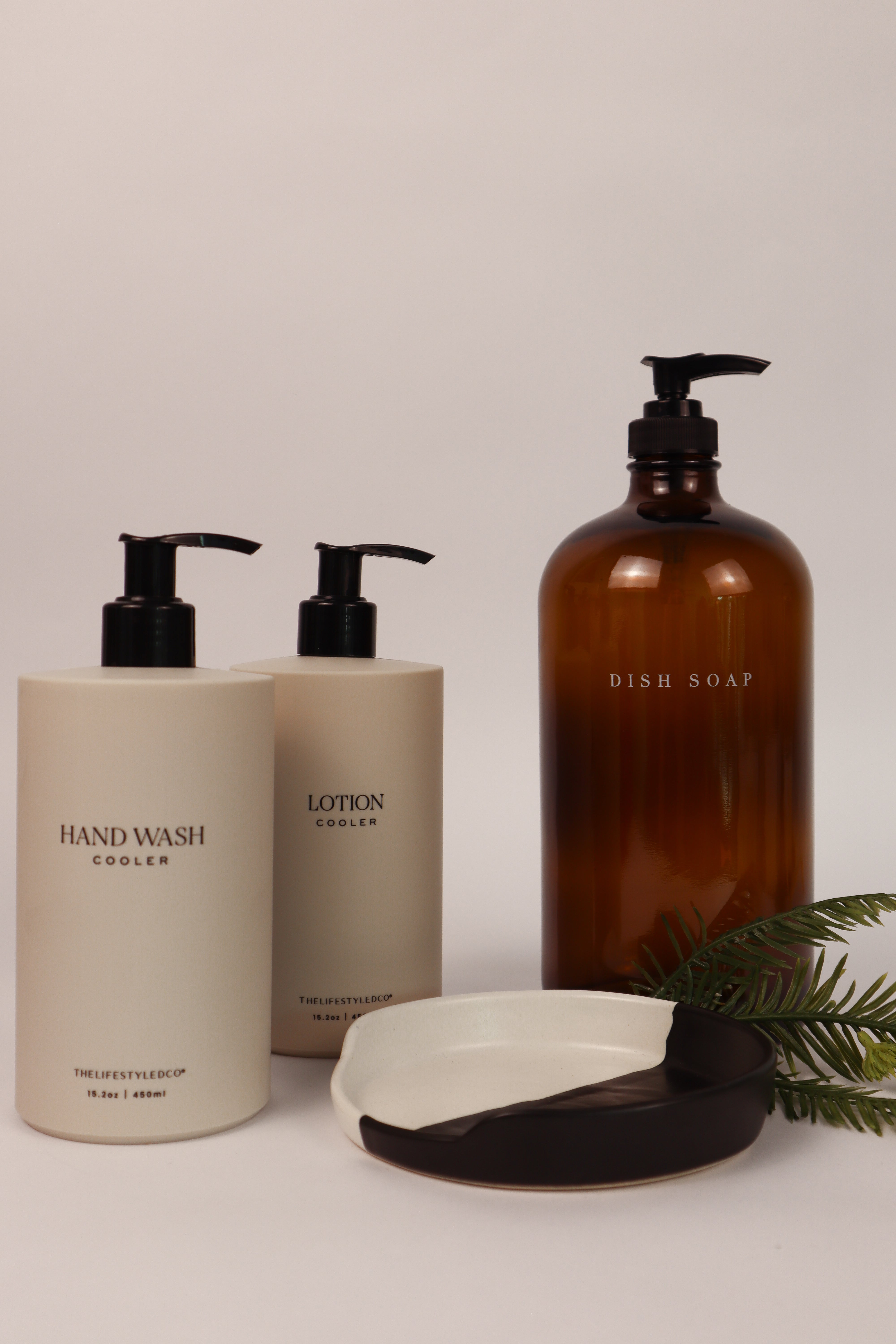 Each set includes our Glass Amber Liquid Pump (Dish Soap), Dawson Spoon Rest, Woven Candle, Cooler Hand Wash, and Cooler Lotion.