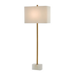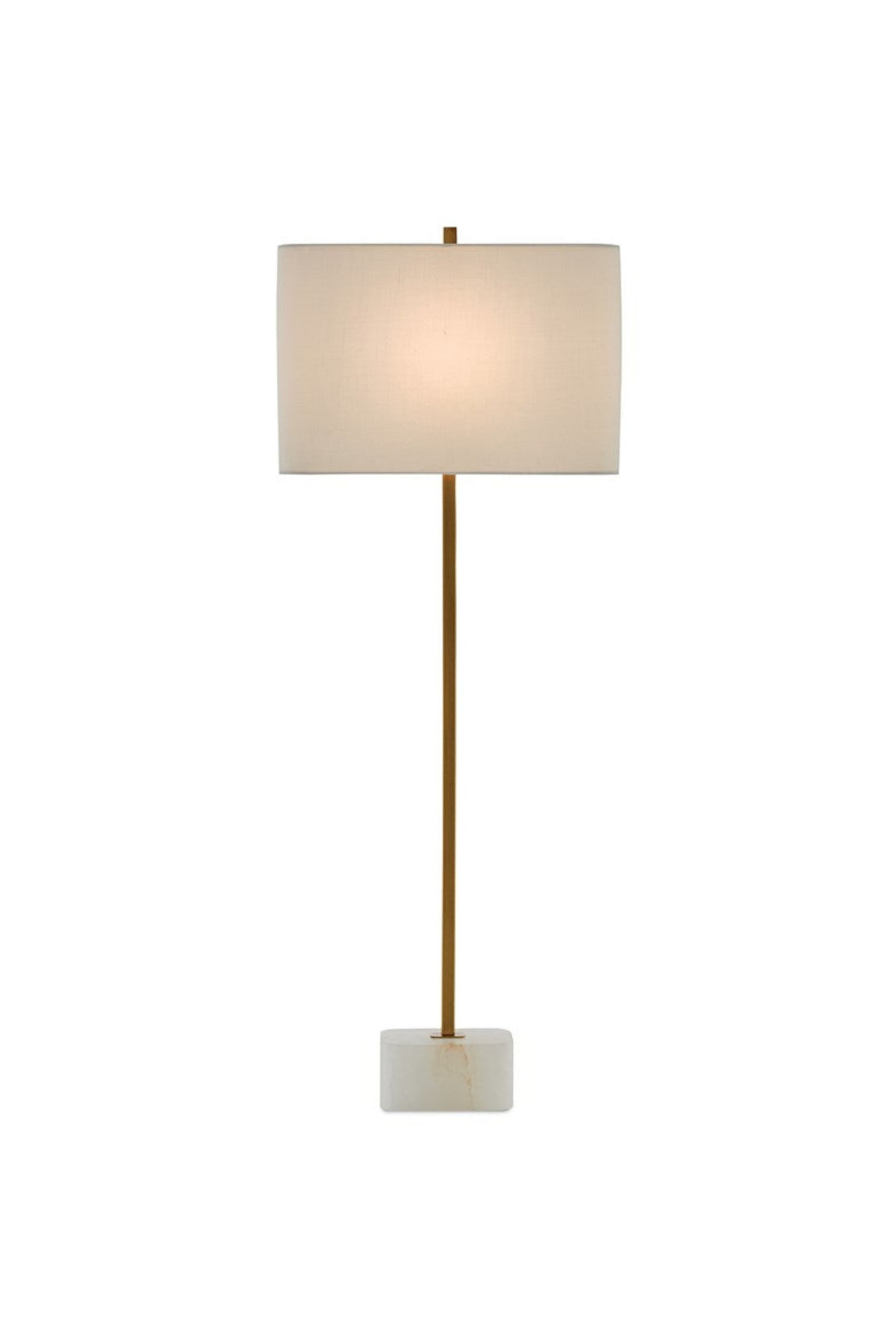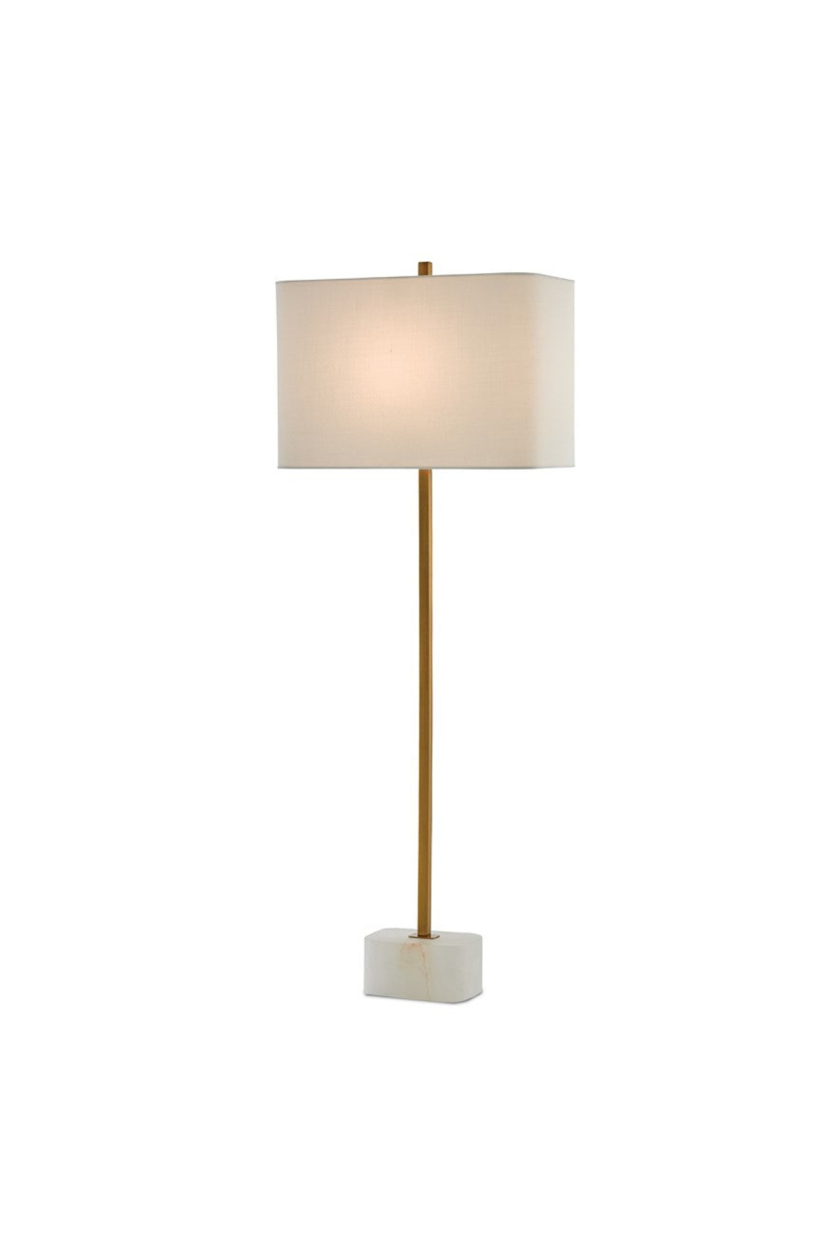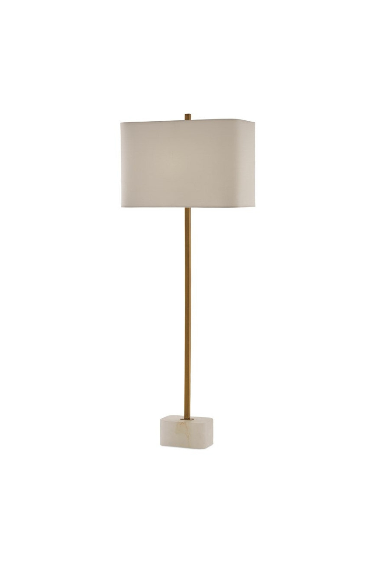 Our Felix Brass Table Lamp is a minimalistic composition with a thin metal spike rising from the natural alabaster base in an antique brass finish. The metal, which includes the matching finial, mimics the tones in the veining on the stone, and the gold lamp is fitted with a rectangular off-white linen shade. Bulb(s) not included.