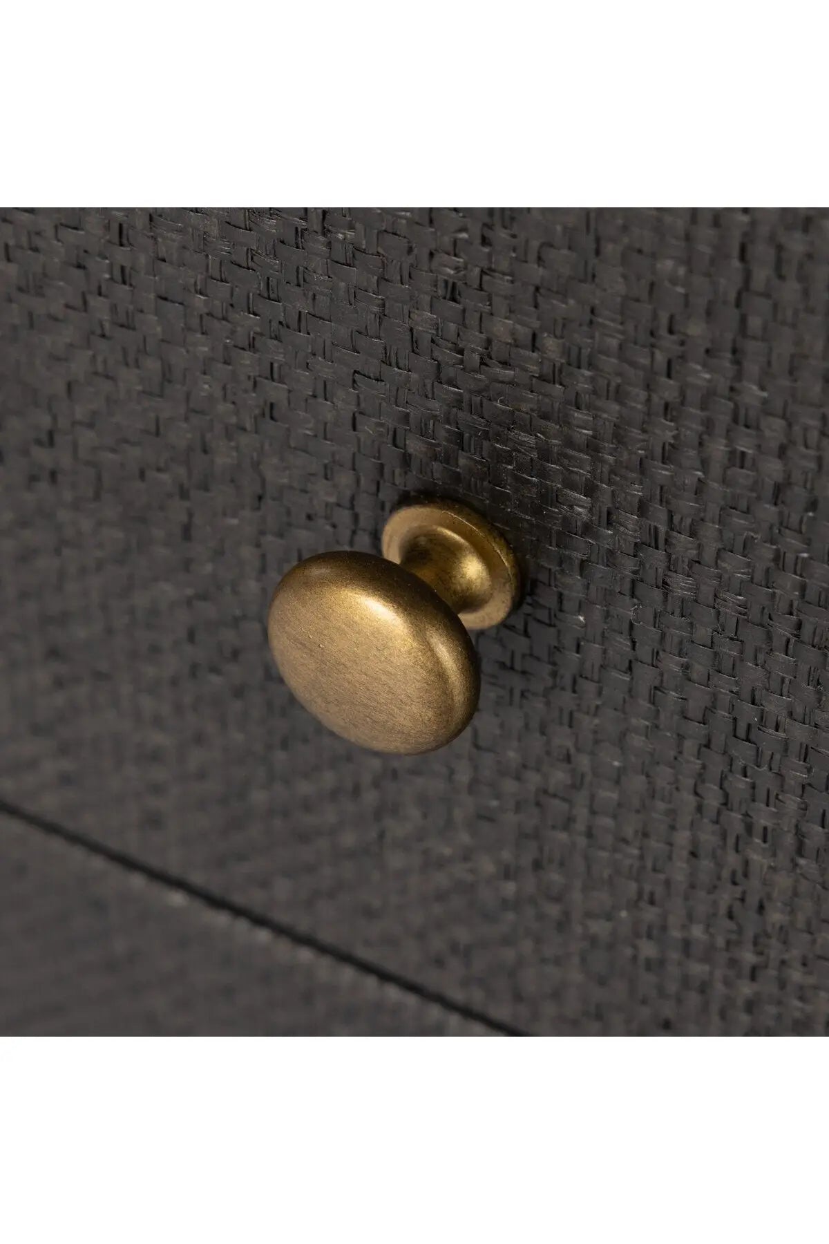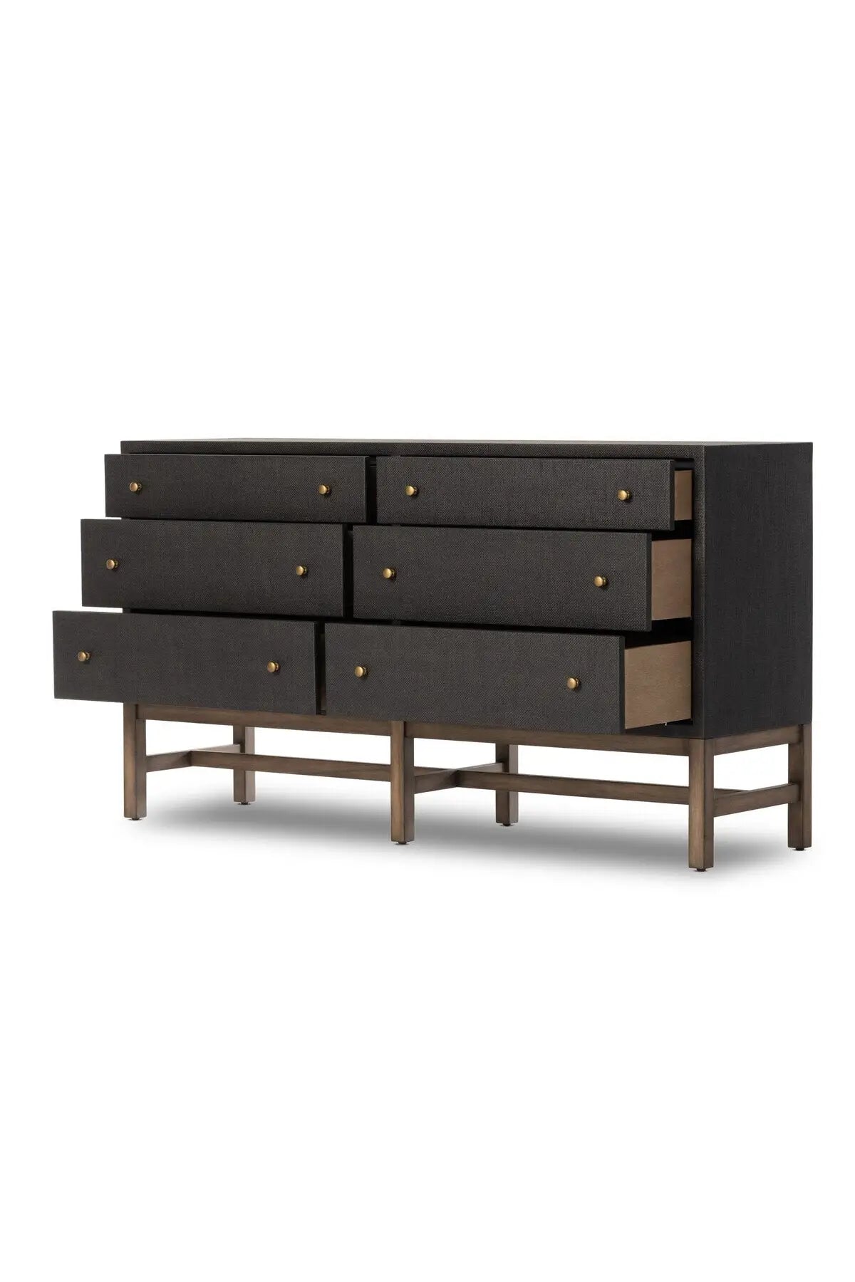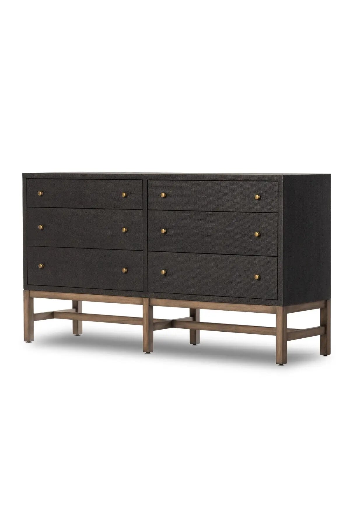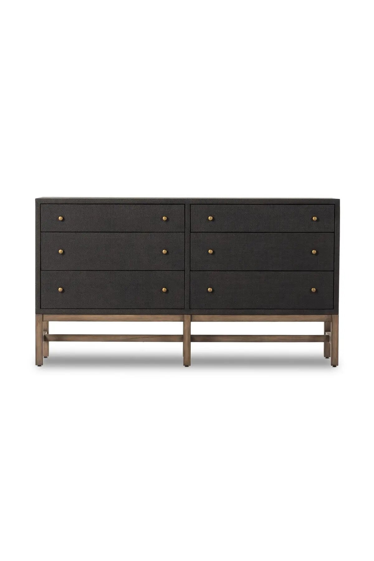 Meet the Fiona 6 Drawer Dresser. Woven black raffia offers a texture-driven take on bedroom storage. Antique brass-finished iron hardware adorns six spacious drawers, all supported by a solid mahogany base.