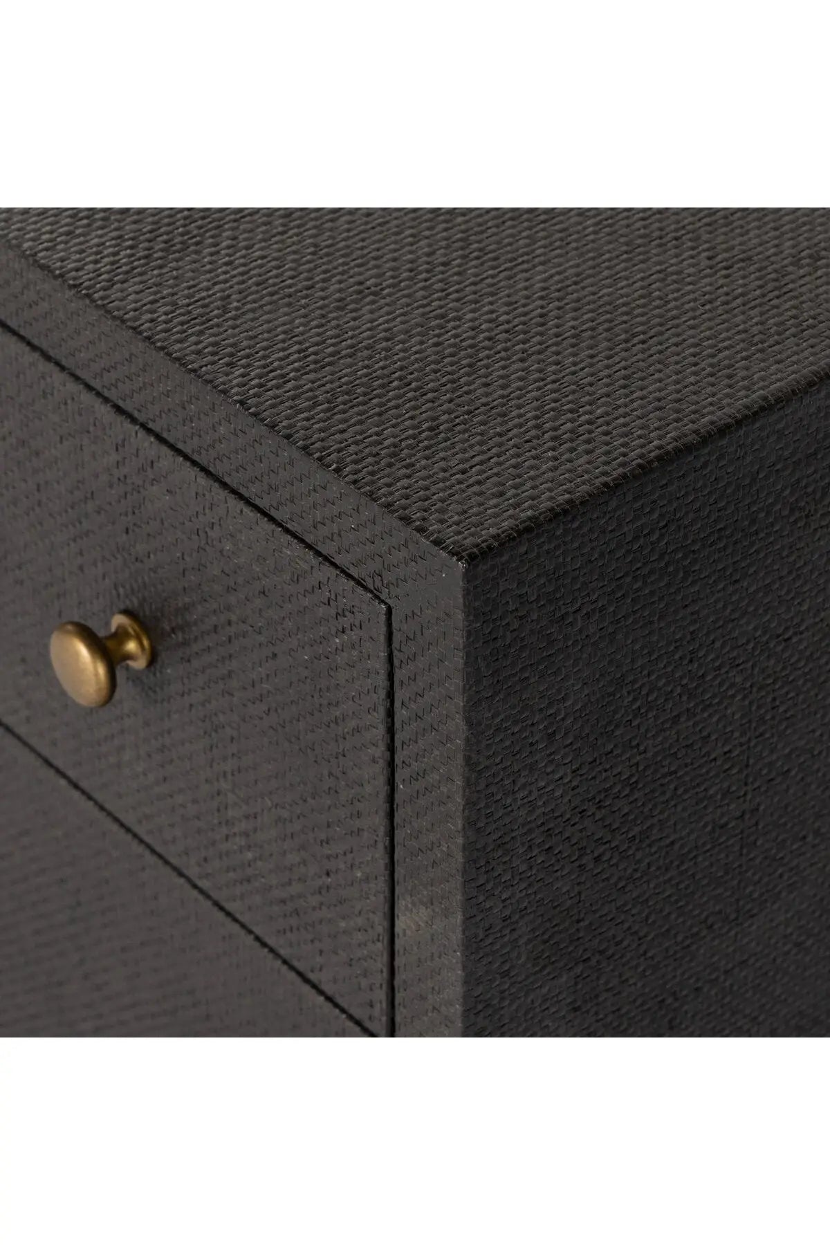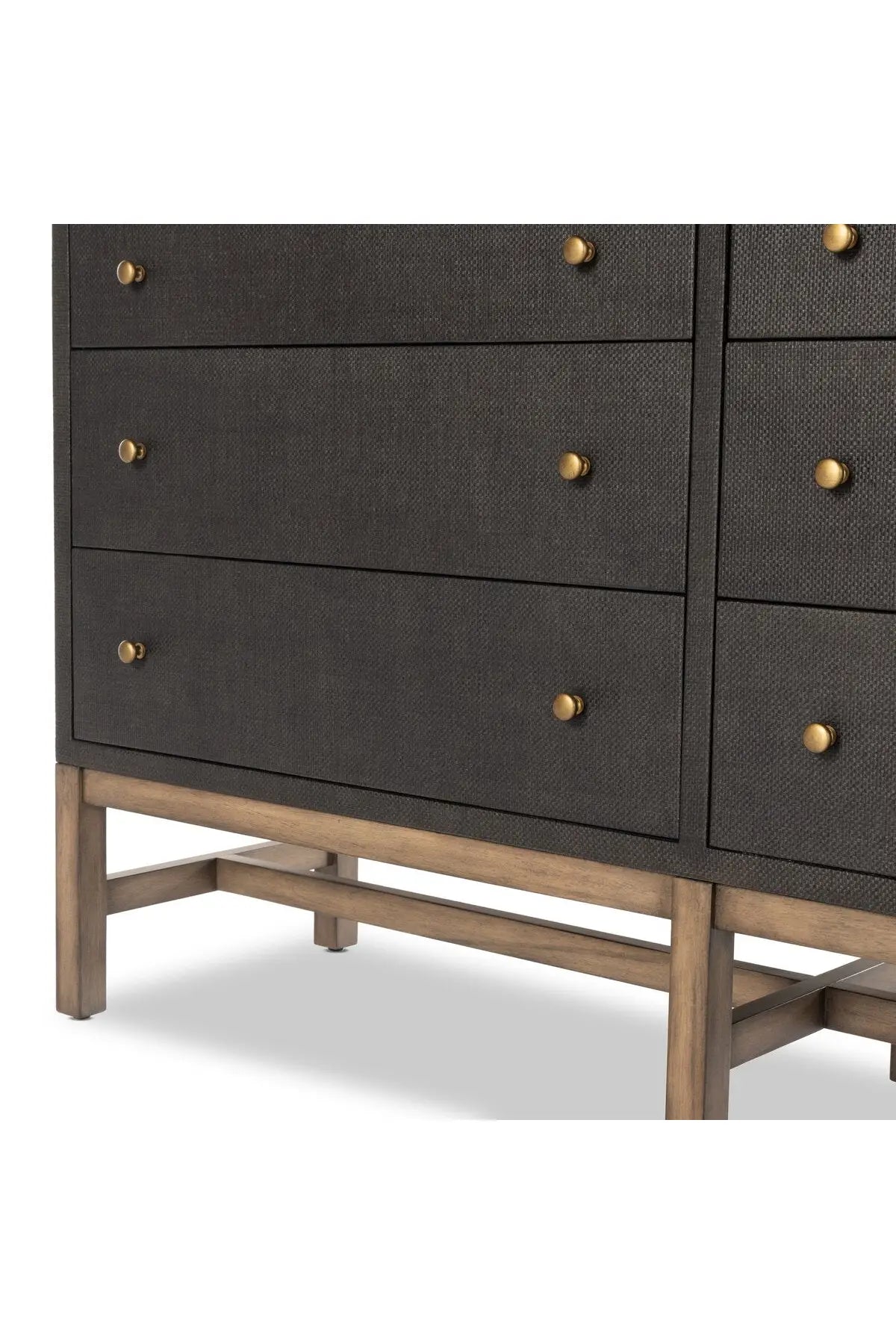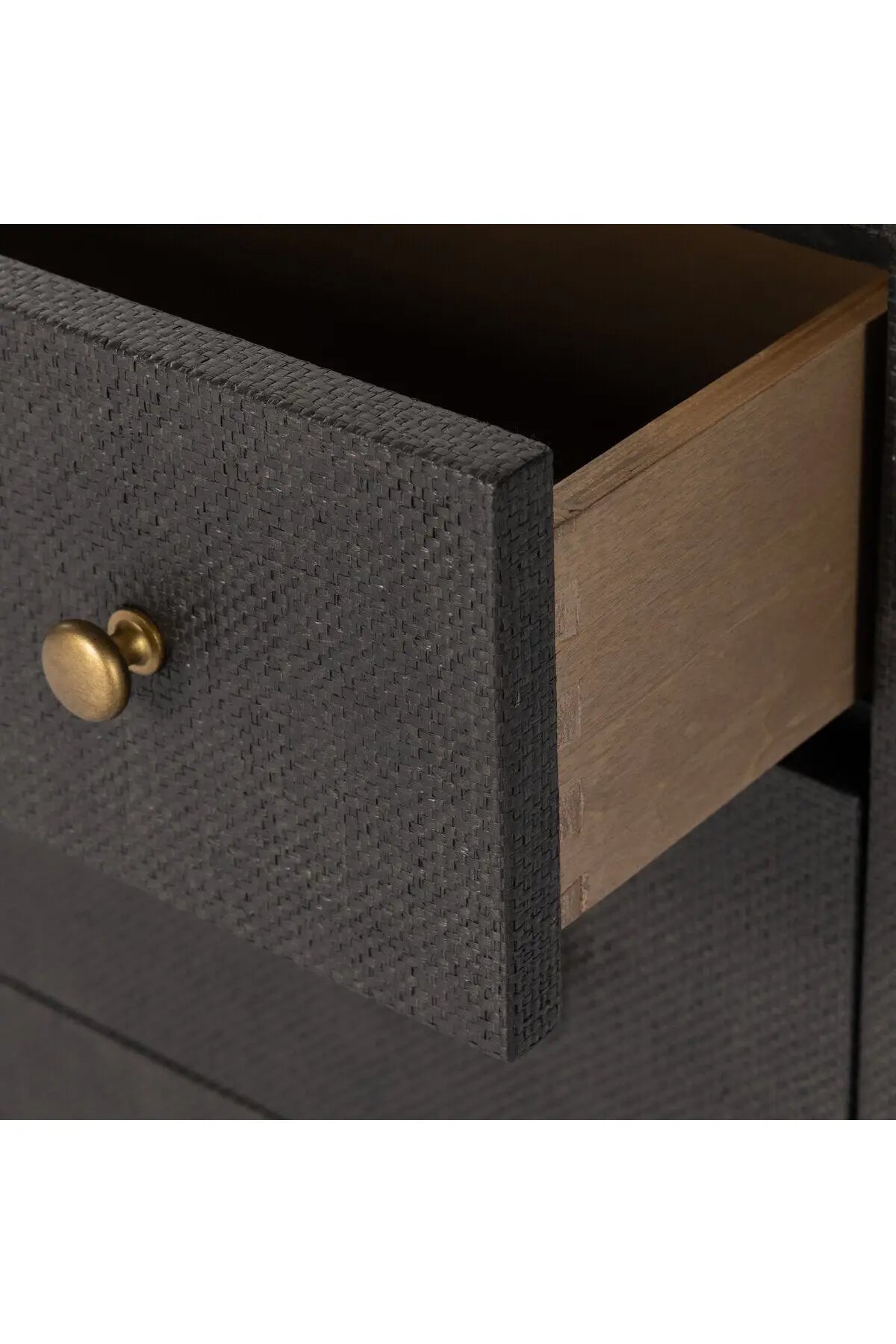 Meet the Fiona 6 Drawer Dresser. Woven black raffia offers a texture-driven take on bedroom storage. Antique brass-finished iron hardware adorns six spacious drawers, all supported by a solid mahogany base.