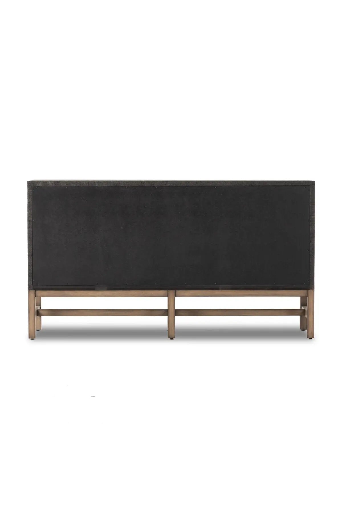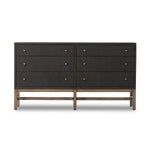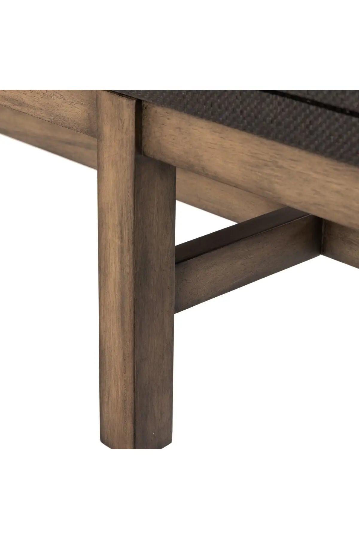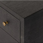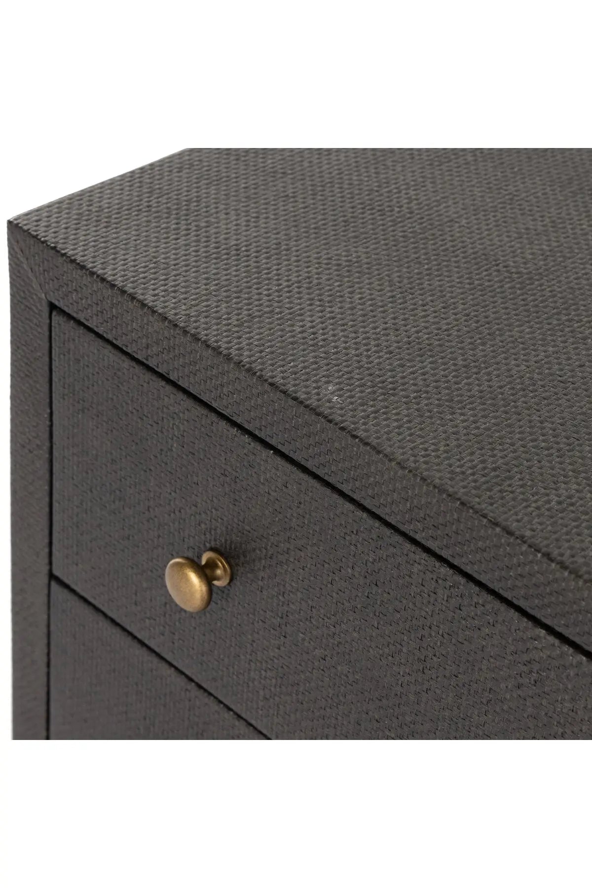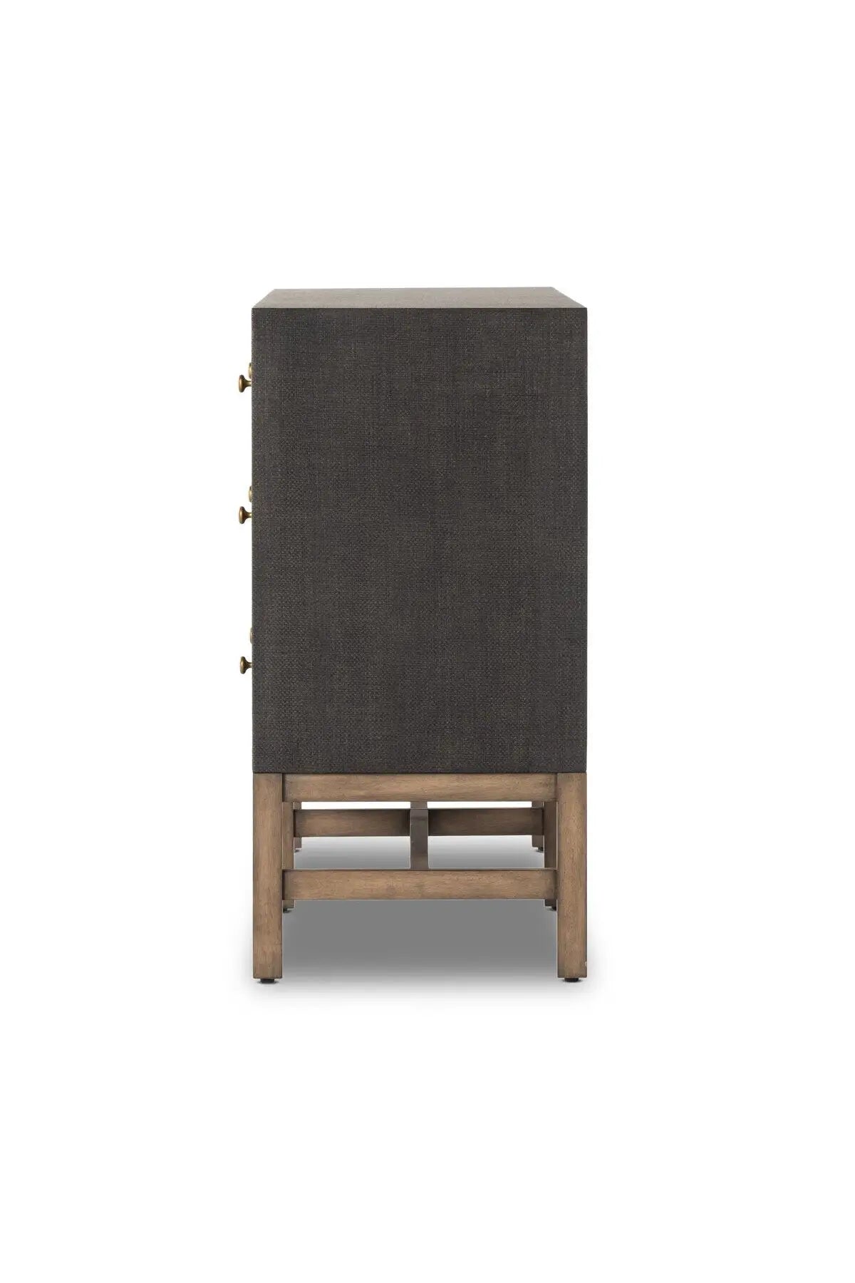Meet the Fiona 6 Drawer Dresser. Woven black raffia offers a texture-driven take on bedroom storage. Antique brass-finished iron hardware adorns six spacious drawers, all supported by a solid mahogany base.
