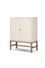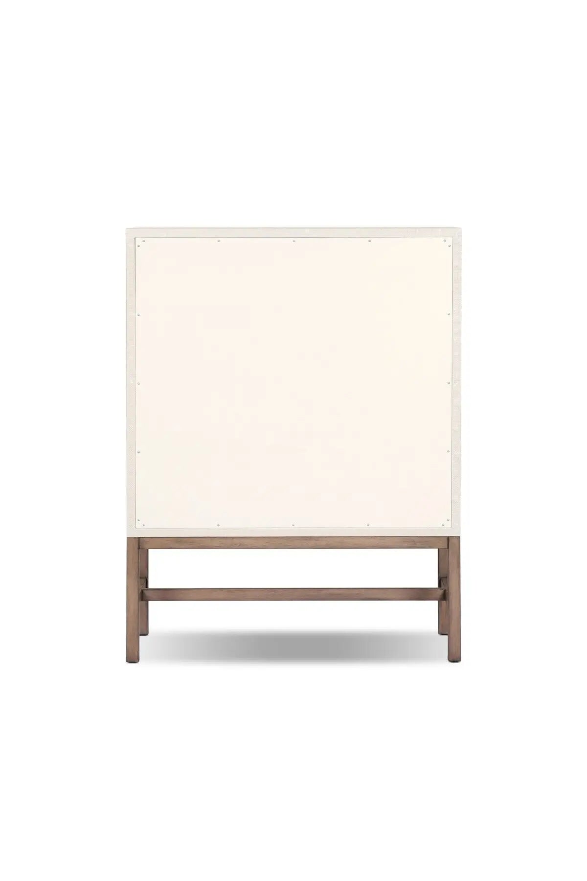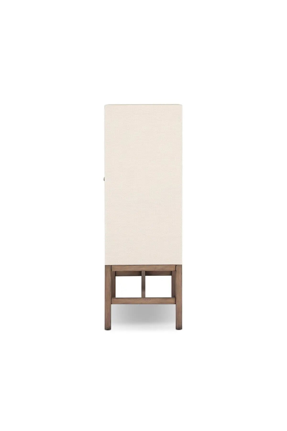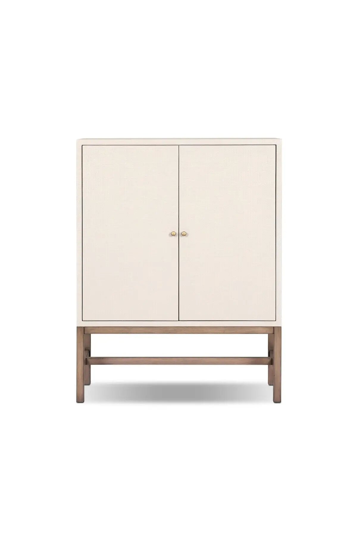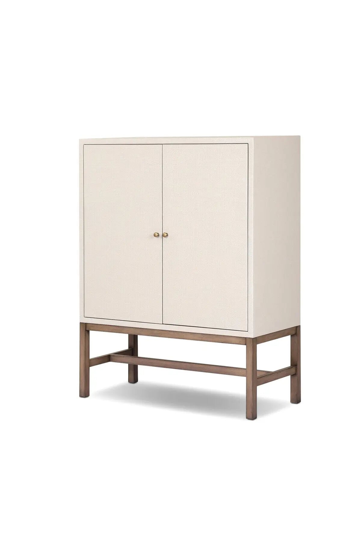 Meet the Fiona Bar Cabinet. A foundation of solid mahogany anchors this design, its russet mahogany tones revealing natural variations in the grain. Iron elements in light antique brass lend a sleek edge, while ivory-painted raffia introduces a tactile finish. A fusion of strength and style, this piece is crafted to make a statement.