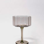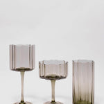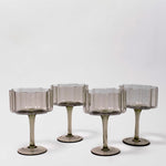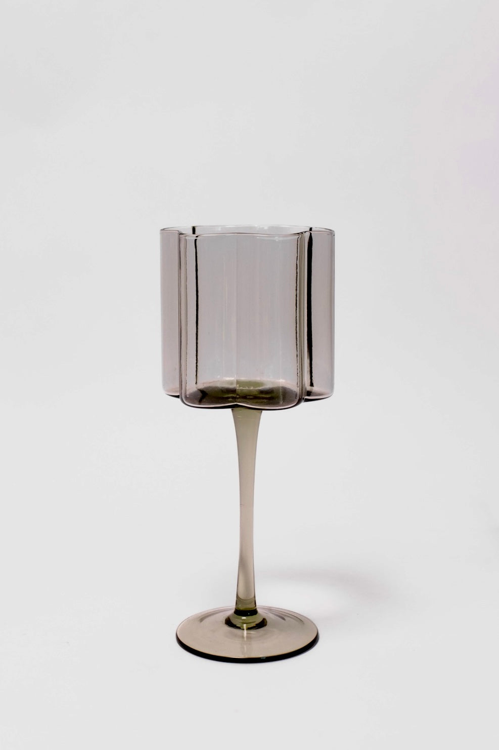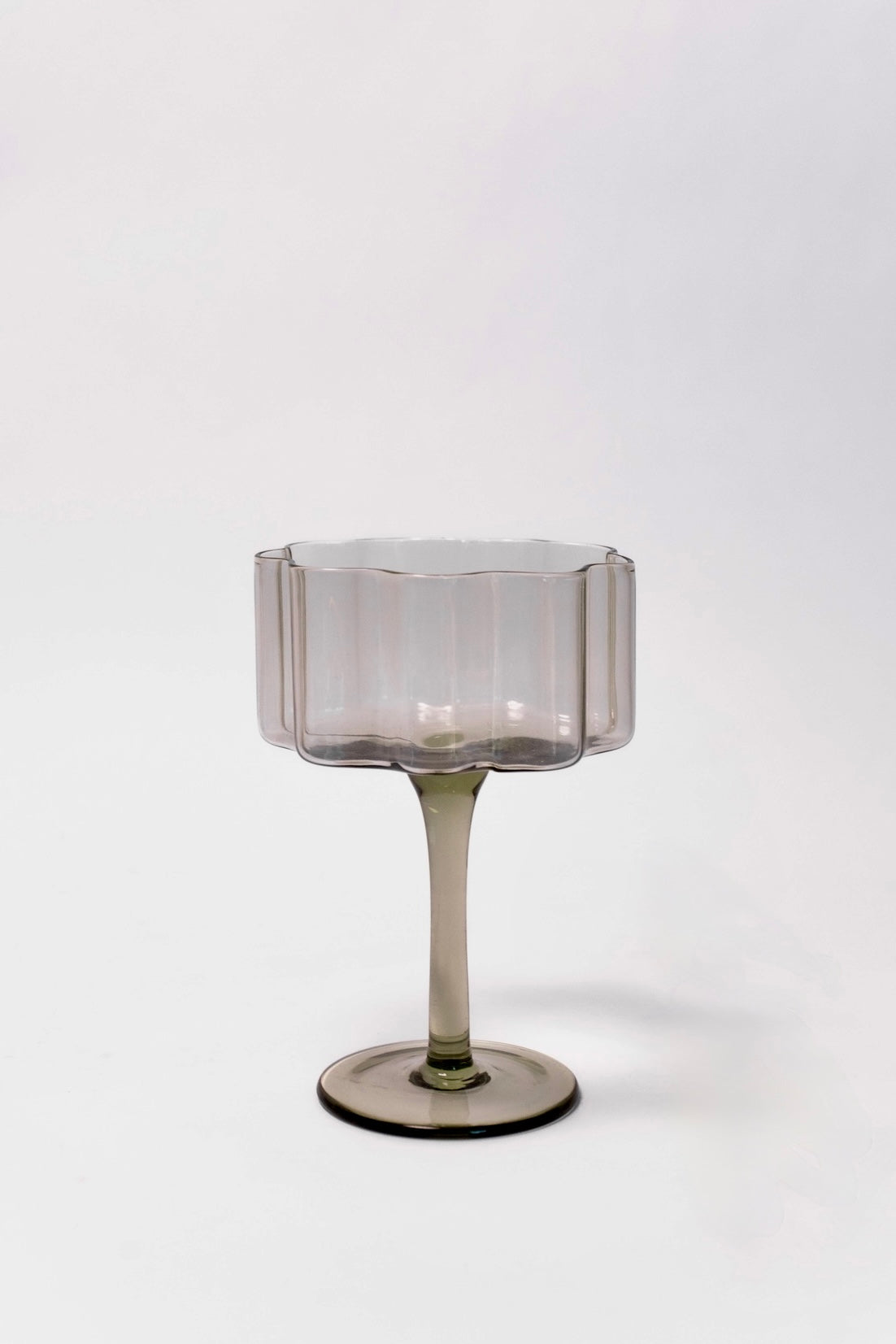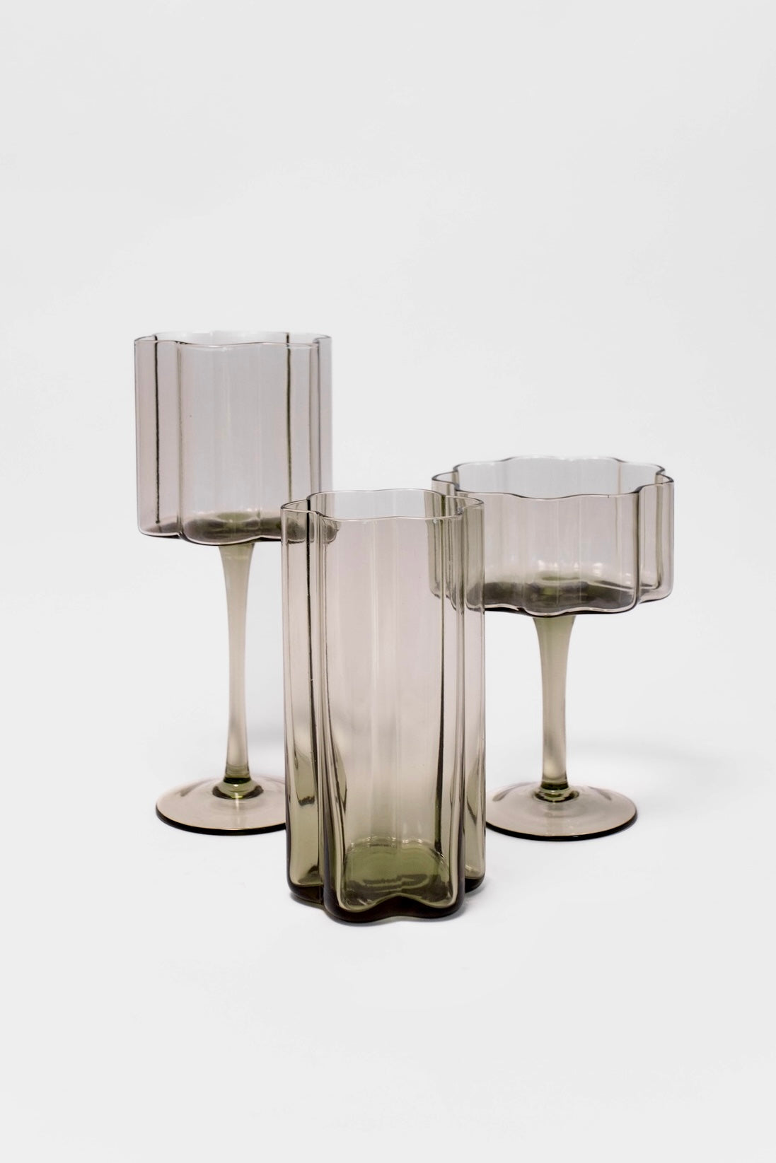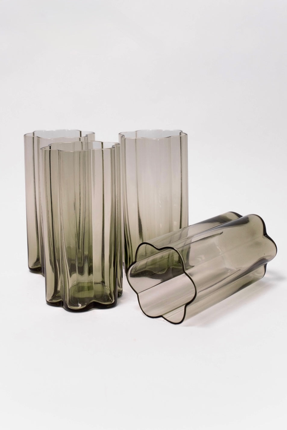 Meet the Floret Drinkware. As decorative as it is functional, the Floret Drinkware can be home styled on bar carts or open kitchen shelving. This trendy handmade solid glass elevates any cocktail party, event, or home bar with its smoky grey hue, scalloped rim, & vertical ridging. This glass is even more beautiful arranged alongside the whole Floret Drinkware family. This is sold in a set of 4 as well as food and dishwasher safe.