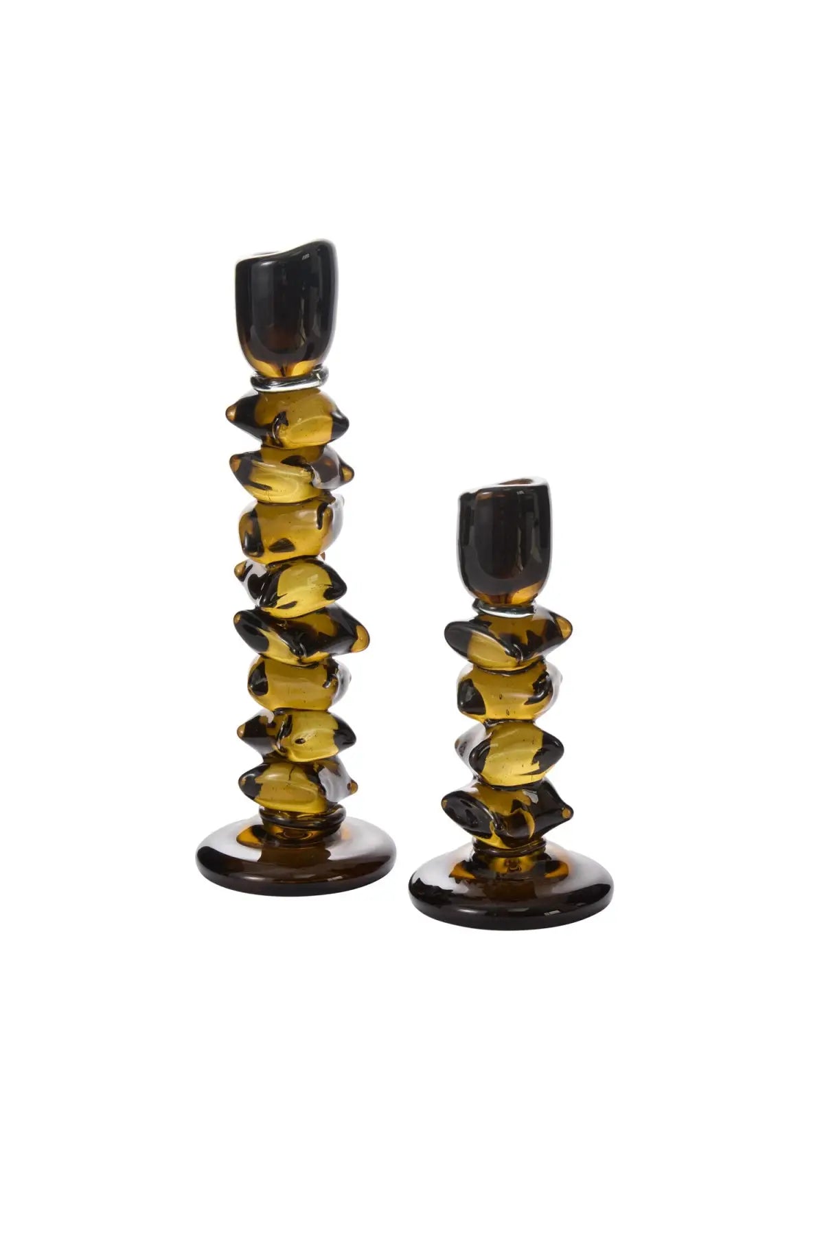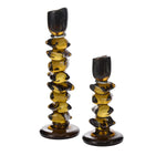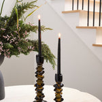 With its sculptural shapes and organic, eye-catching silhouette, the chunky stacked glass Foundation Candleholder is a statement art piece. Featuring a slight translucency in its dark green tone, this handmade solid glass decorative candleholder is cut and layered while molten hot, then set in place. Style as table decor with standard taper candles or on a shelf as a decorative object alongside the other.