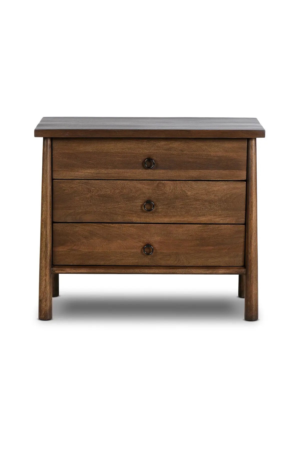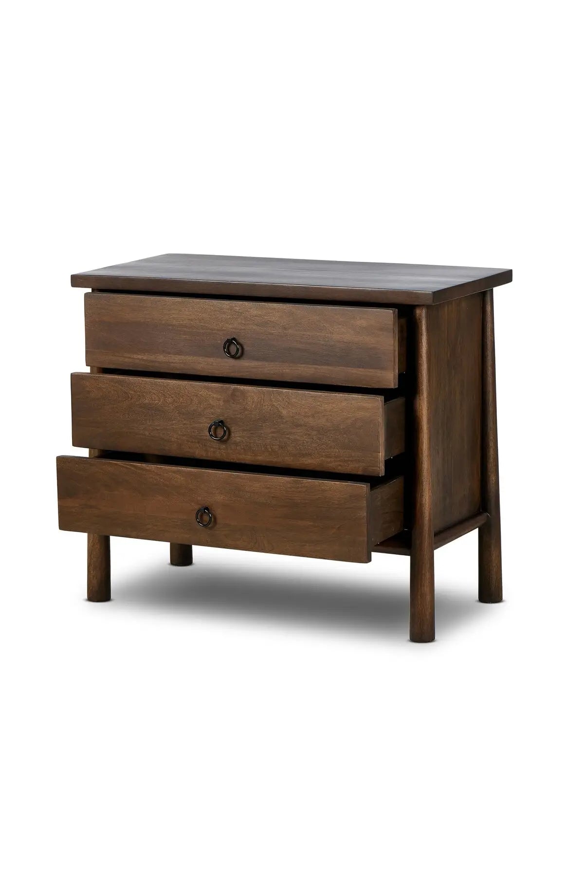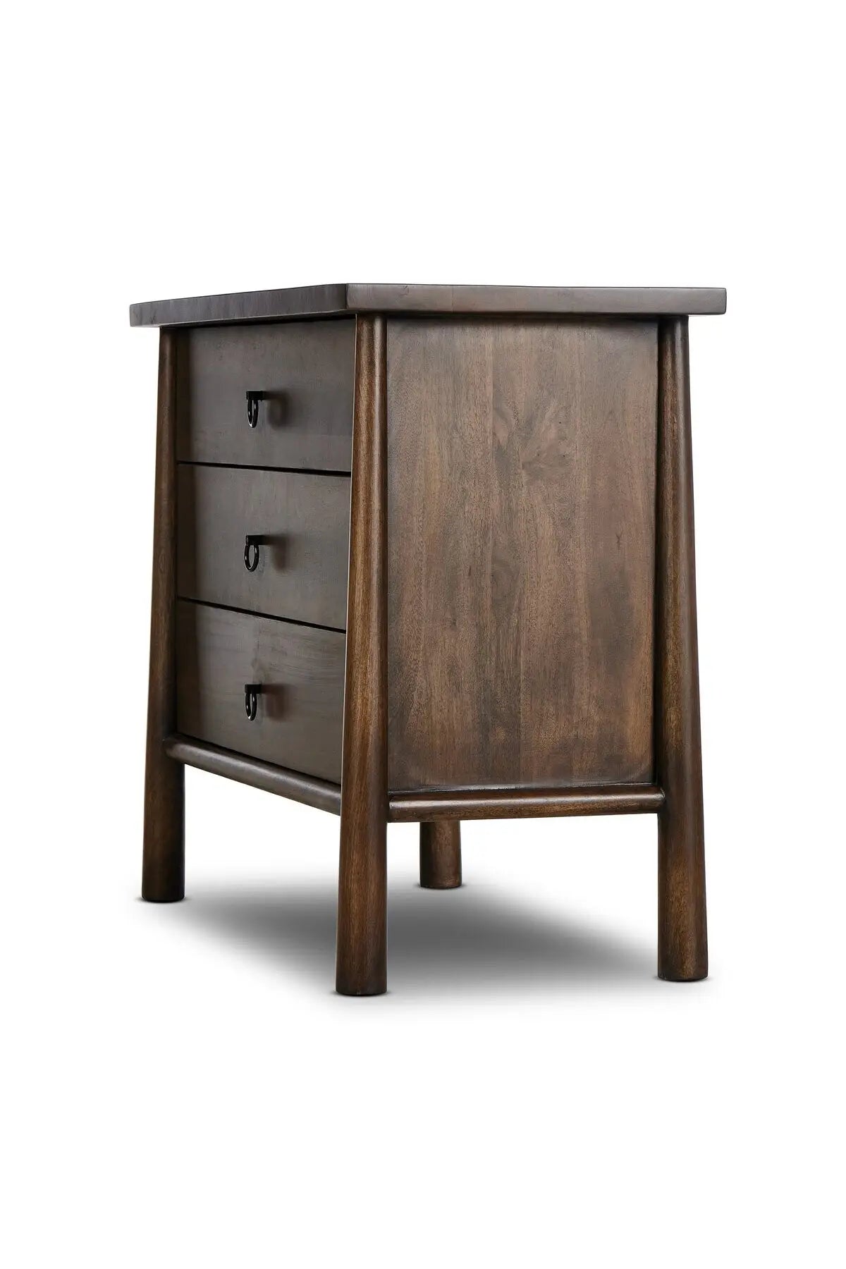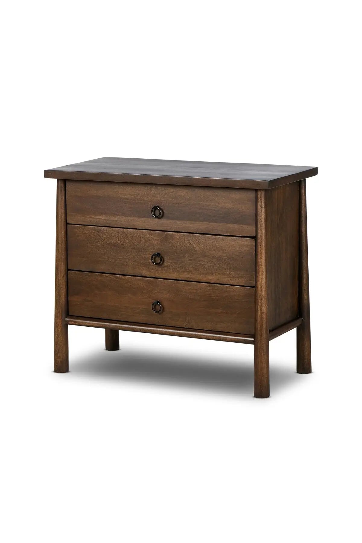 Meet the Freddie Chest. Inspired by French antique design, this dresser stands on round tapered legs with a prominent overhang top. Made of mango wood with cast iron key ring pulls, three drawers make it a versatile choice as a dresser or nightstand.