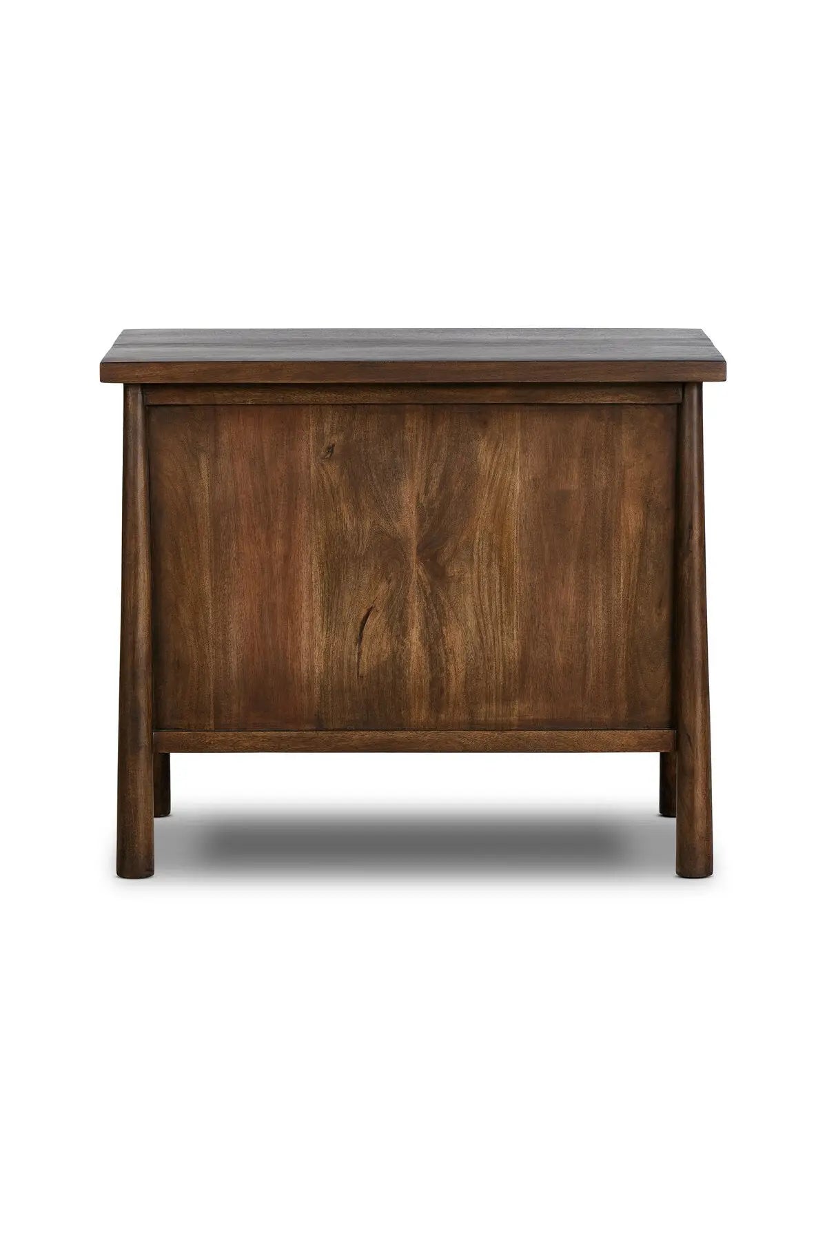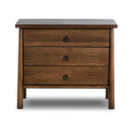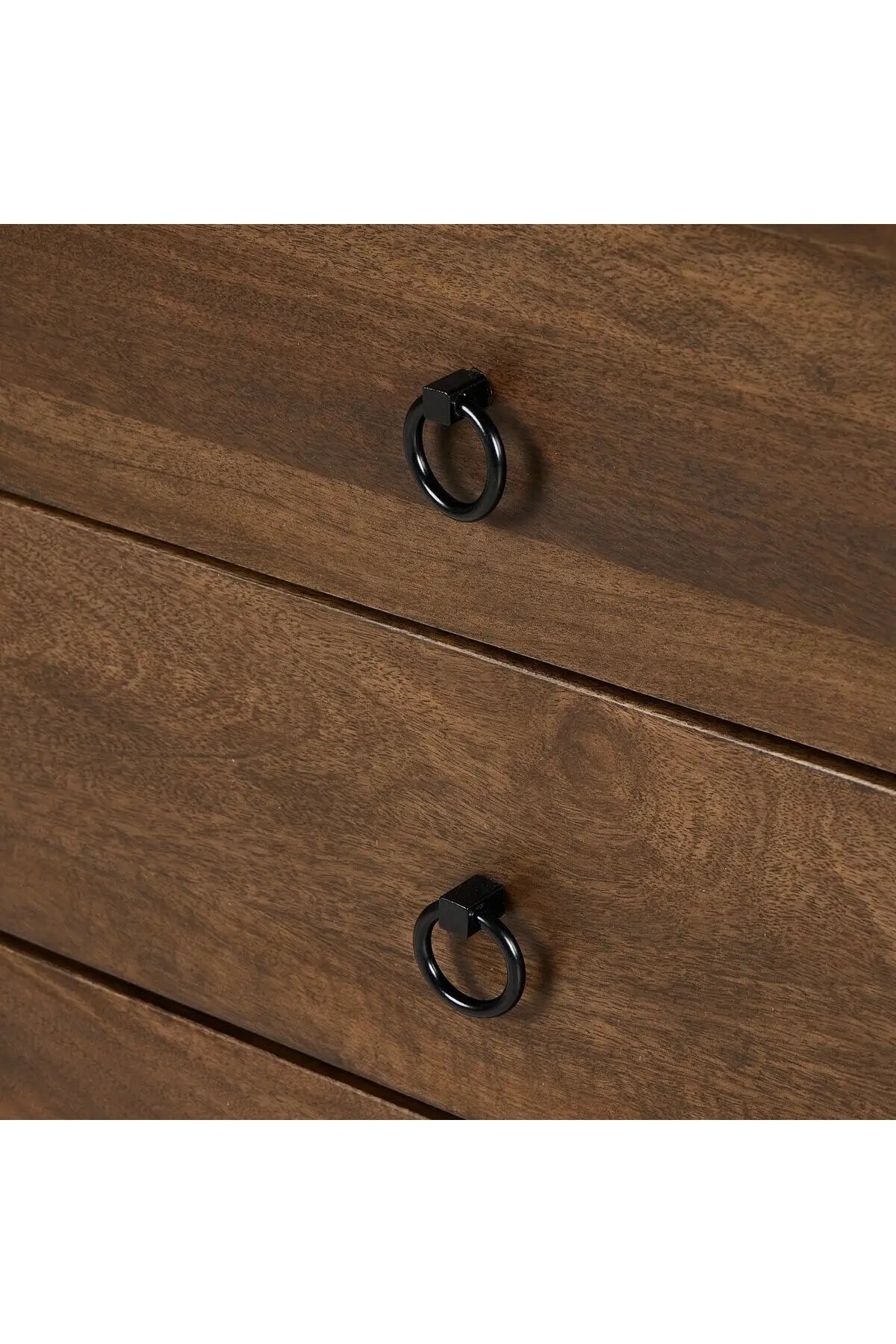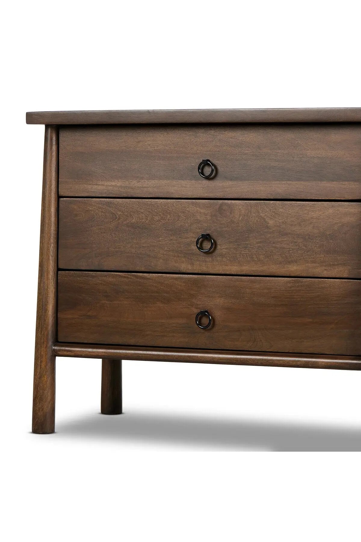 Meet the Freddie Chest. Inspired by French antique design, this dresser stands on round tapered legs with a prominent overhang top. Made of mango wood with cast iron key ring pulls, three drawers make it a versatile choice as a dresser or nightstand.