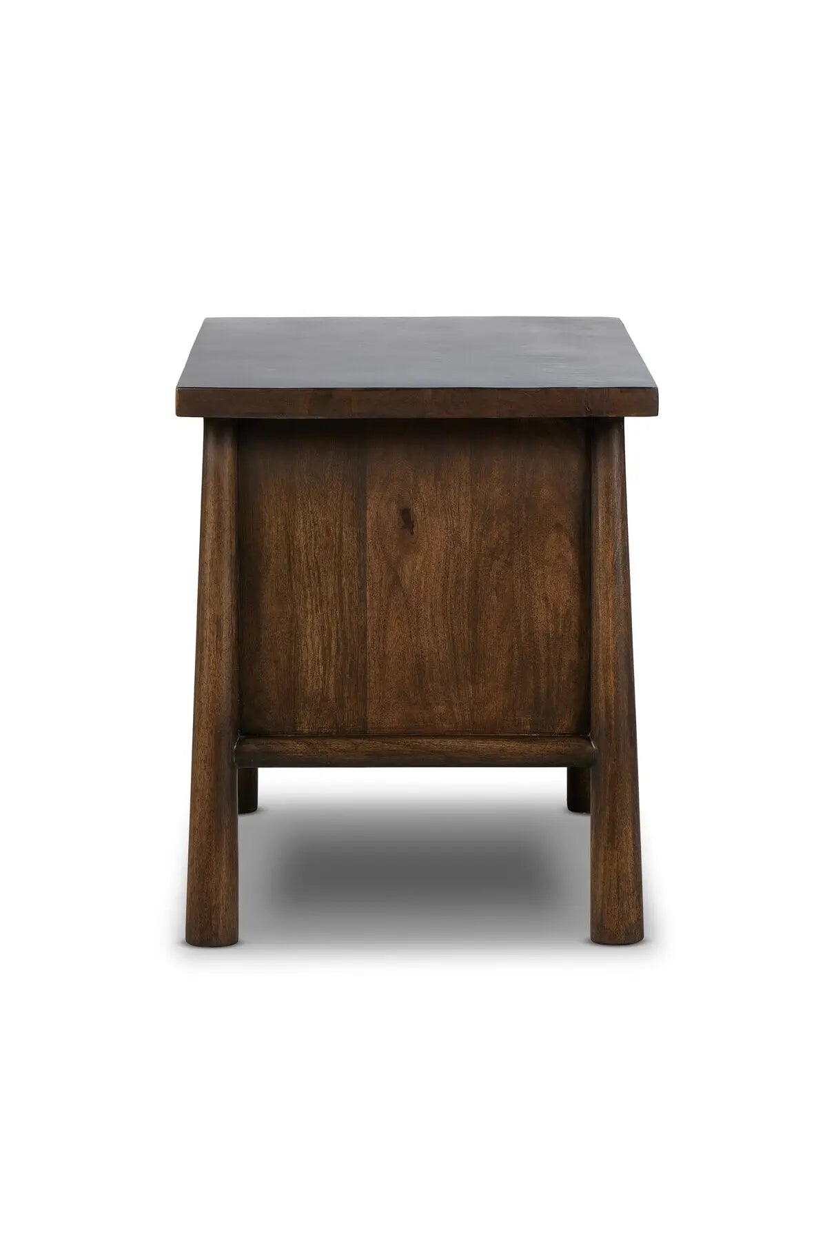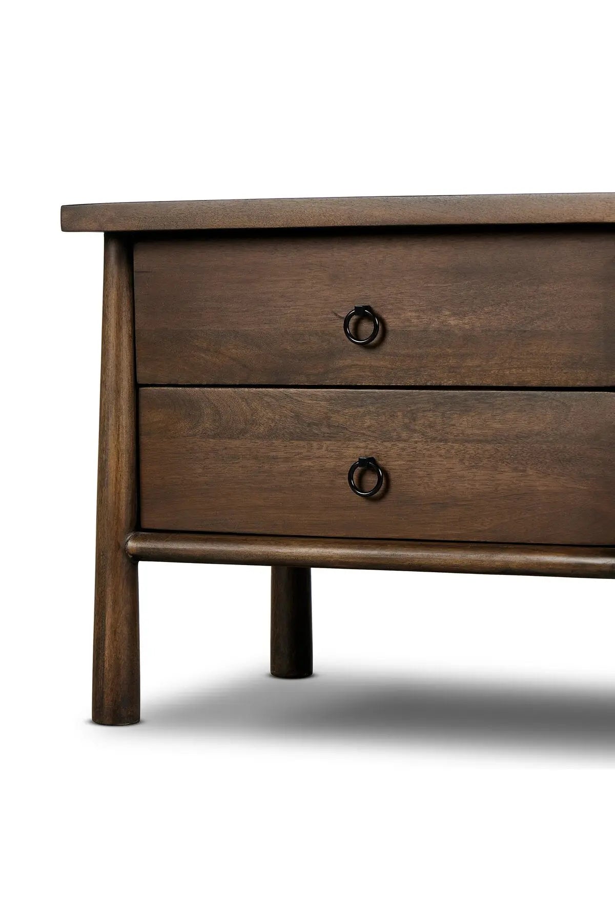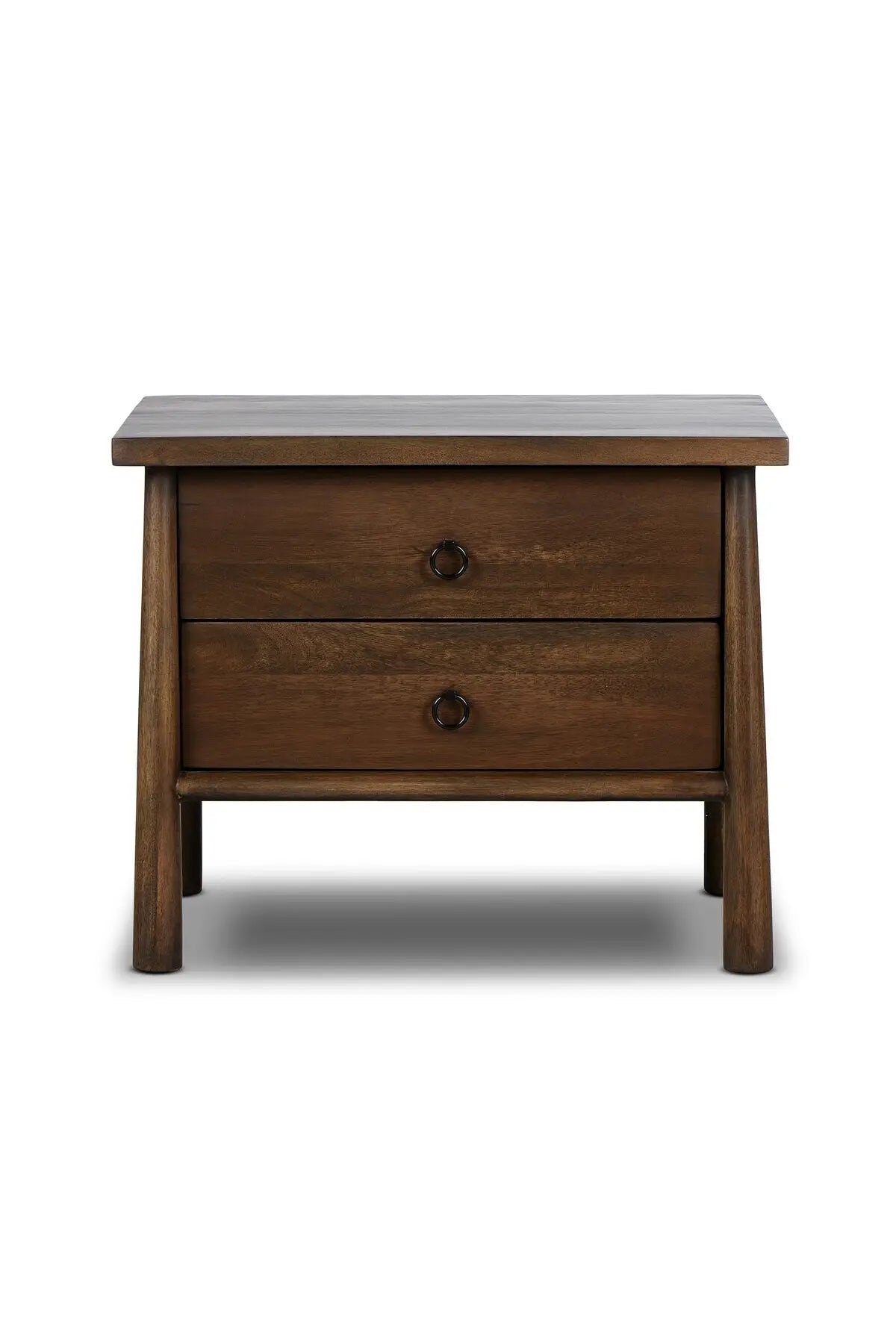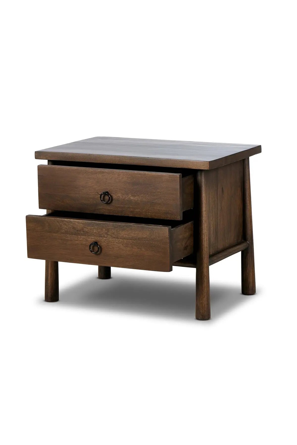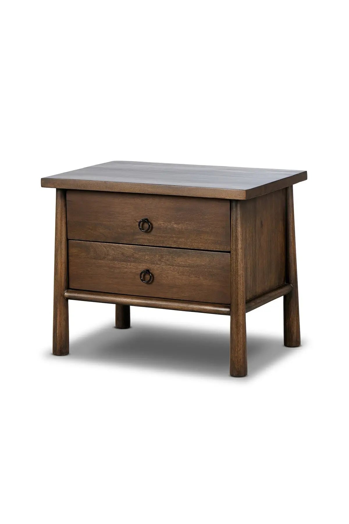 Meet the Freddie Nightstand. Inspired by French antique design, this dresser stands on round tapered legs with a prominent overhang top. Made of mango wood with cast iron key ring pulls, two drawers make it a versatile choice as a dresser or nightstand.