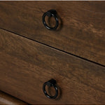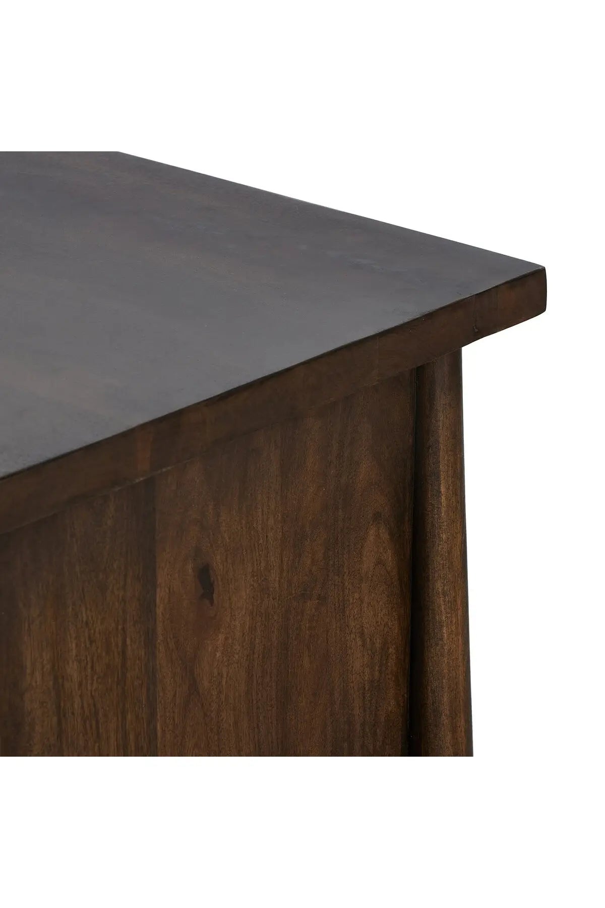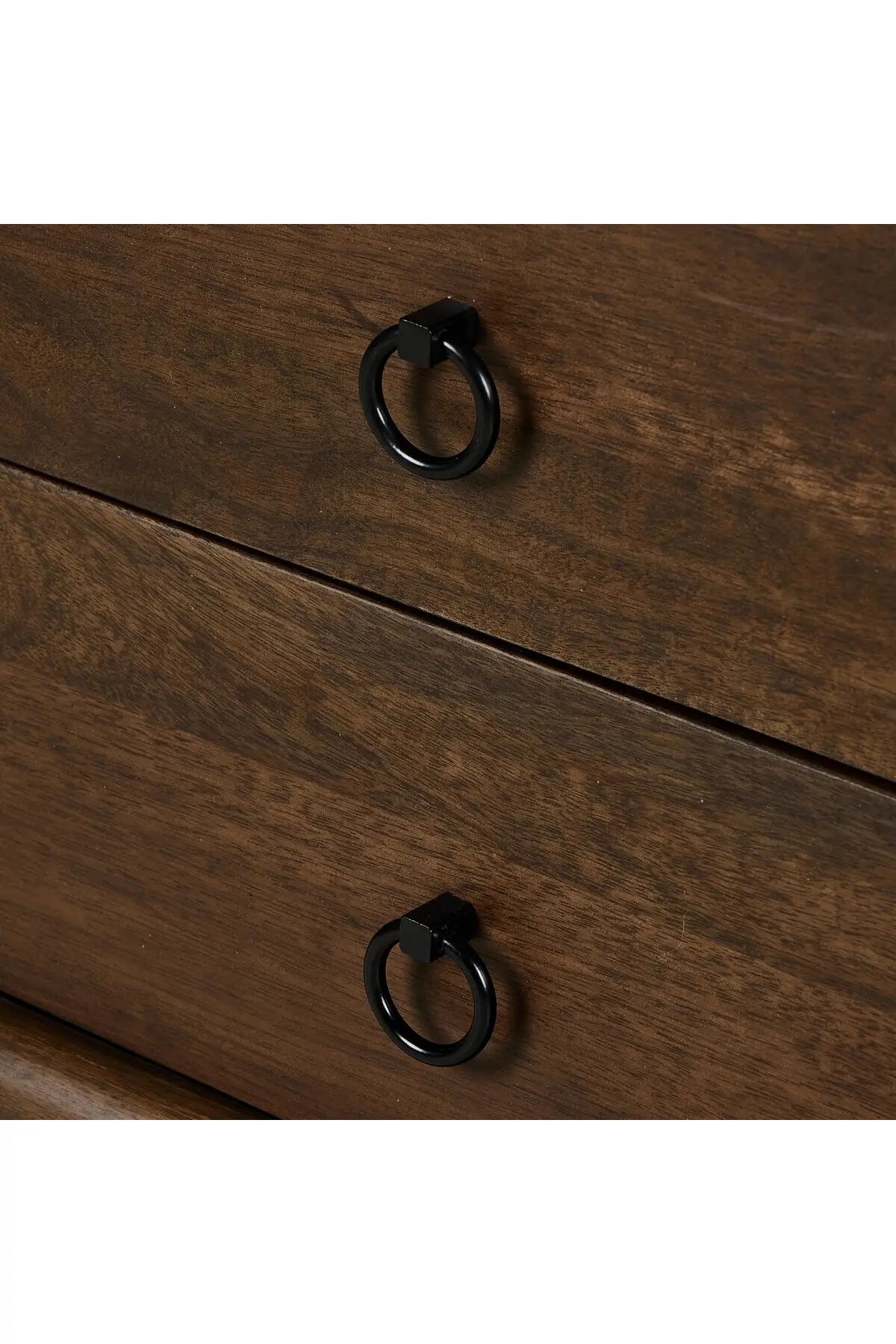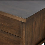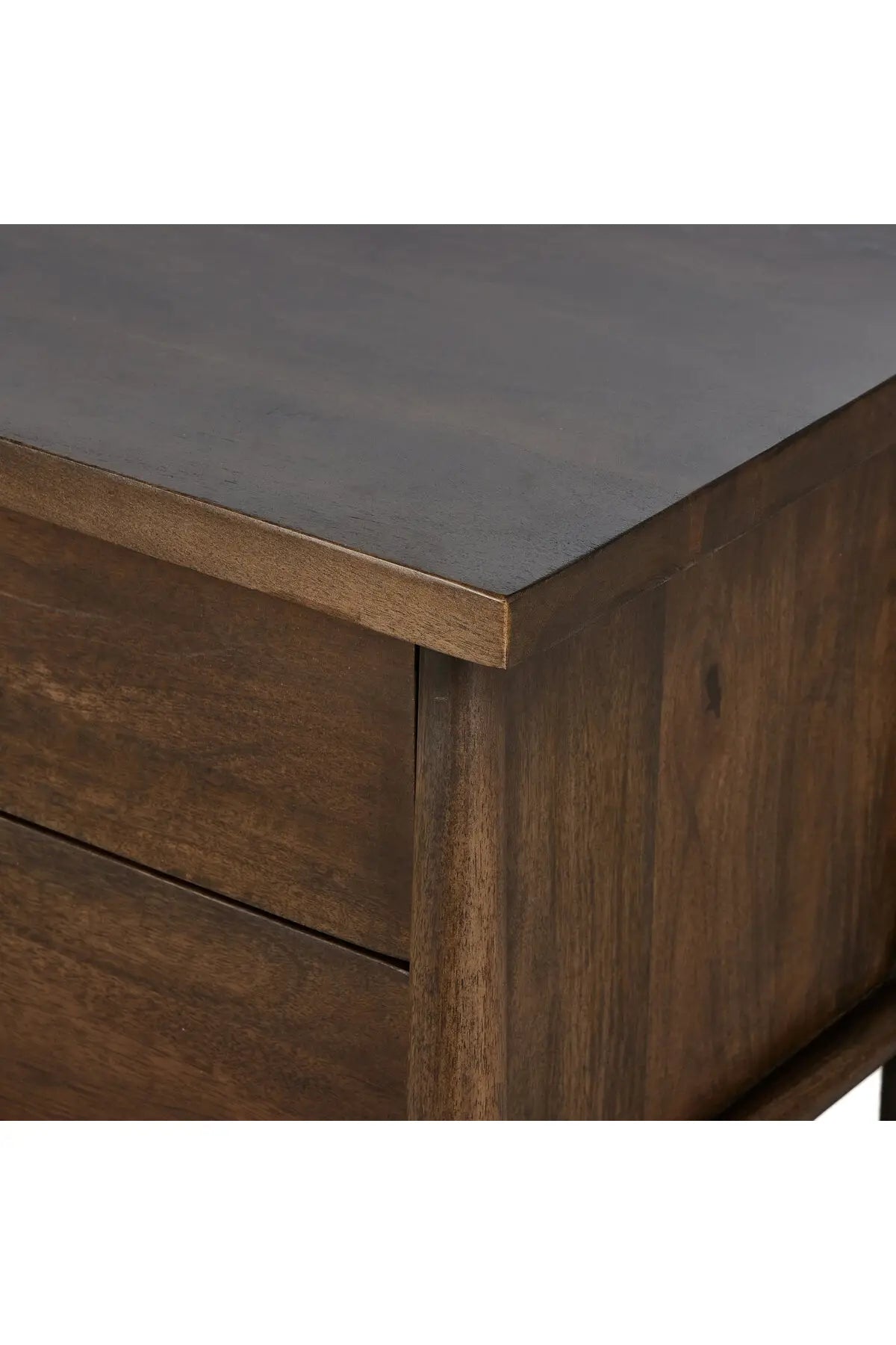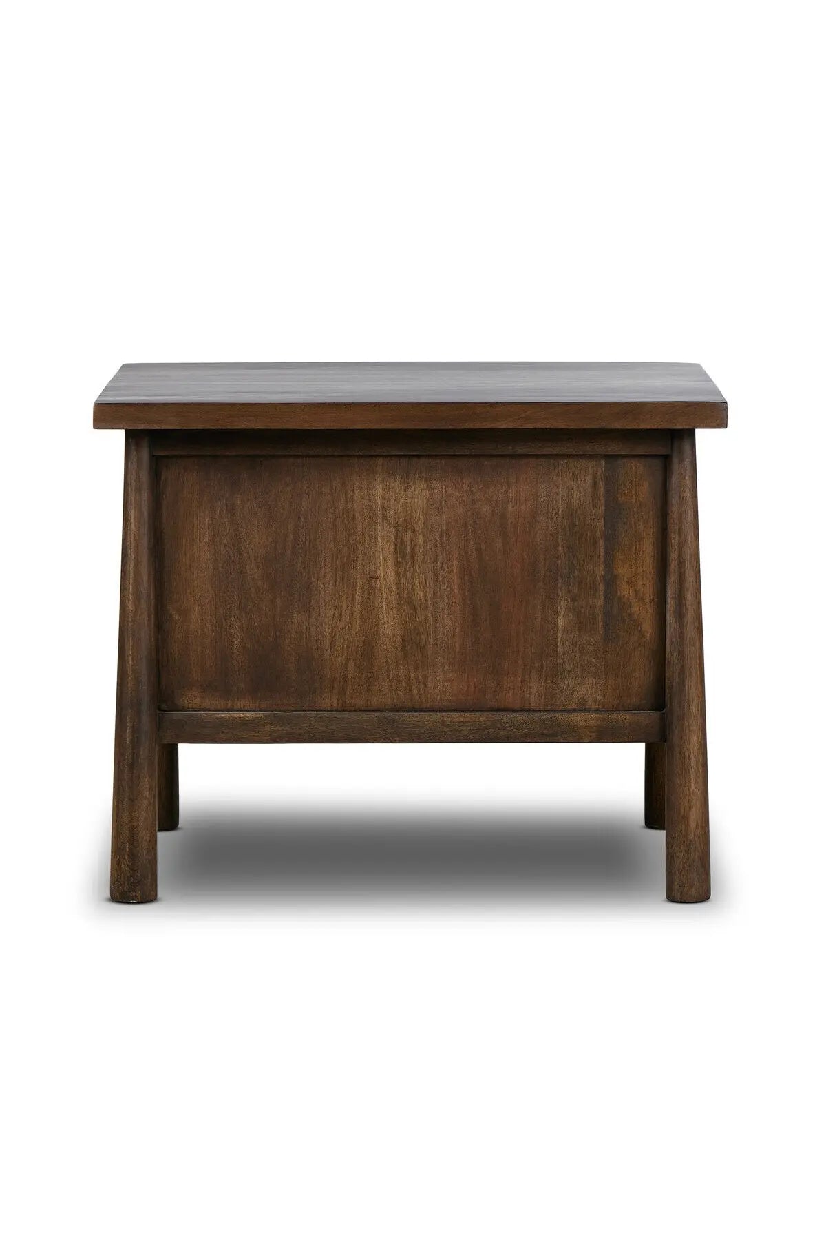 Meet the Freddie Nightstand. Inspired by French antique design, this dresser stands on round tapered legs with a prominent overhang top. Made of mango wood with cast iron key ring pulls, two drawers make it a versatile choice as a dresser or nightstand.