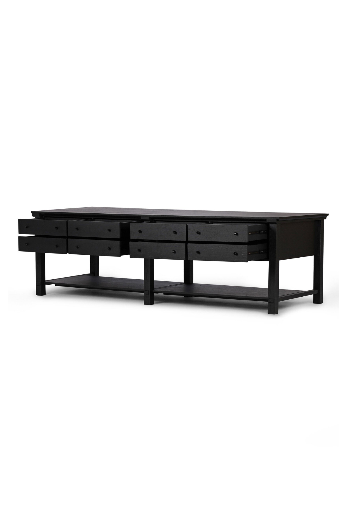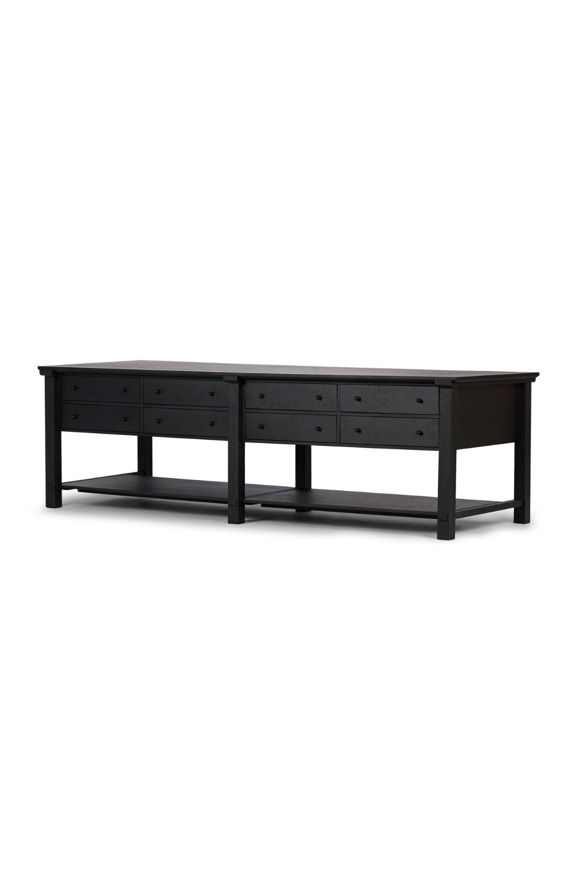 Make room for more prepping, gathering and storage with the Gardendale Kitchen Island. This large and functional kitchen island features eight wide drawers on one side, a large bottom shelf below and room for stools. Designed with an oak cradle frame that holds the tabletop above with exposed joint details on the shelf and legs below for a bench-made look and feel.