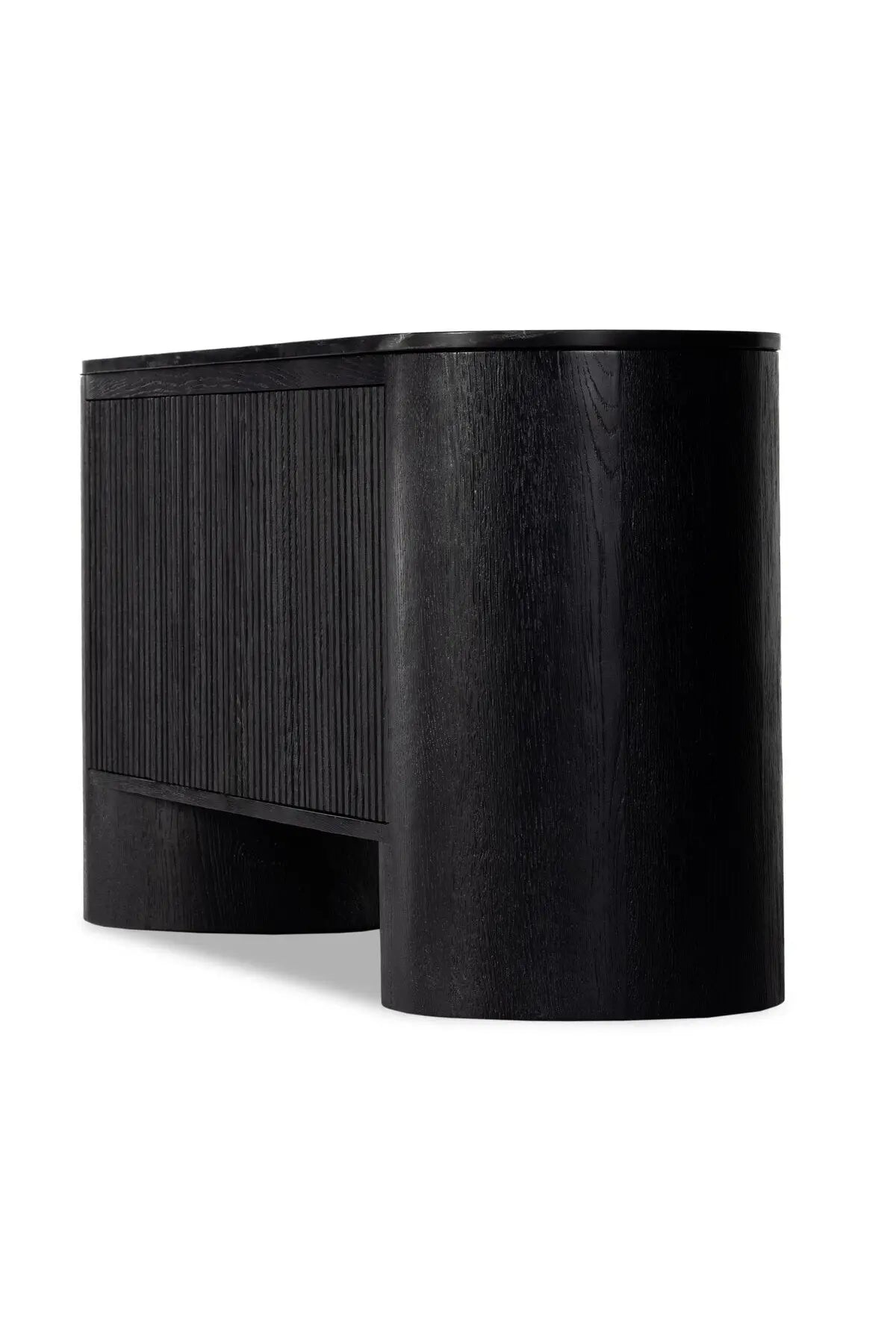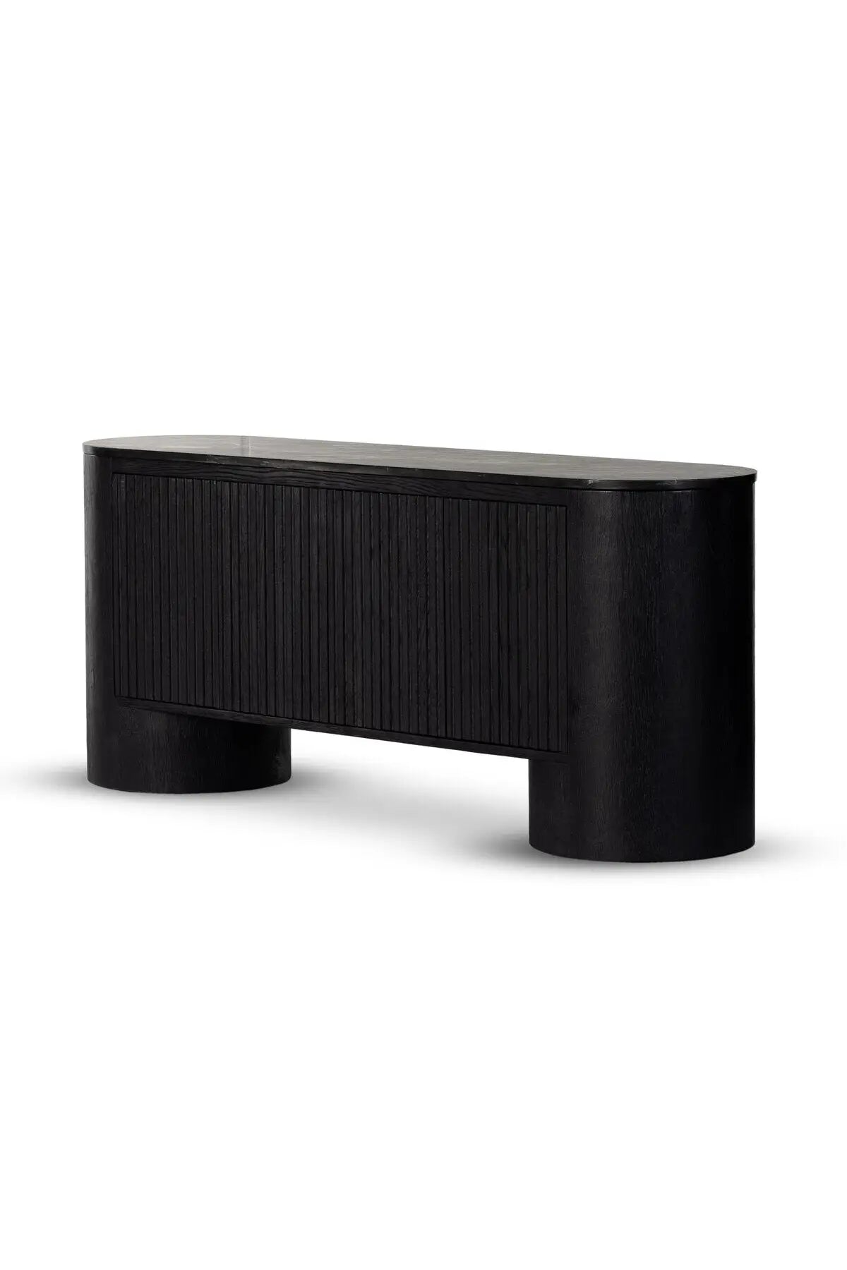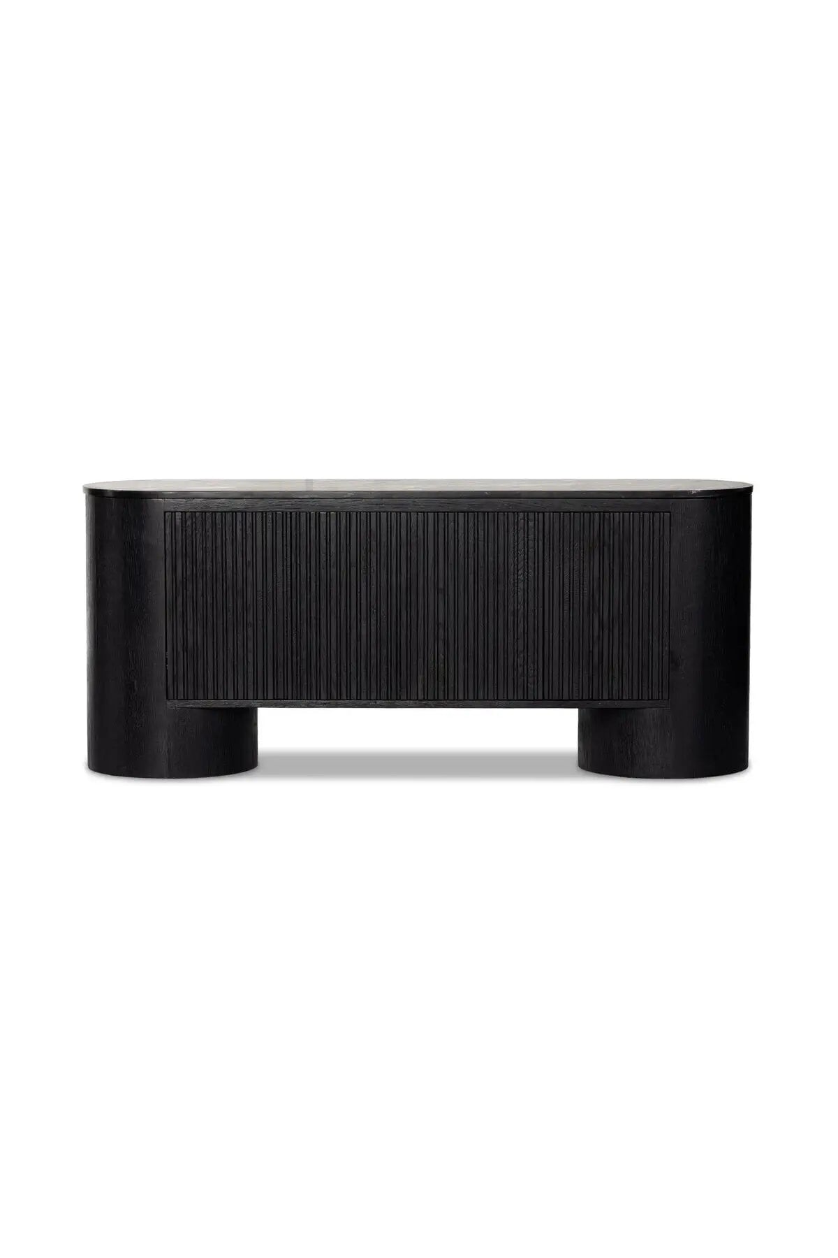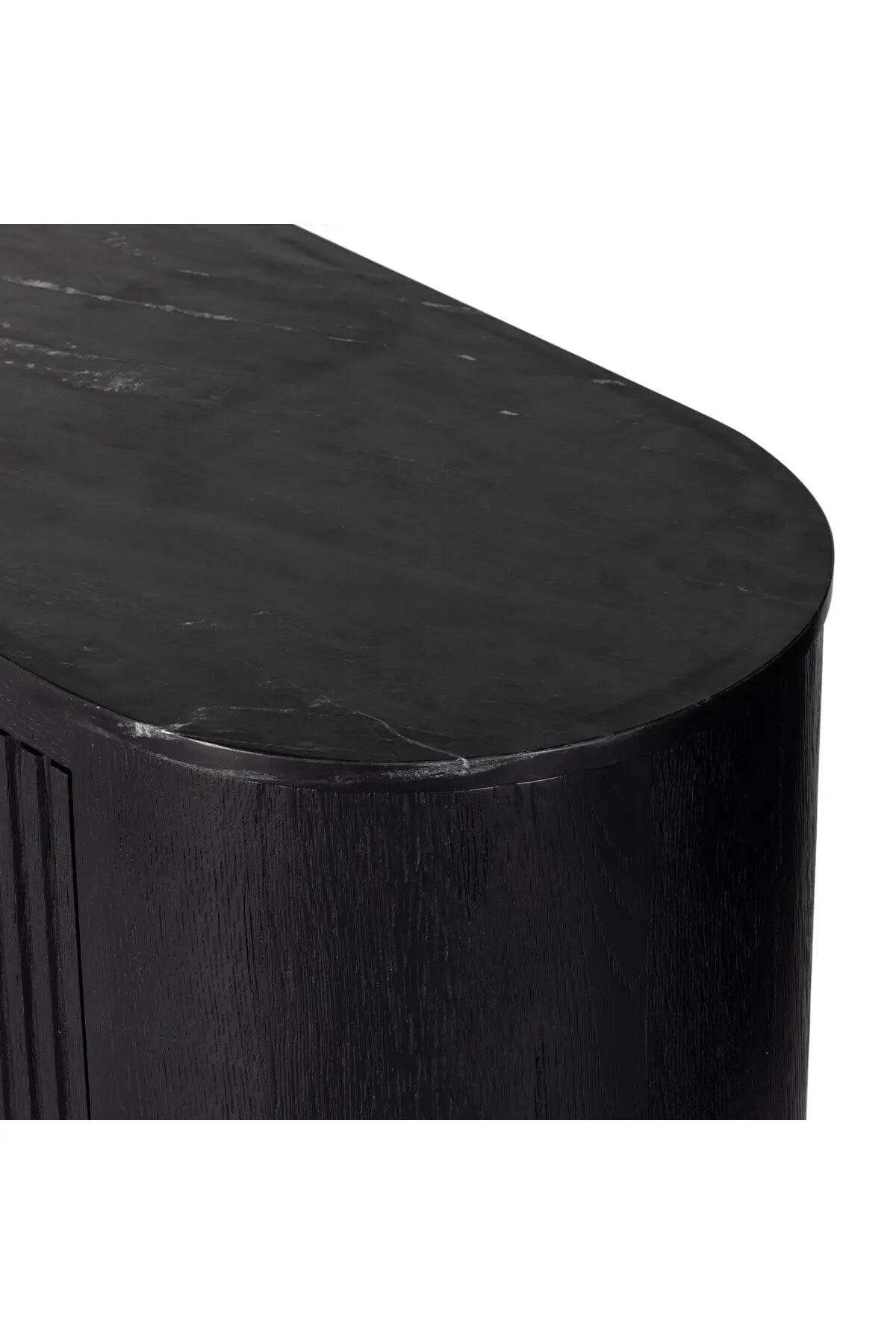 Meet the Giovani Media Console. Classic materials, modern styling. A rounded overscale base supports oak veneer casing finished in a classic black, with fluted ribbing for texture on doors. A black marble top features white veining, bringing a hint of movement to this unique piece.