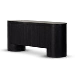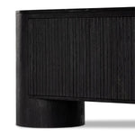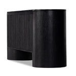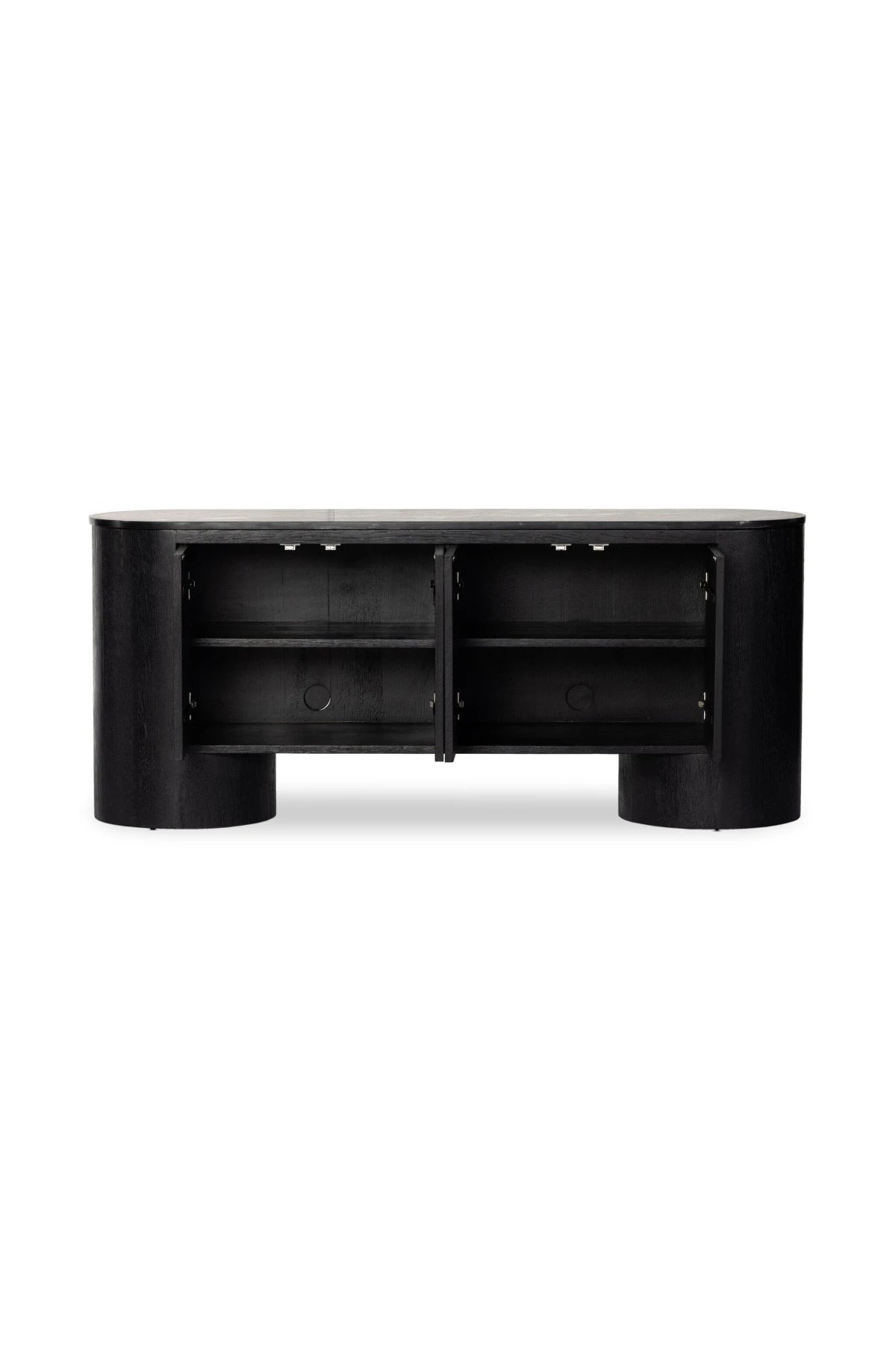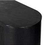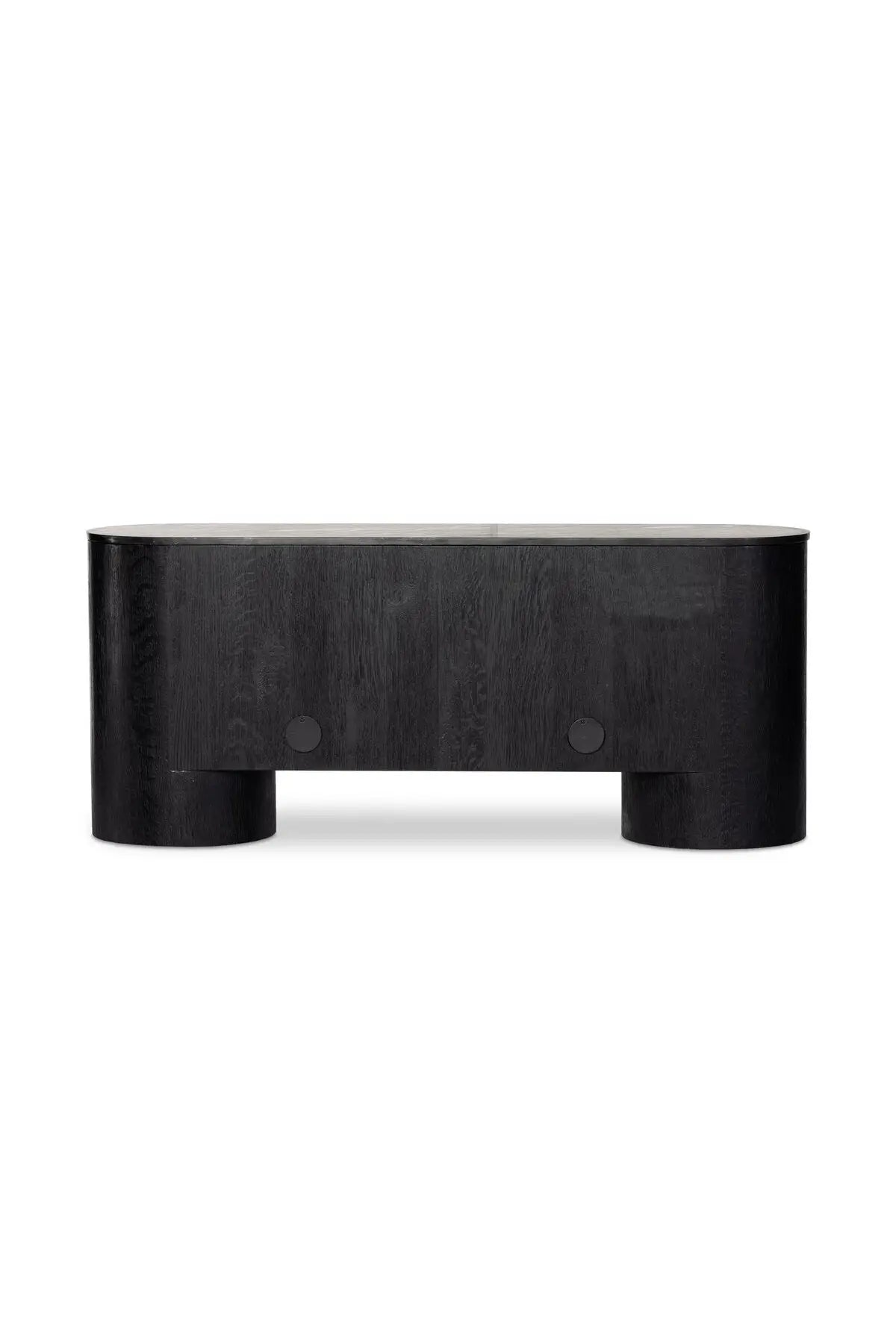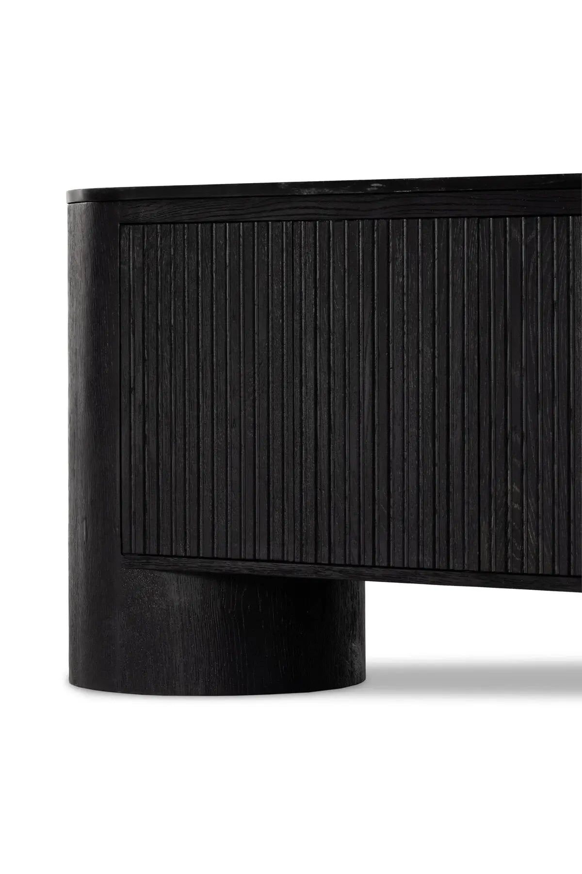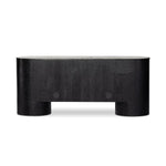Meet the Giovani Media Console. Classic materials, modern styling. A rounded overscale base supports oak veneer casing finished in a classic black, with fluted ribbing for texture on doors. A black marble top features white veining, bringing a hint of movement to this unique piece.