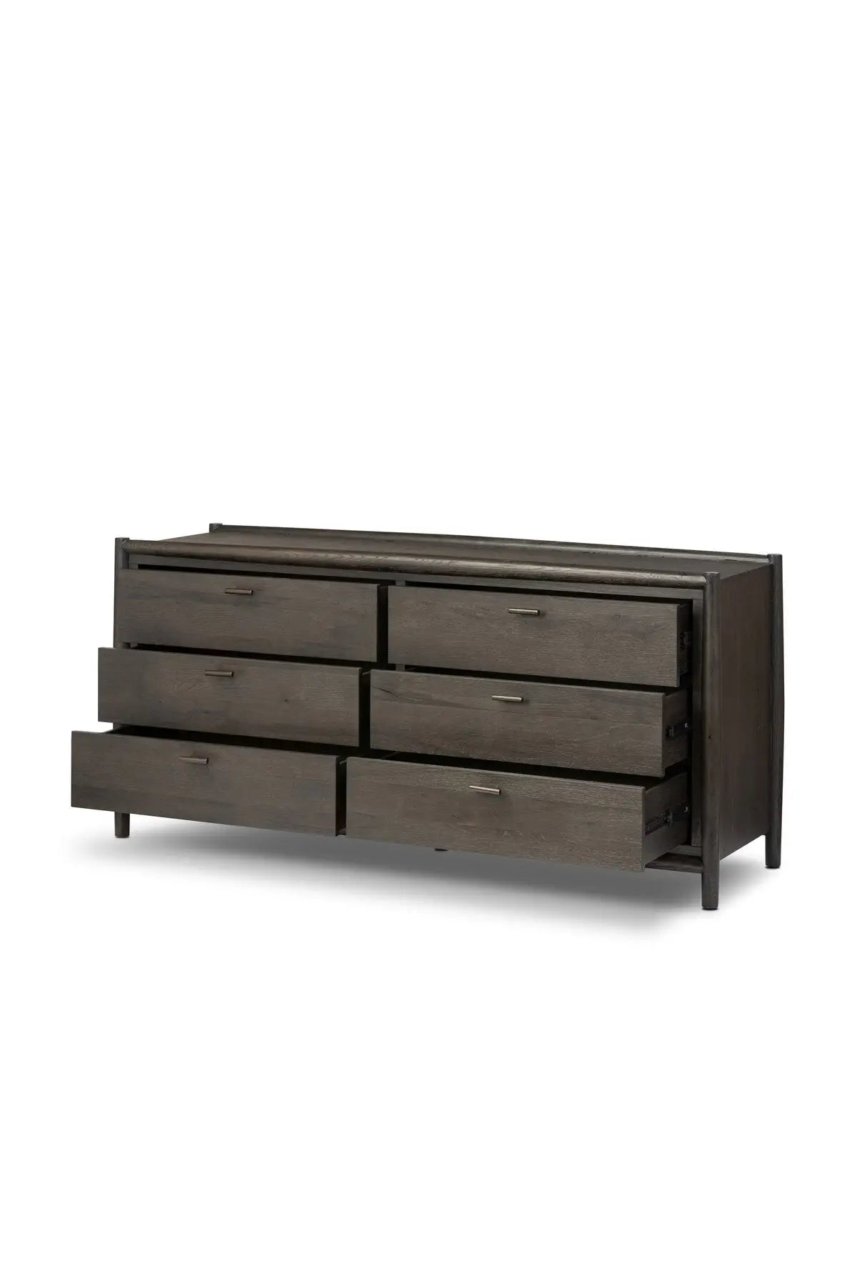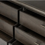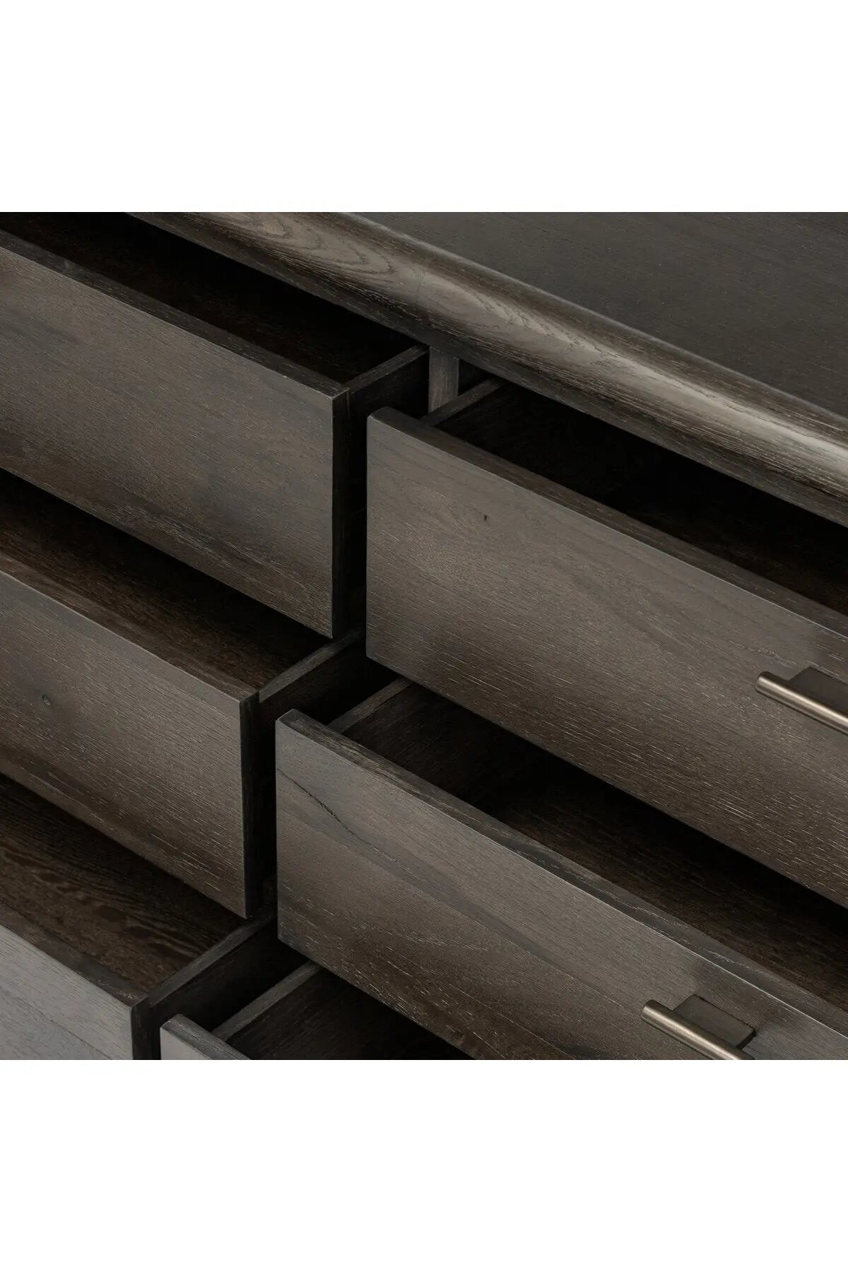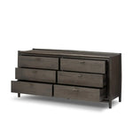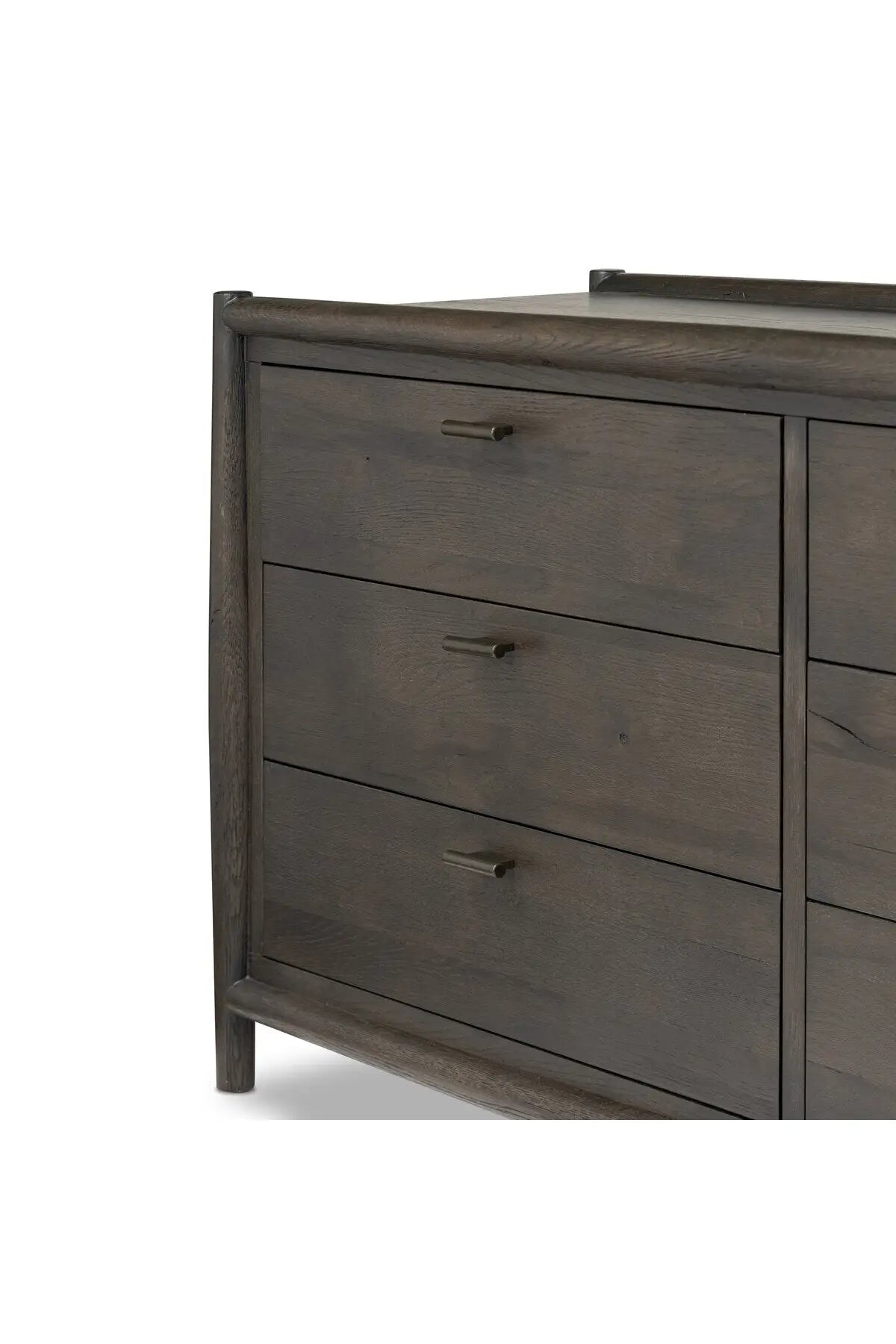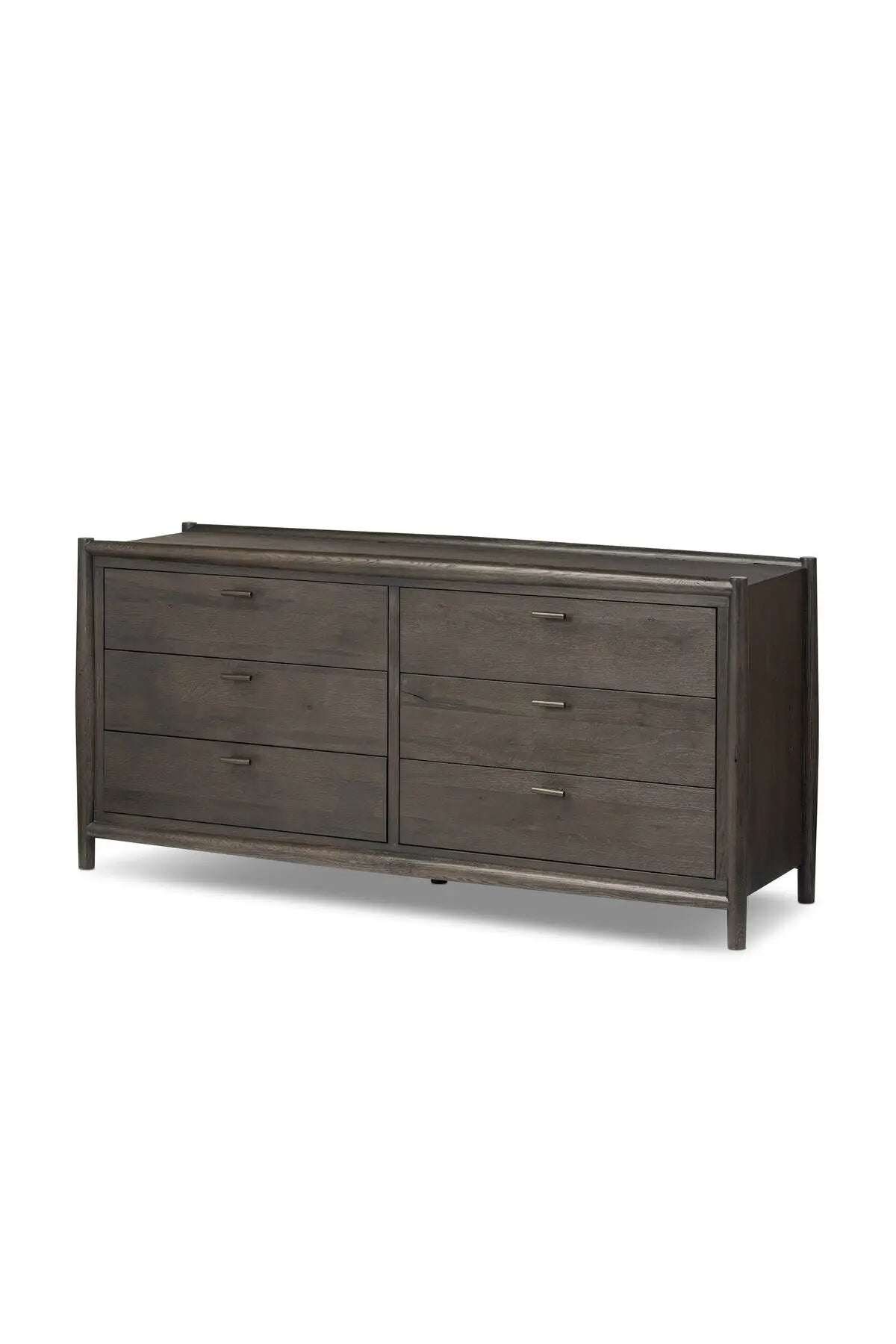 Meet the Glenview 6 Drawer Dresser. The traditional spindle structure brought to modern speed. Made from smoked black oak, six spacious drawers bring generous storage space to the bedroom. Simple cylindrical hardware is finished in an aged bronze.
