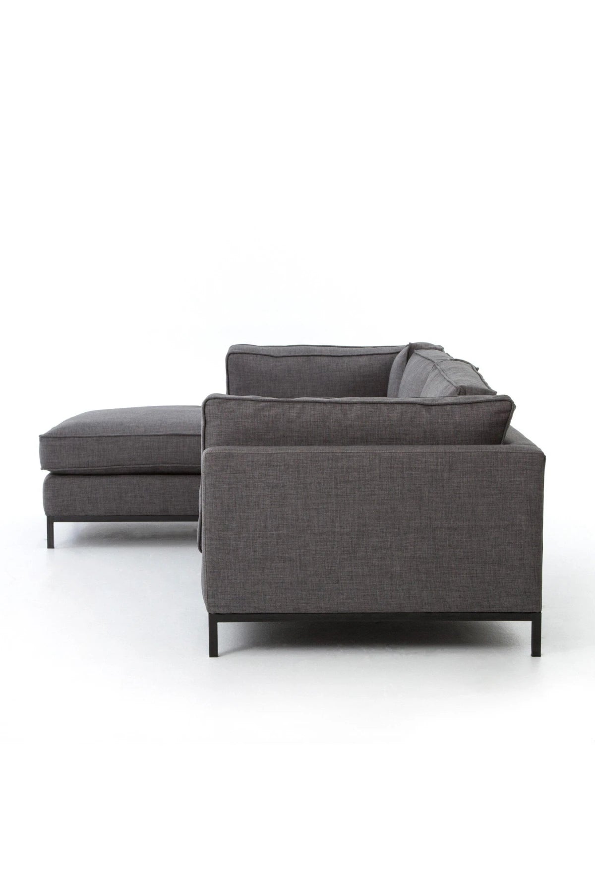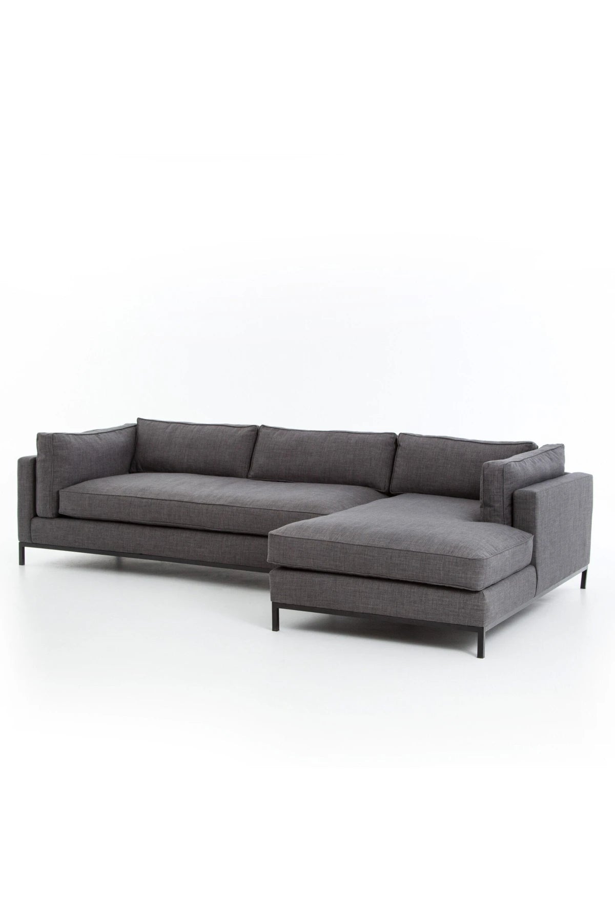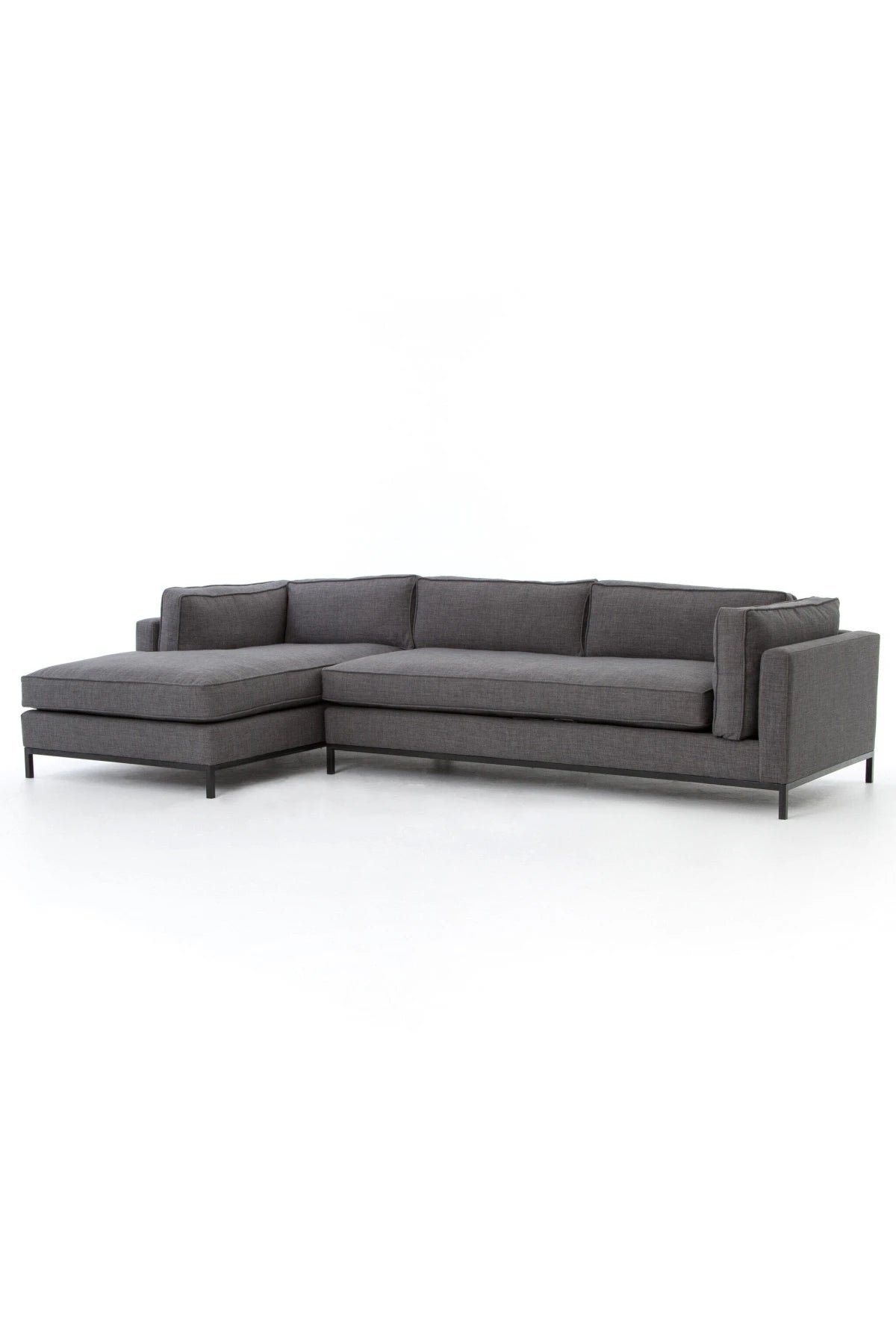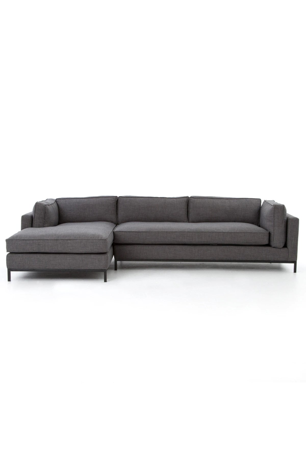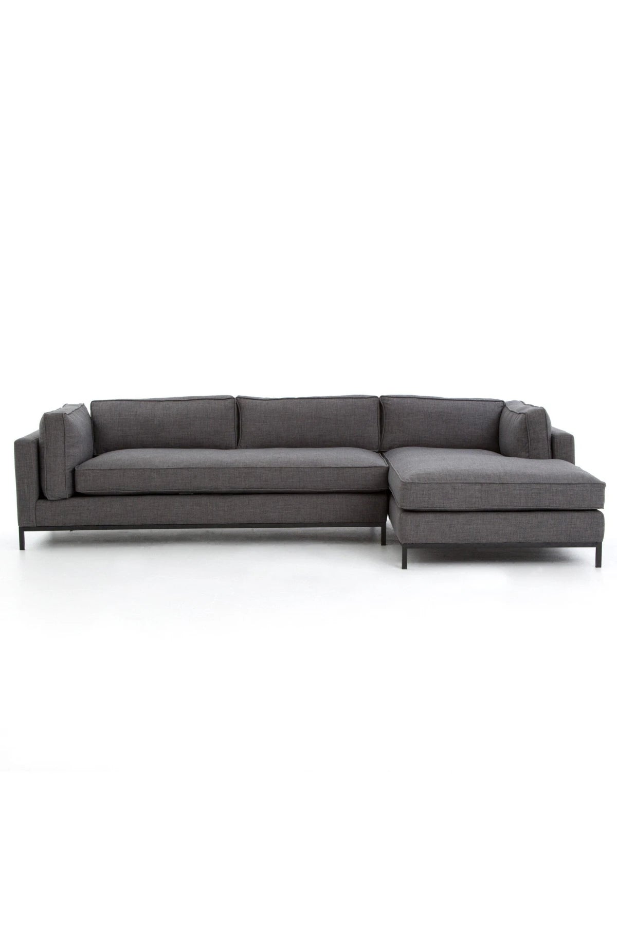 Meet the Grammercy 2-Piece Chaise Sectional. Flexible style, luxurious comfort and family-friendly upholstery. Clean, simple lines and a black iron base keep things casual and chic.