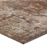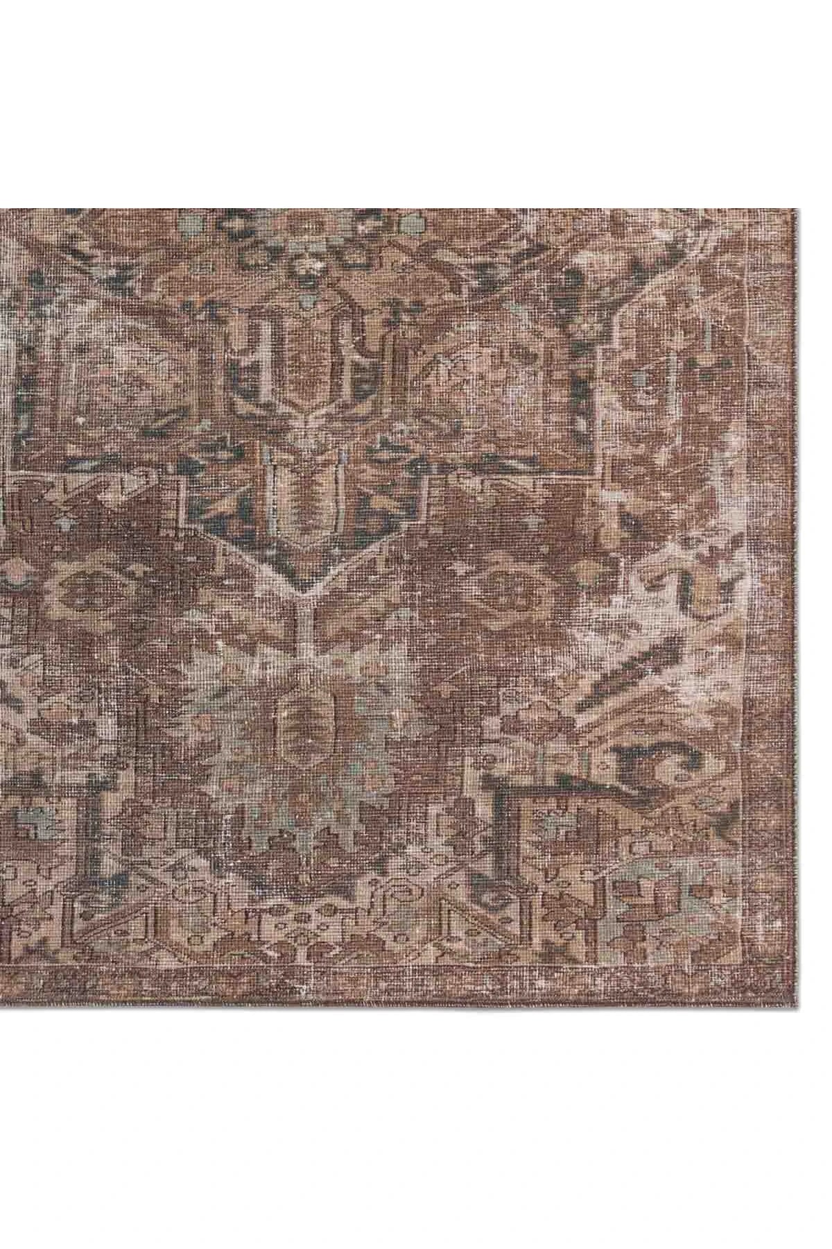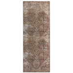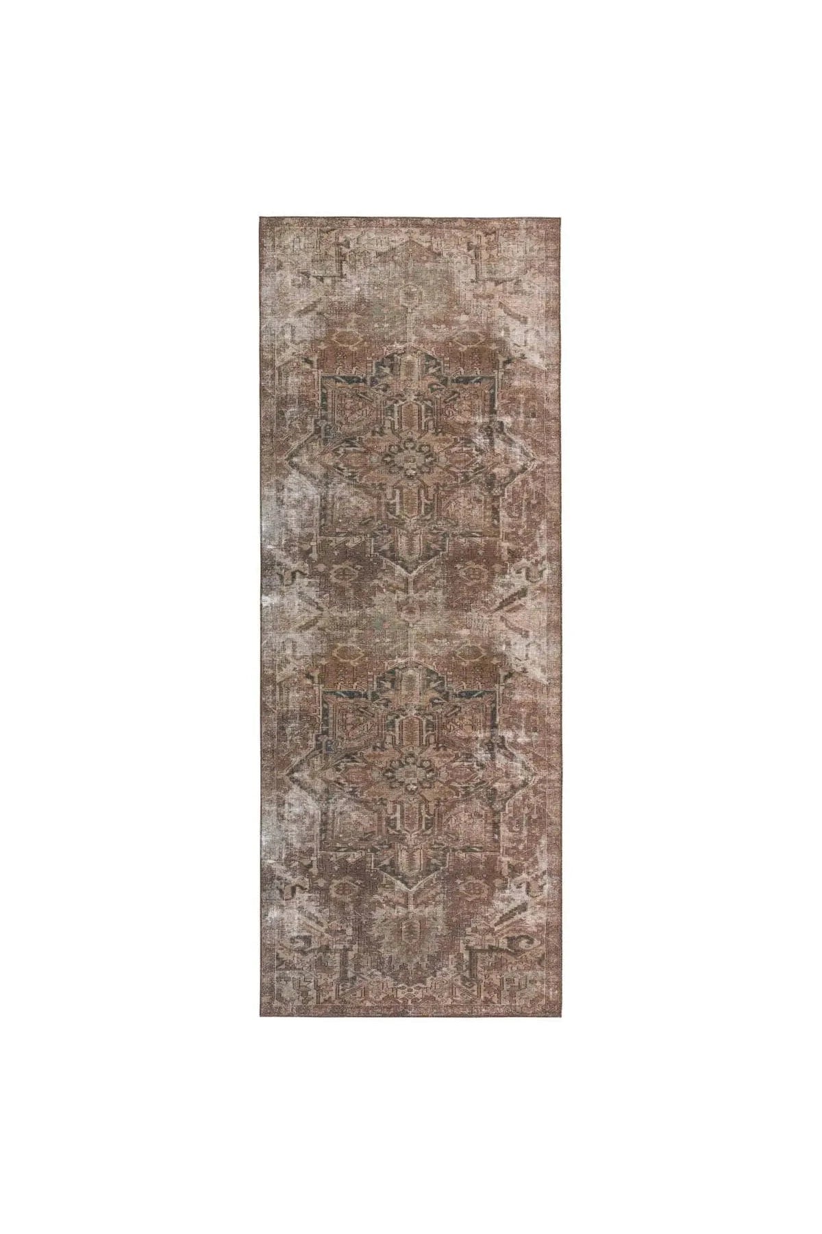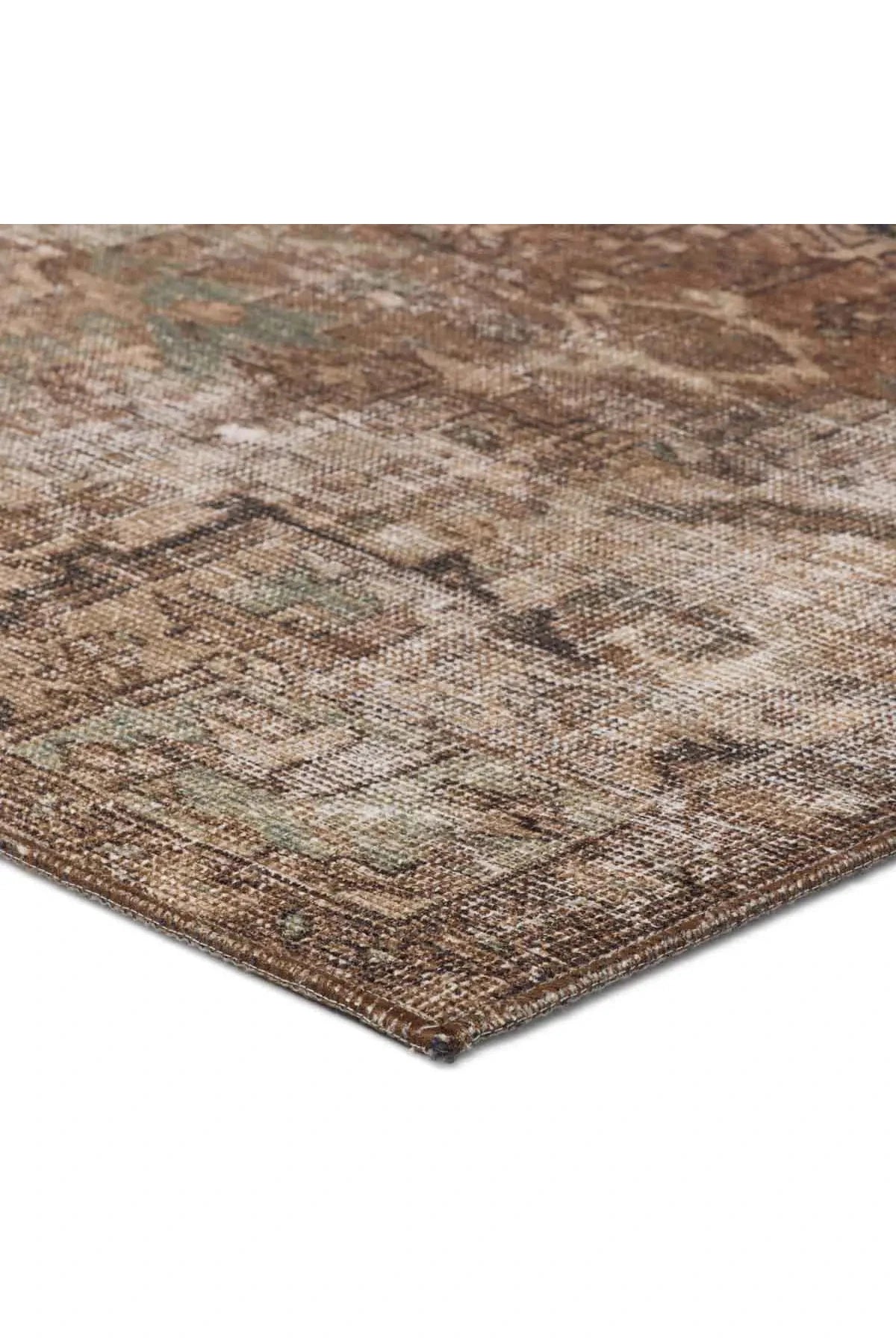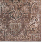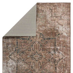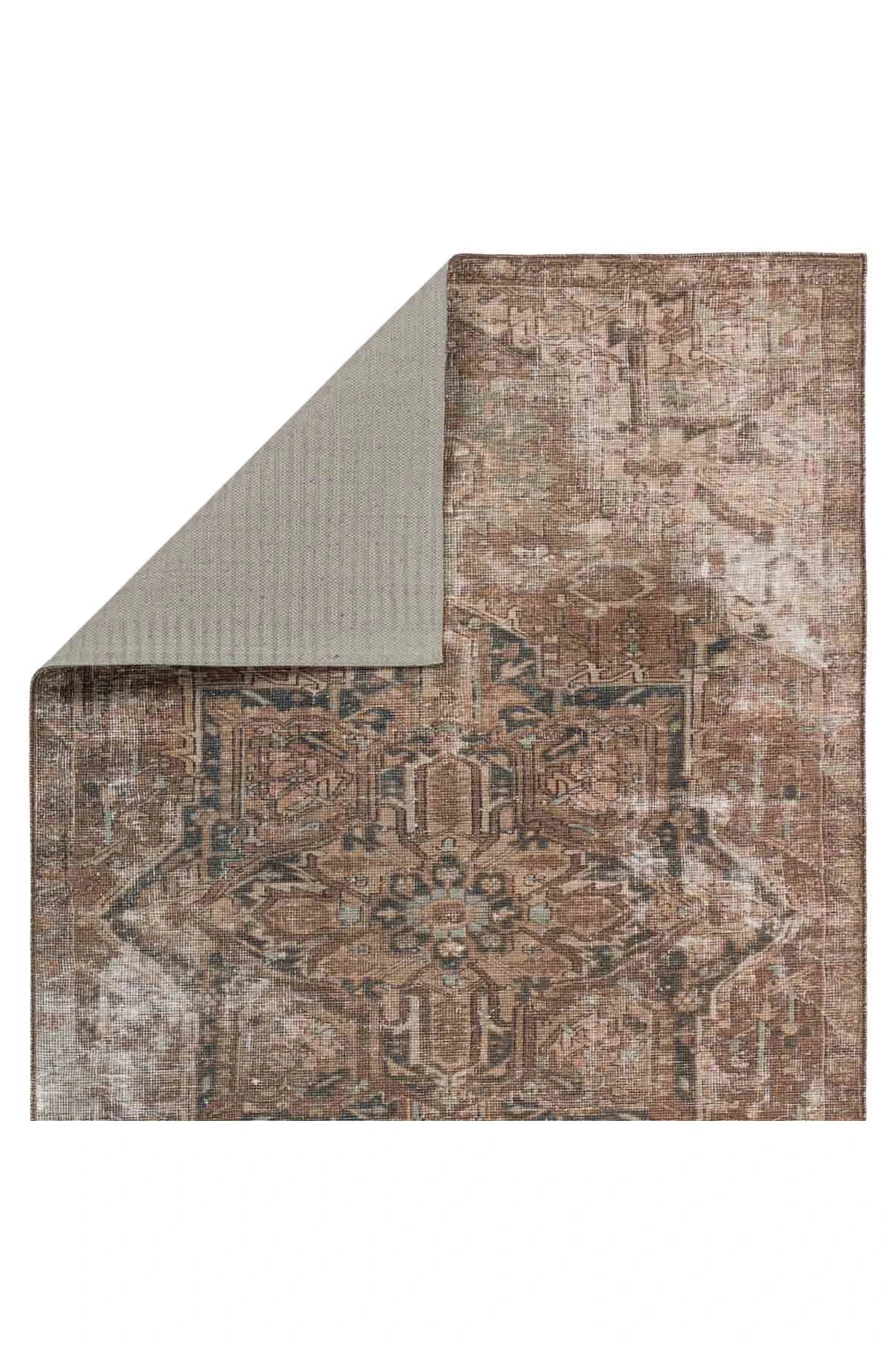 The Harman Hold Rug features a vintage-inspired faded medallion design in brown, tan, and blue tones. Its distressed look adds charm, while the traction backing makes it ideal for busy, hard floor areas like entryways, kitchens, and bathrooms. Samples are modeled at our North Scottsdale/Phoenix location.