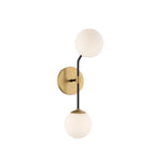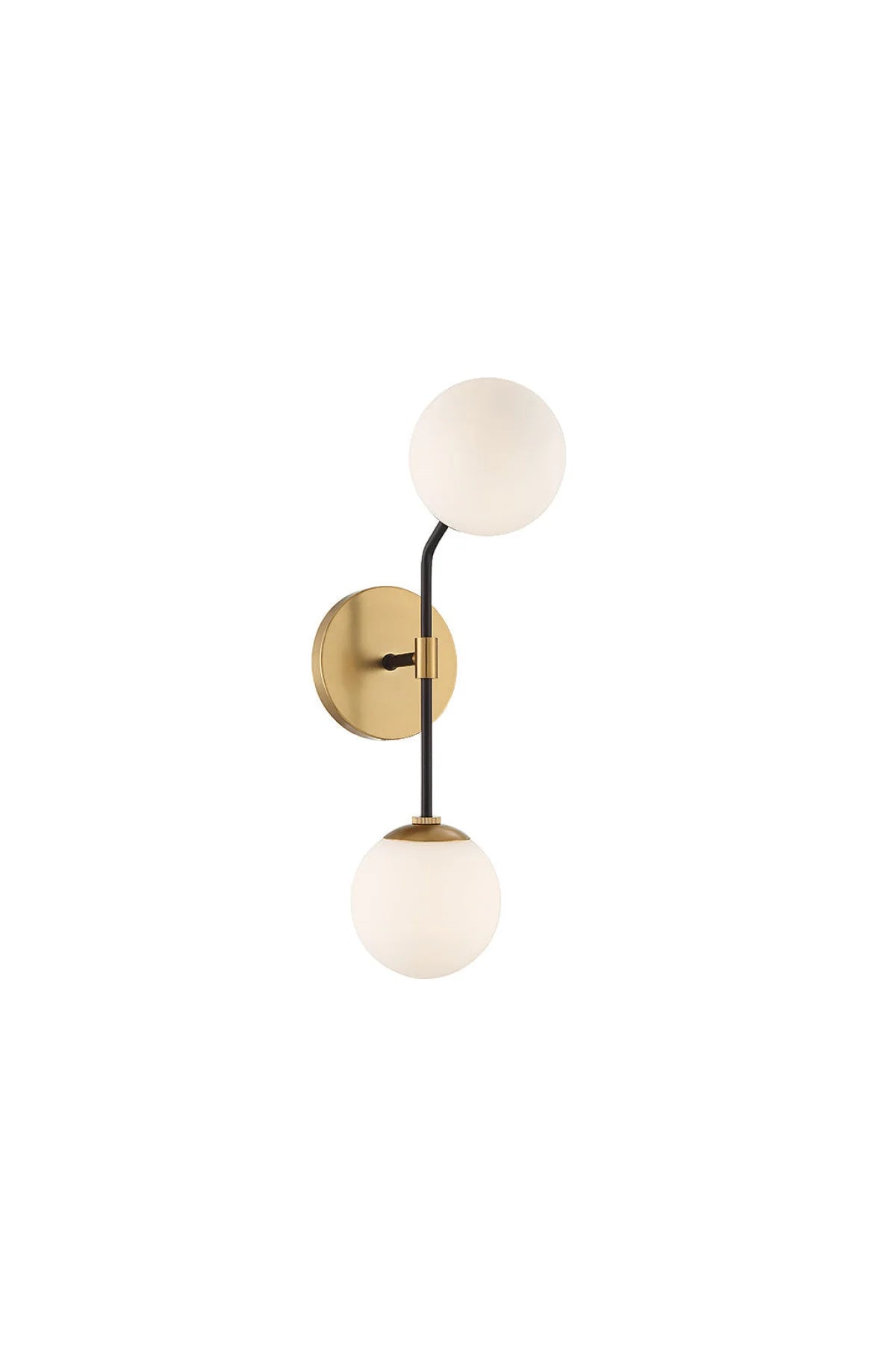 Meet the Harman Sconce. Find eye-catching midcentury modern style with this 2-light sconce. It features a stylish two-tone blend of Matte Black and Natural Brass finishes, paired with orbs of white opal glass. Bulb(s) not included.