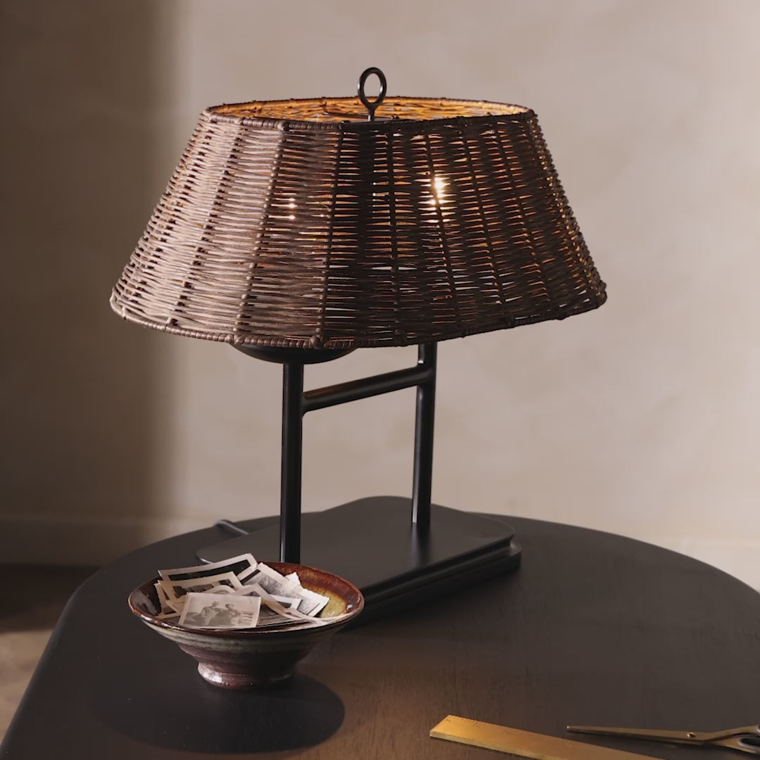 Meet the Harwick Table Lamp. Craft a warm vibe in any space with a texture-driven table lamp of brown-finished rattan. Black iron shapes a double-arm base with traditional ogee-edge detailing, while a pill-shaped woven shade lets light through to set just the right mood.