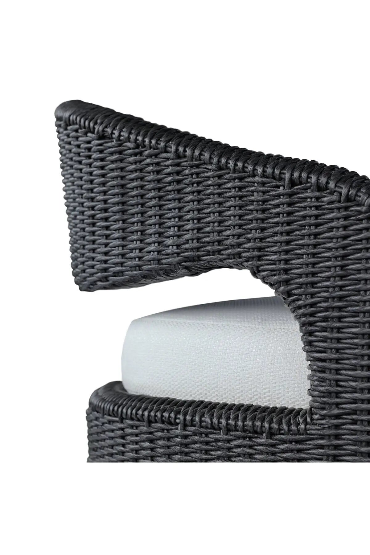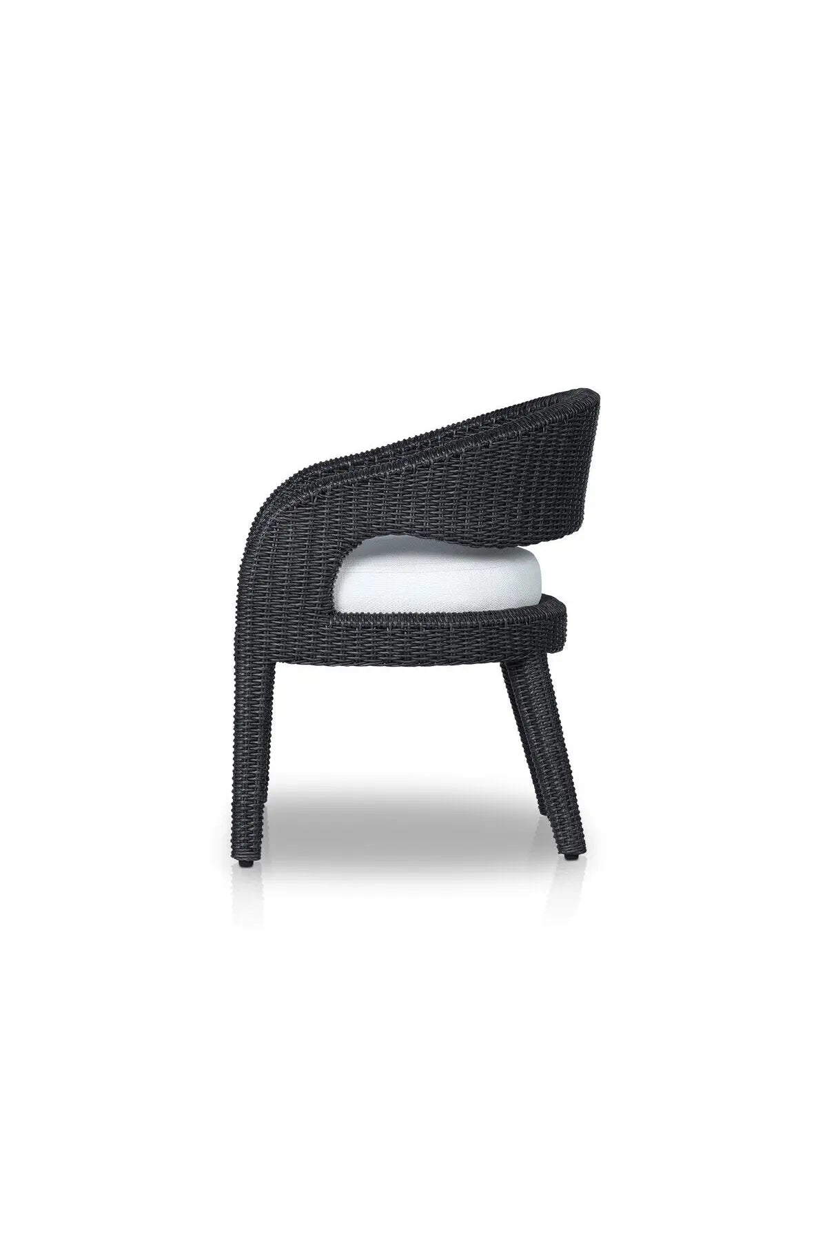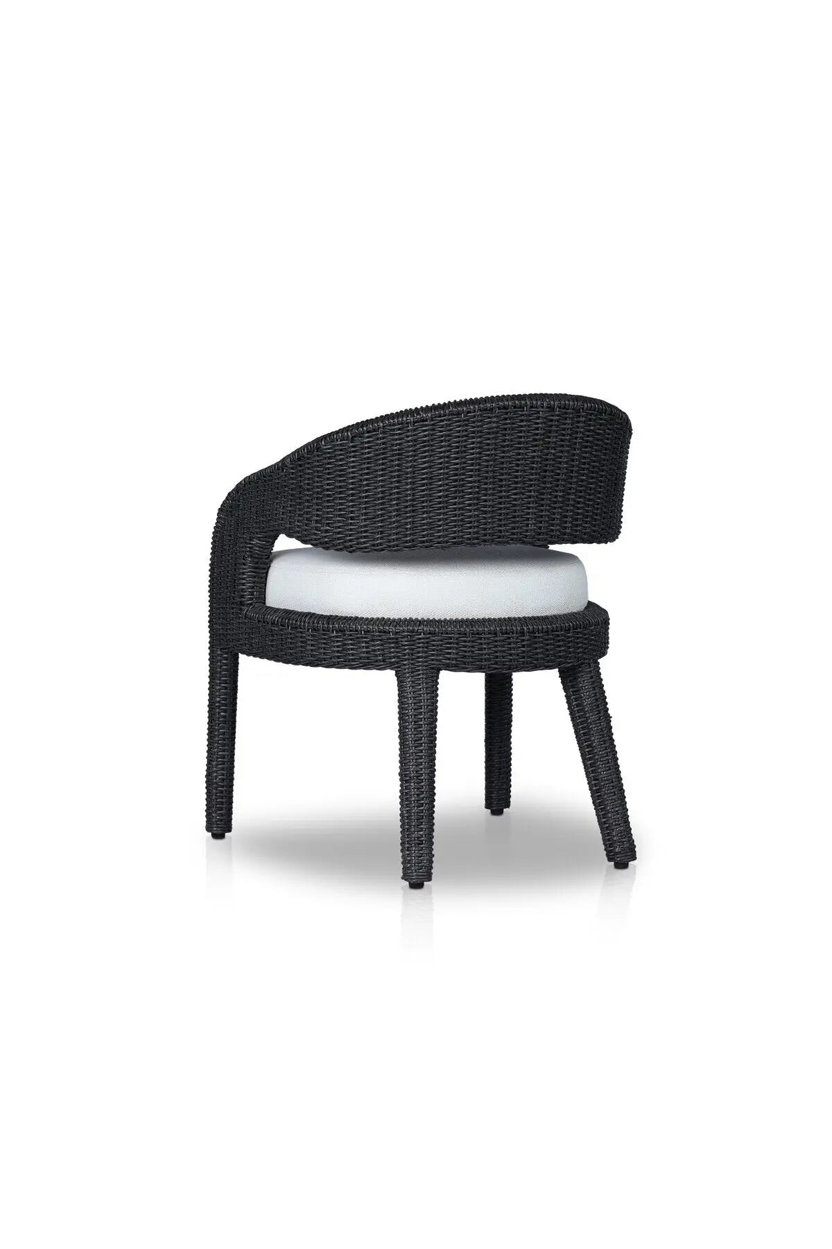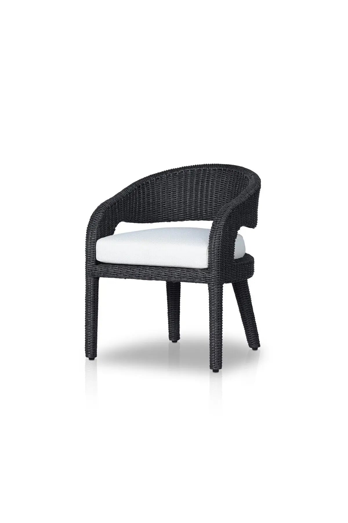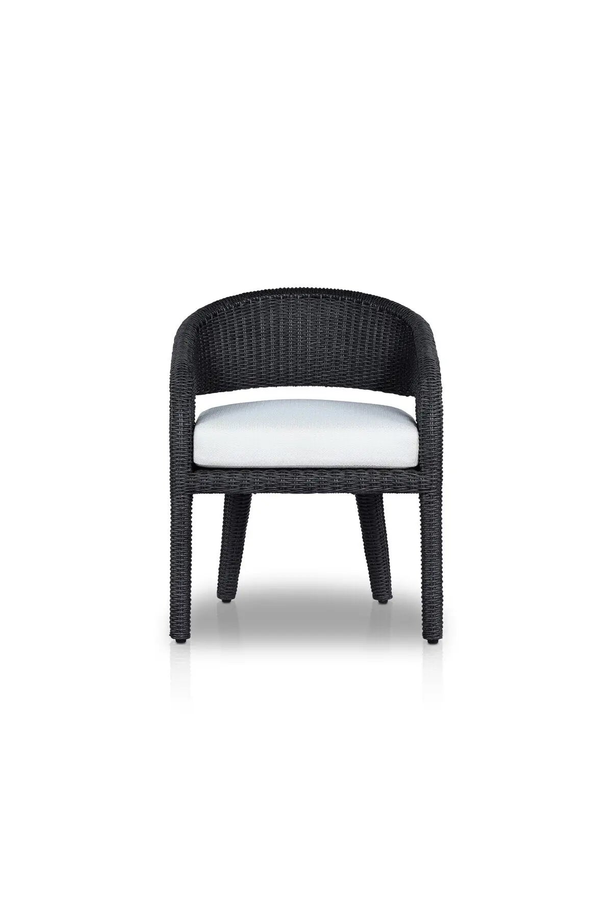 Meet the Hawkins Outdoor Dining Chair. This popular barrel-back shape with a cutout frame takes its place outdoors. Updated with a woven frame and a seat cushion in 100% olefin, known for its UV-resistant, water-repellent and quick-drying abilities.