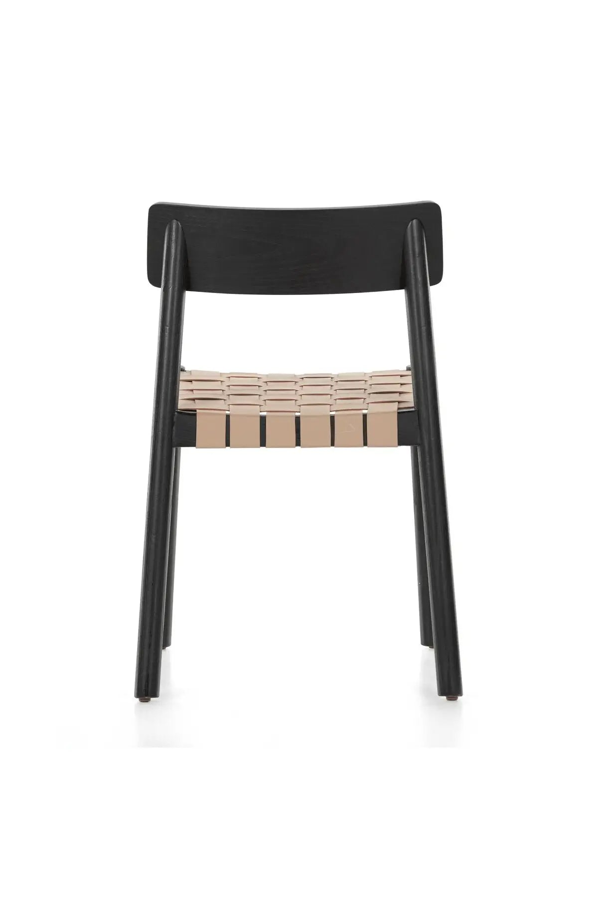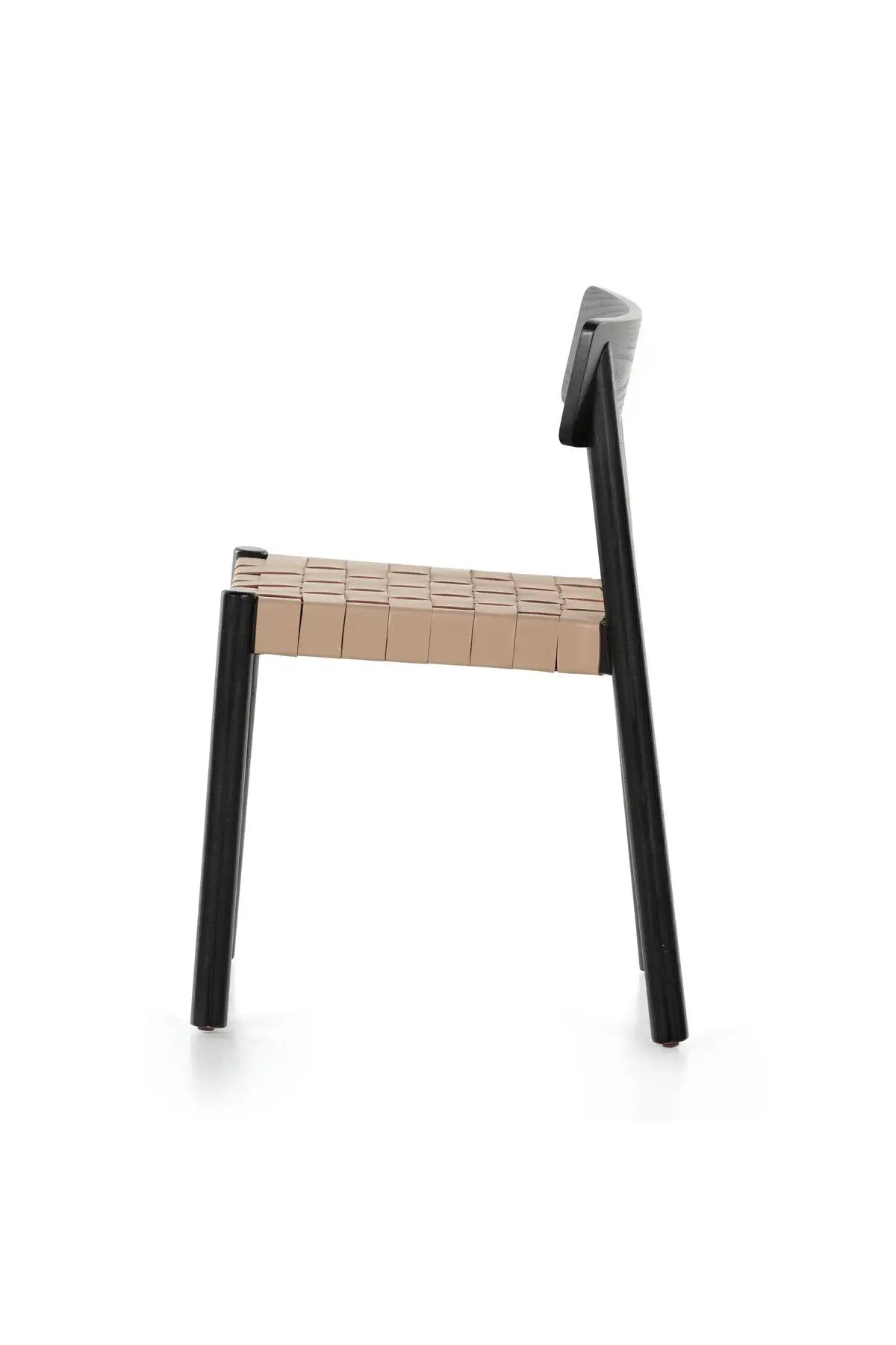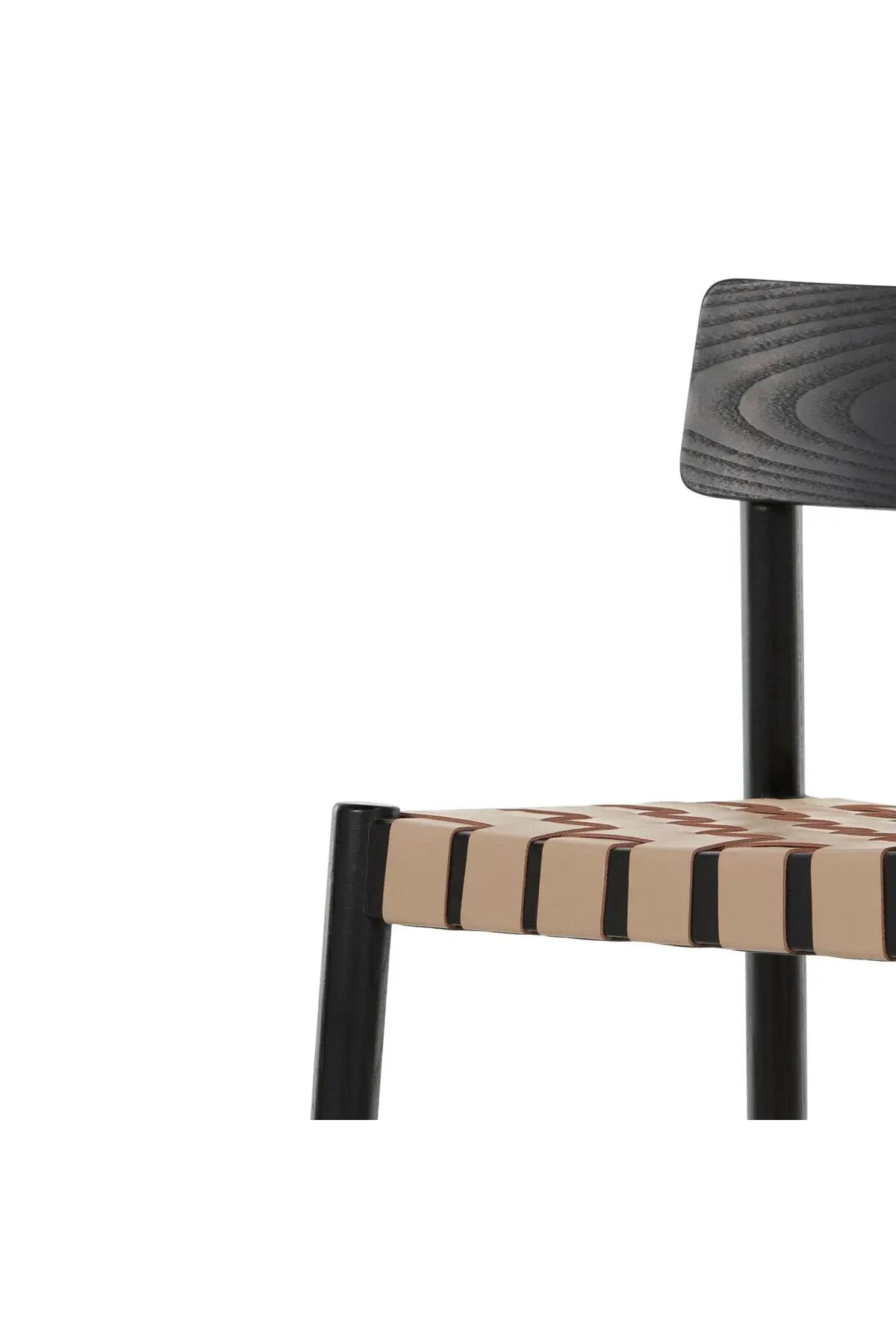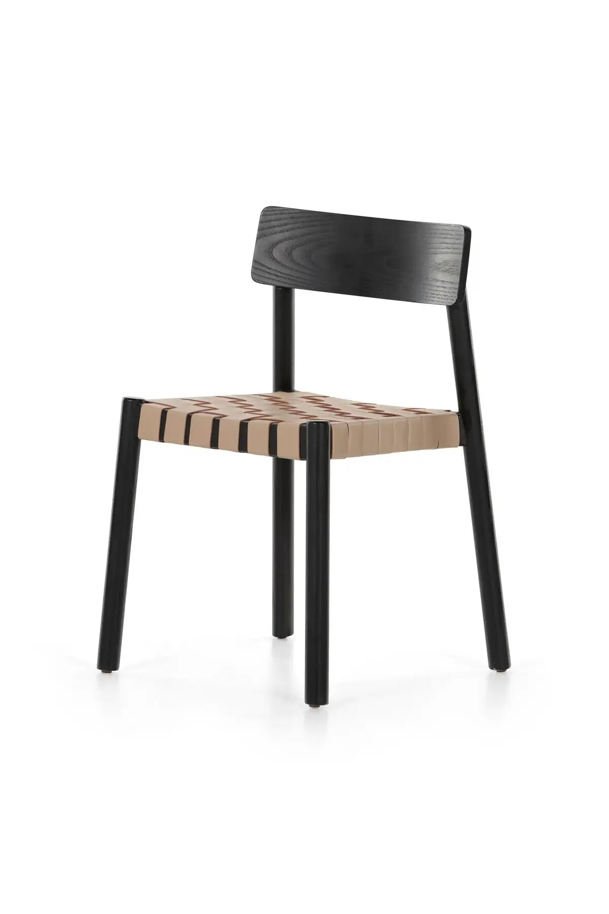 Meet the Heisler Dining Chair. Finished in a jet black, solid ash forms an airy, angular frame for woven leather seating in a cleverly contrasting tan.